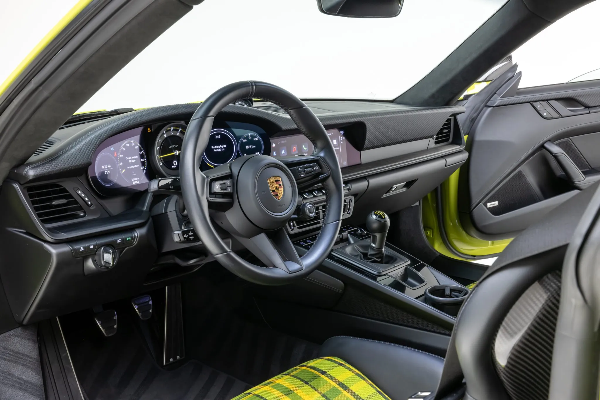 The car is further equipped with a mechanical limited-slip differential, black leather and plaid cloth upholstery, LED headlights, the Touring Package in Black, the Chrono Package, a speed-activated rear spoiler, rear-axle steering, 20″ and 21″ center-locking wheels, Porsche Ceramic Composite Brakes, a carbon-fiber roof, a front-axle lift system, carbon-fiber full bucket seats, a Bose sound system, Porsche Communication Management, automatic climate control, and cruise control.