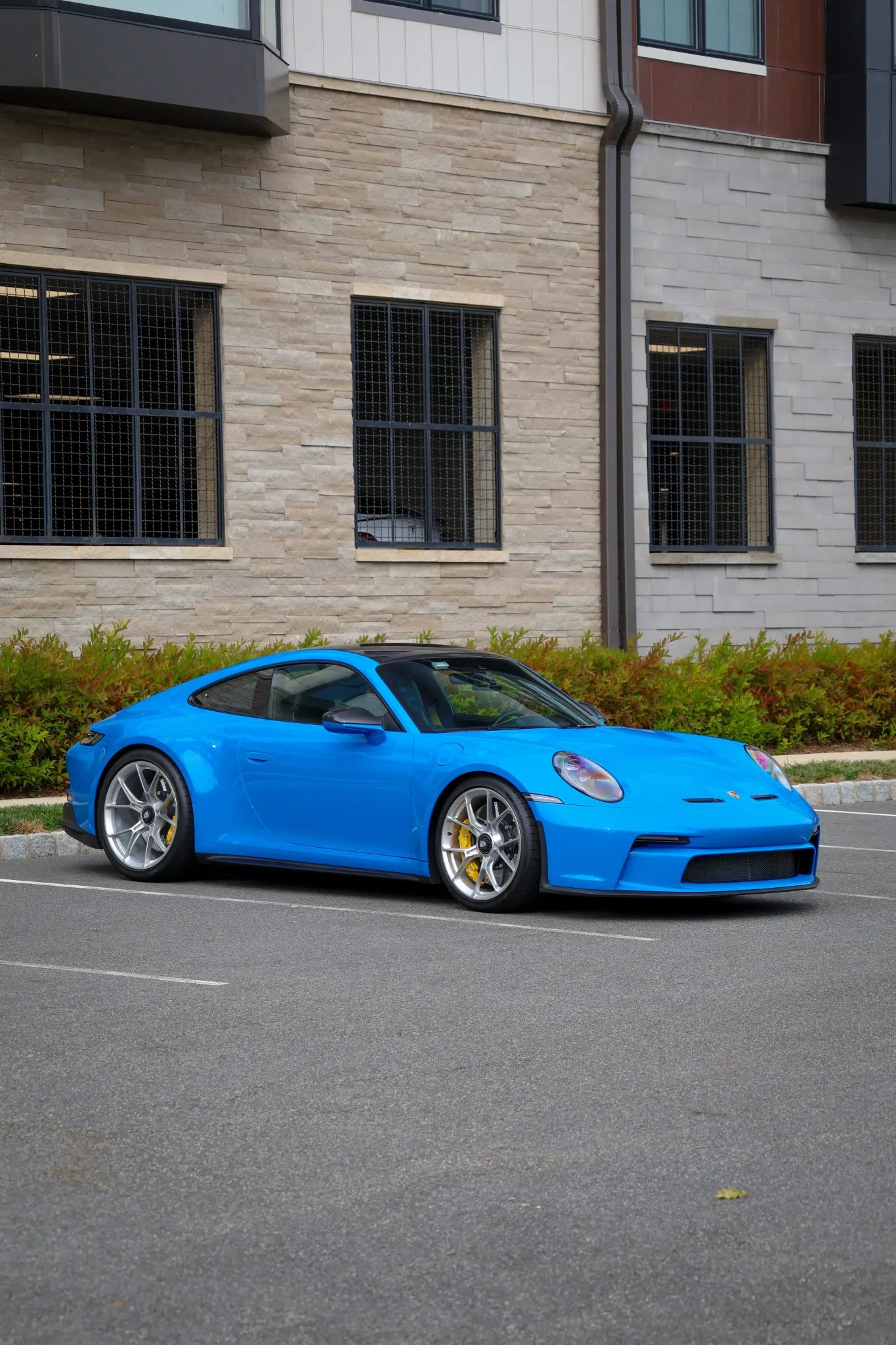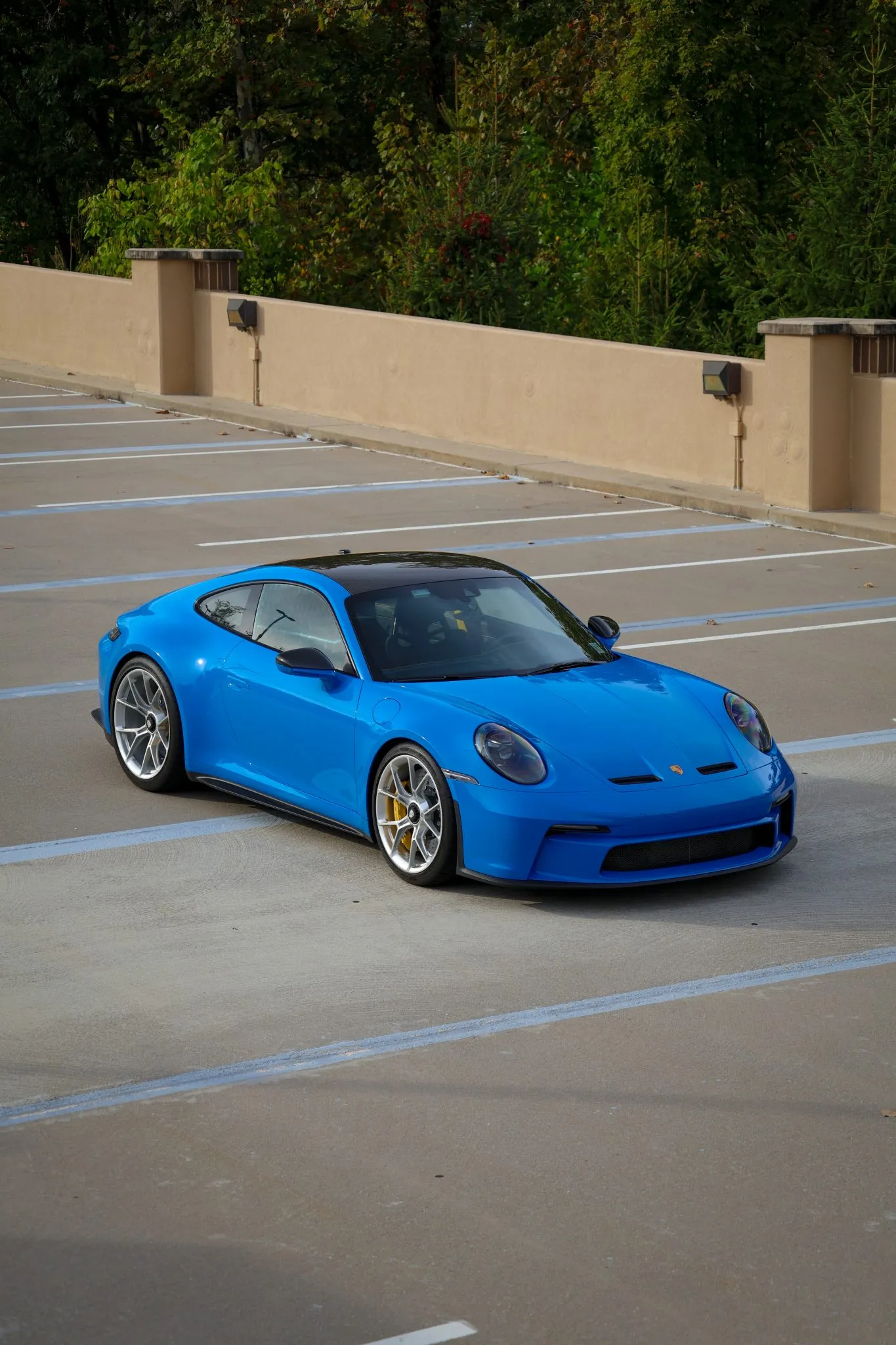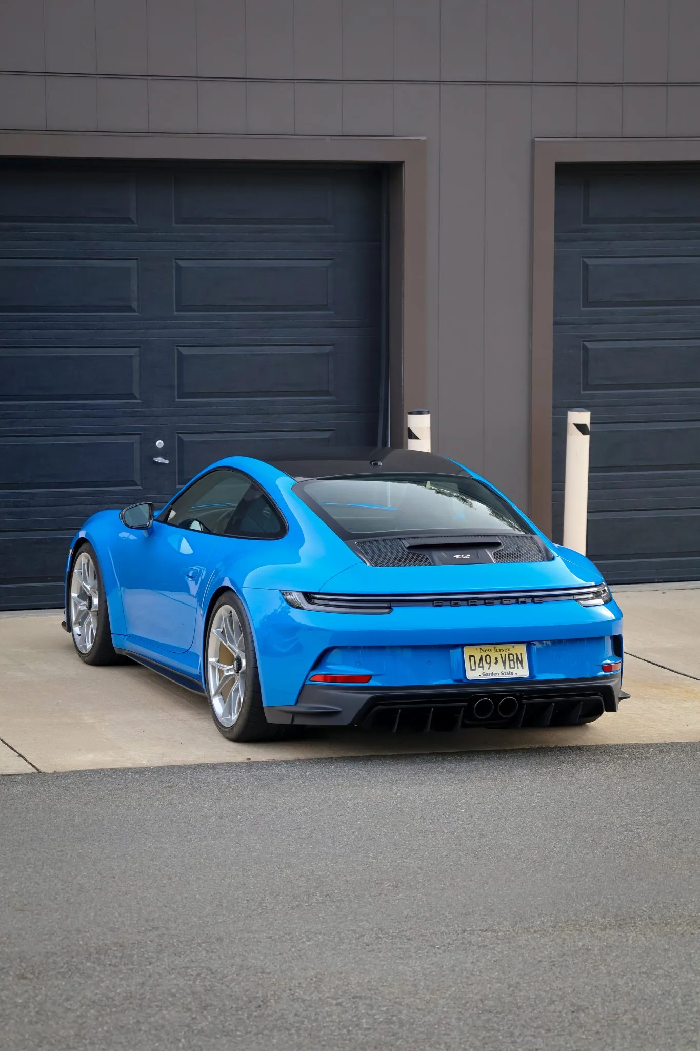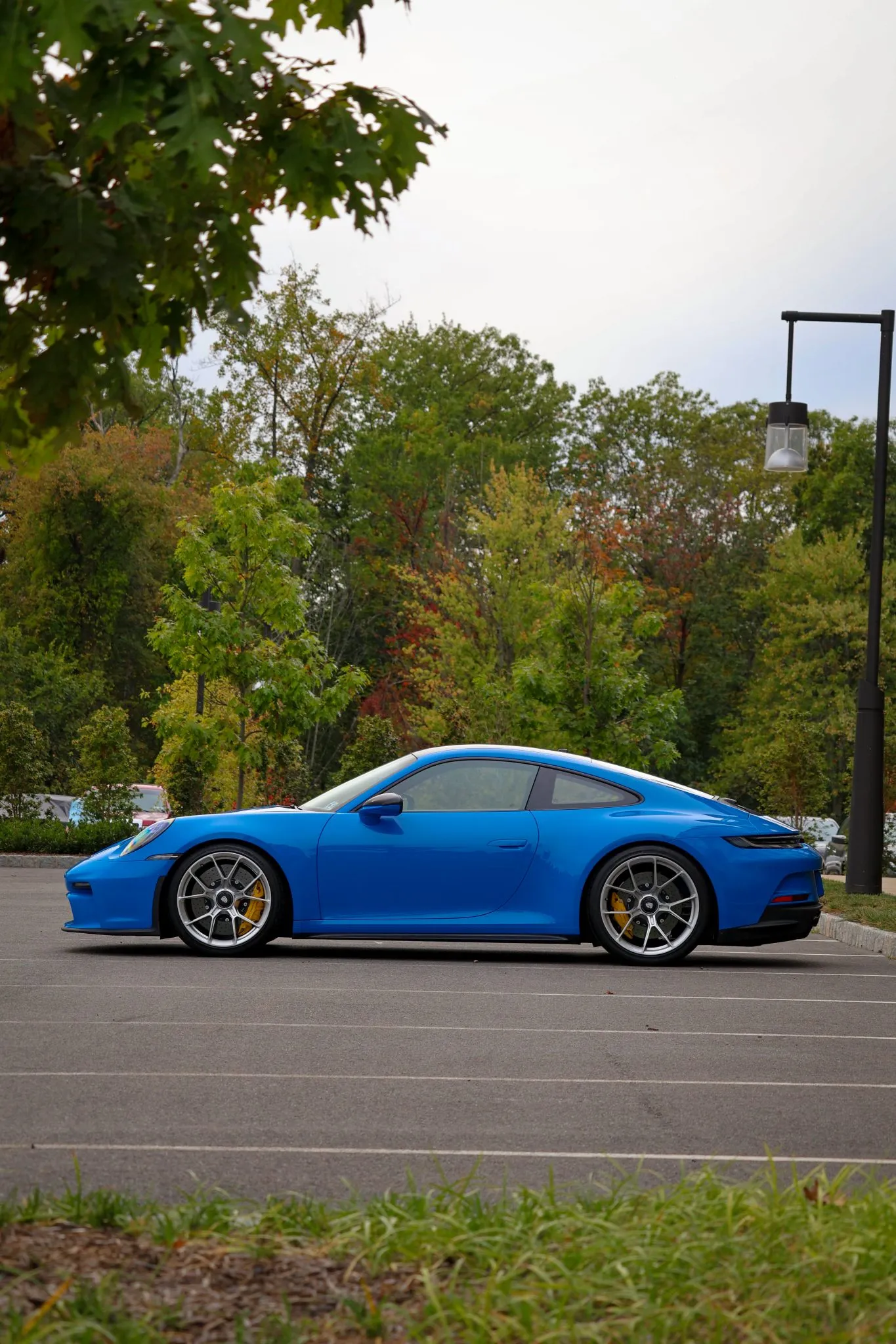 Finished in Shark Blue over black upholstery, the car is further equipped with a mechanical limited-slip differential, the Chrono package, a carbon-fiber roof, a front-axle lift system, LED-Matrix Design headlights with PDLS+, a speed-activated rear spoiler, rear-axle steering, 20″ and 21″ center-locking wheels, carbon-fiber full bucket seats, the Touring Package in Black, Porsche Communication Management, automatic climate control, a Bose sound system, and cruise control.