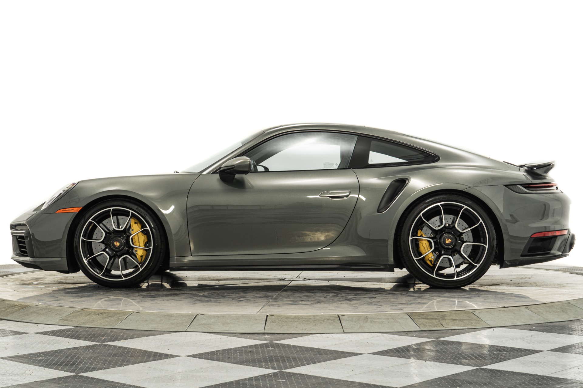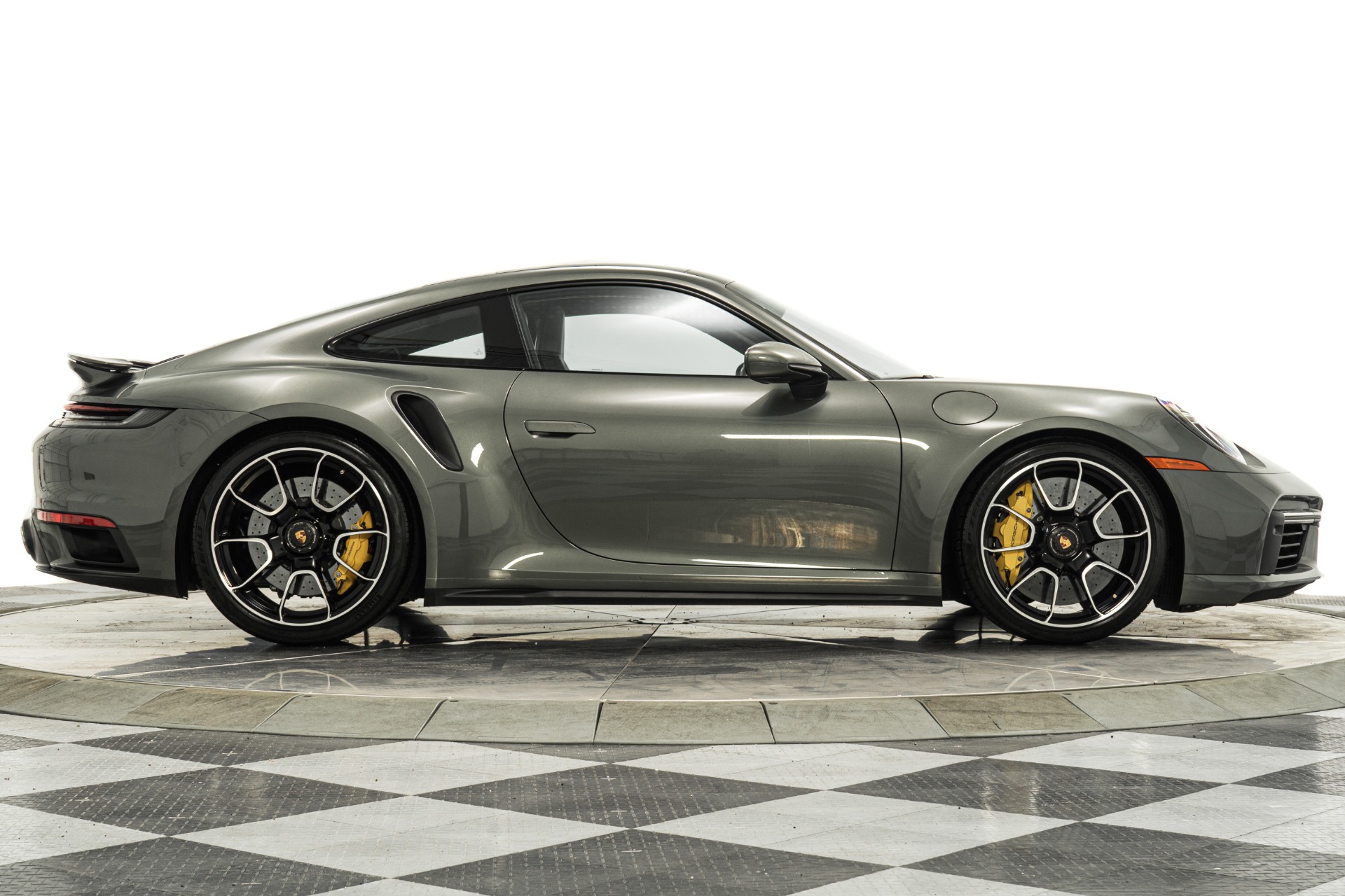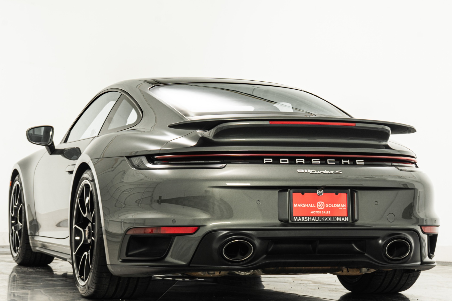 2022 Porsche 911 Turbo S in Adventurine Green Metallic over Agave Green leather interior and only 3,702 miles. This Turbo S is LOADED with: 3.8 liter flat six with 640 horsepower, PDK transmission, 20/21 inch Exclusive Design center lock wheels in gloss black with machined accents, carbon ceramic brakes with yellow calipers, sport exhaust with silver tailpipes, PASM sport suspension, front axle lift, club leather interior, matte carbon fiber interior trim, illuminated carbon fiber sill plates, deviating stitching package in white, seat belts in Agave Green, seat belt outlets in Race-Tex, sun visors in Race-Tex, leather vent slats and surround, leather steering column cover with deviating stitching, extended dash and door panel package in leather, electric tilt/slide sunroof in glass, personalized floor mats with metal Porsche logos and leather edging, ambient lighting, lane change assist, heated and ventilated 18 way adaptive sports seats plus, Bose surround sound system, rear camera and much more.