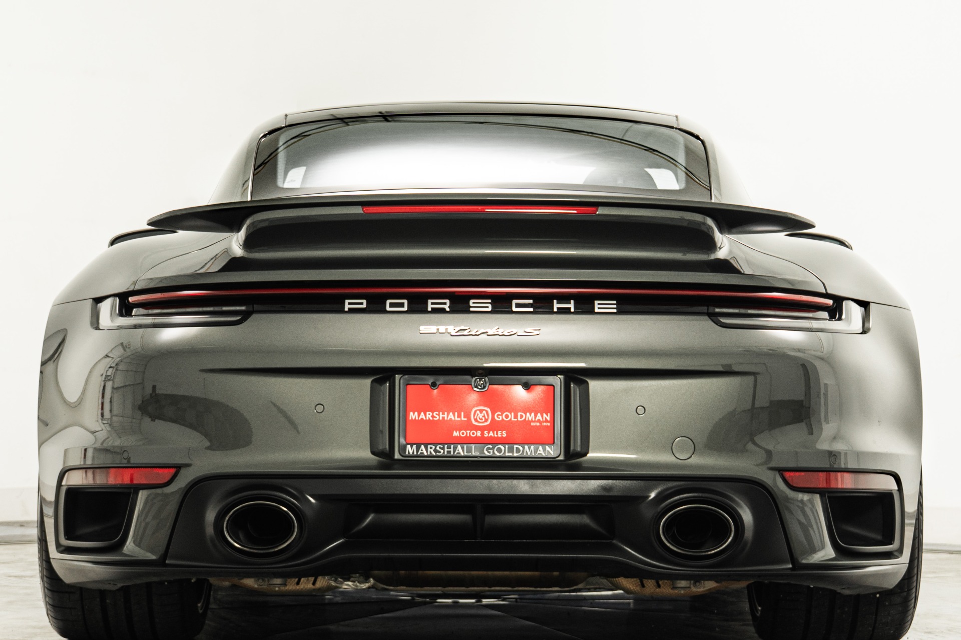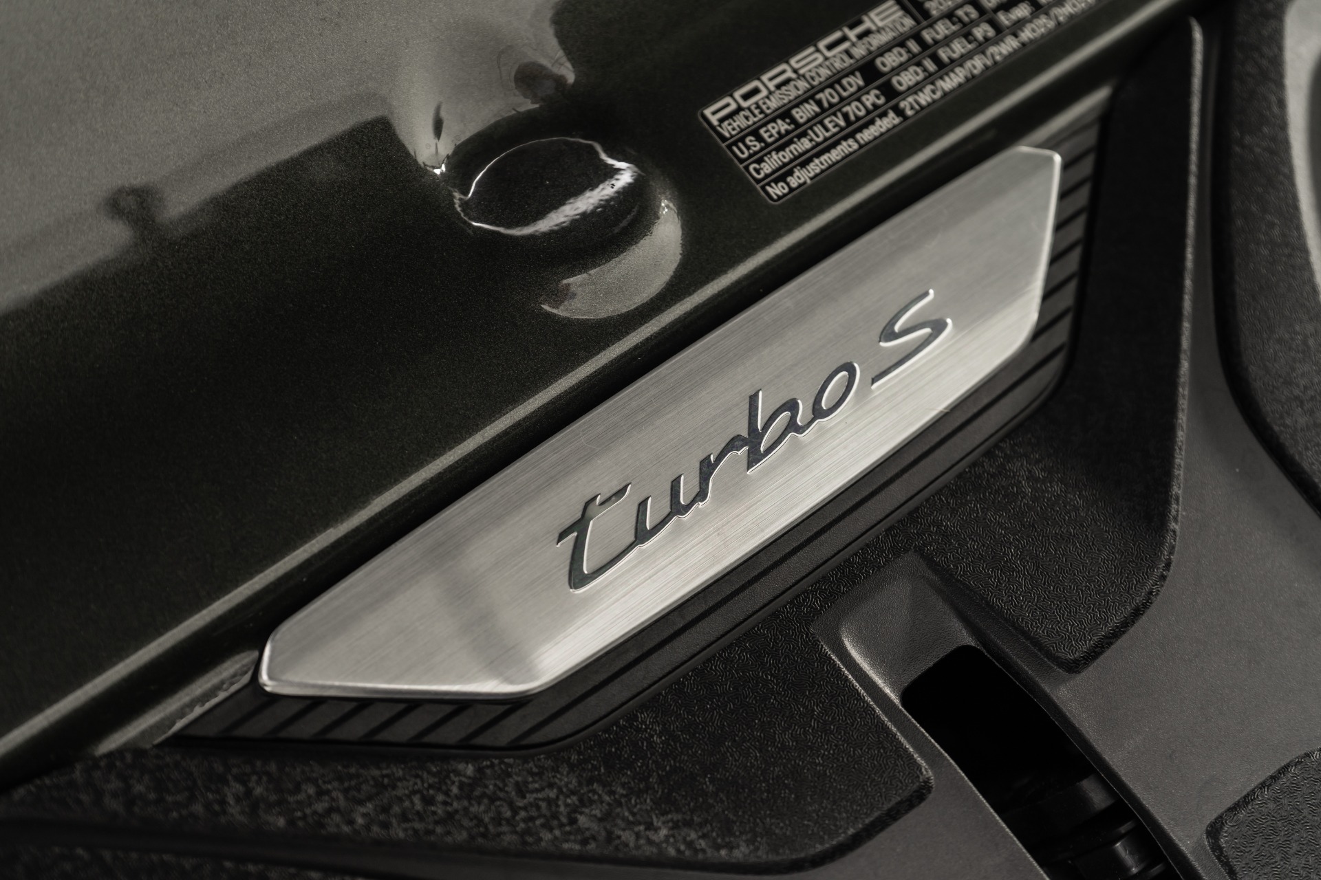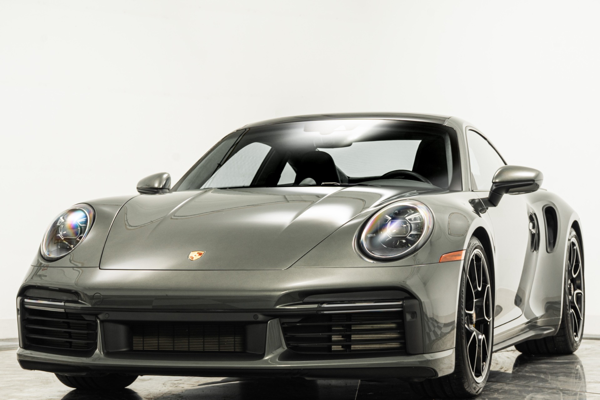 2022 Porsche 911 Turbo S in Adventurine Green Metallic over Agave Green leather interior and only 3,702 miles. This Turbo S is LOADED with: 3.8 liter flat six with 640 horsepower, PDK transmission, 20/21 inch Exclusive Design center lock wheels in gloss black with machined accents, carbon ceramic brakes with yellow calipers, sport exhaust with silver tailpipes, PASM sport suspension, front axle lift, club leather interior, matte carbon fiber interior trim, illuminated carbon fiber sill plates, deviating stitching package in white, seat belts in Agave Green, seat belt outlets in Race-Tex, sun visors in Race-Tex, leather vent slats and surround, leather steering column cover with deviating stitching, extended dash and door panel package in leather, electric tilt/slide sunroof in glass, personalized floor mats with metal Porsche logos and leather edging, ambient lighting, lane change assist, heated and ventilated 18 way adaptive sports seats plus, Bose surround sound system, rear camera and much more.