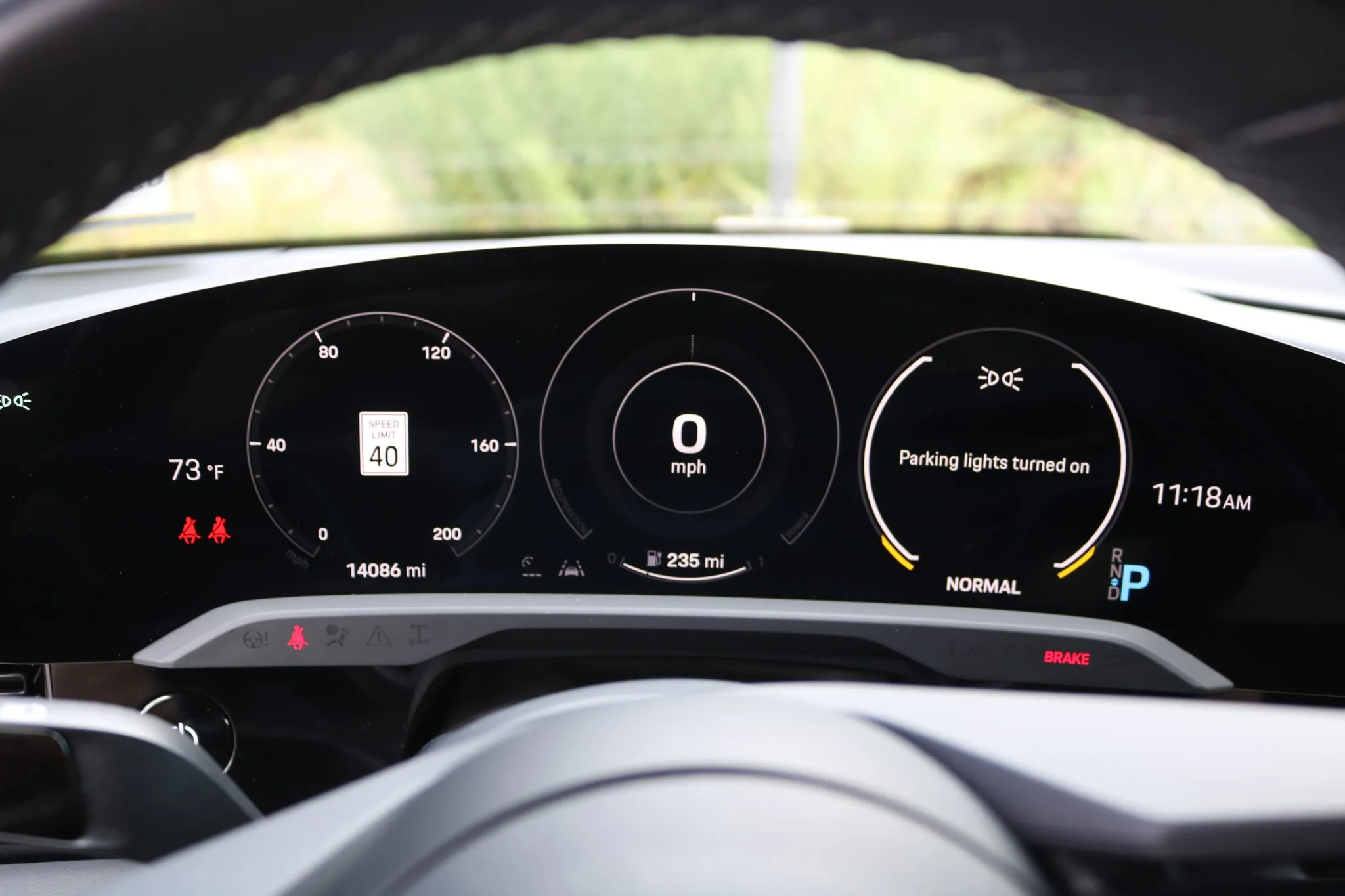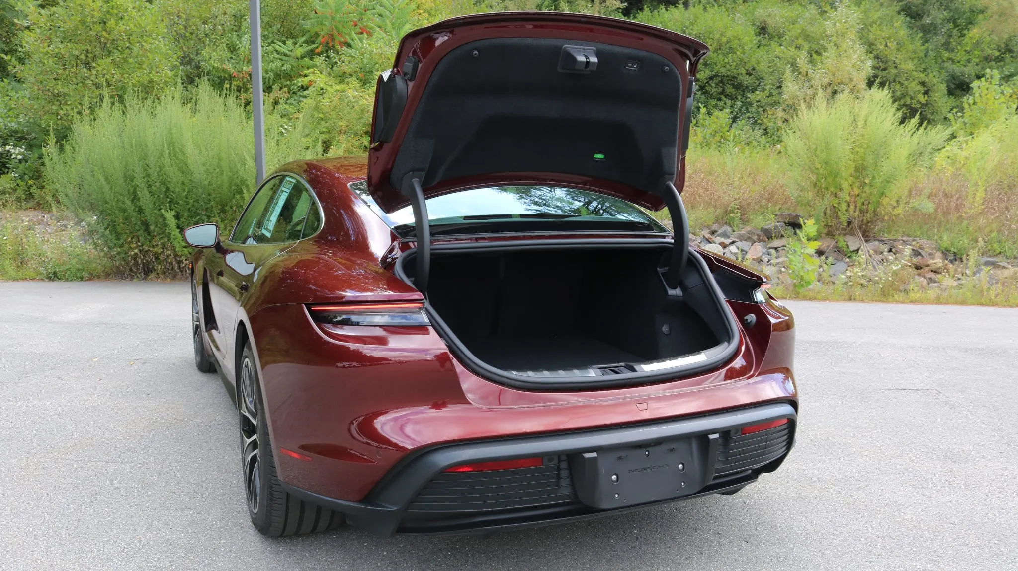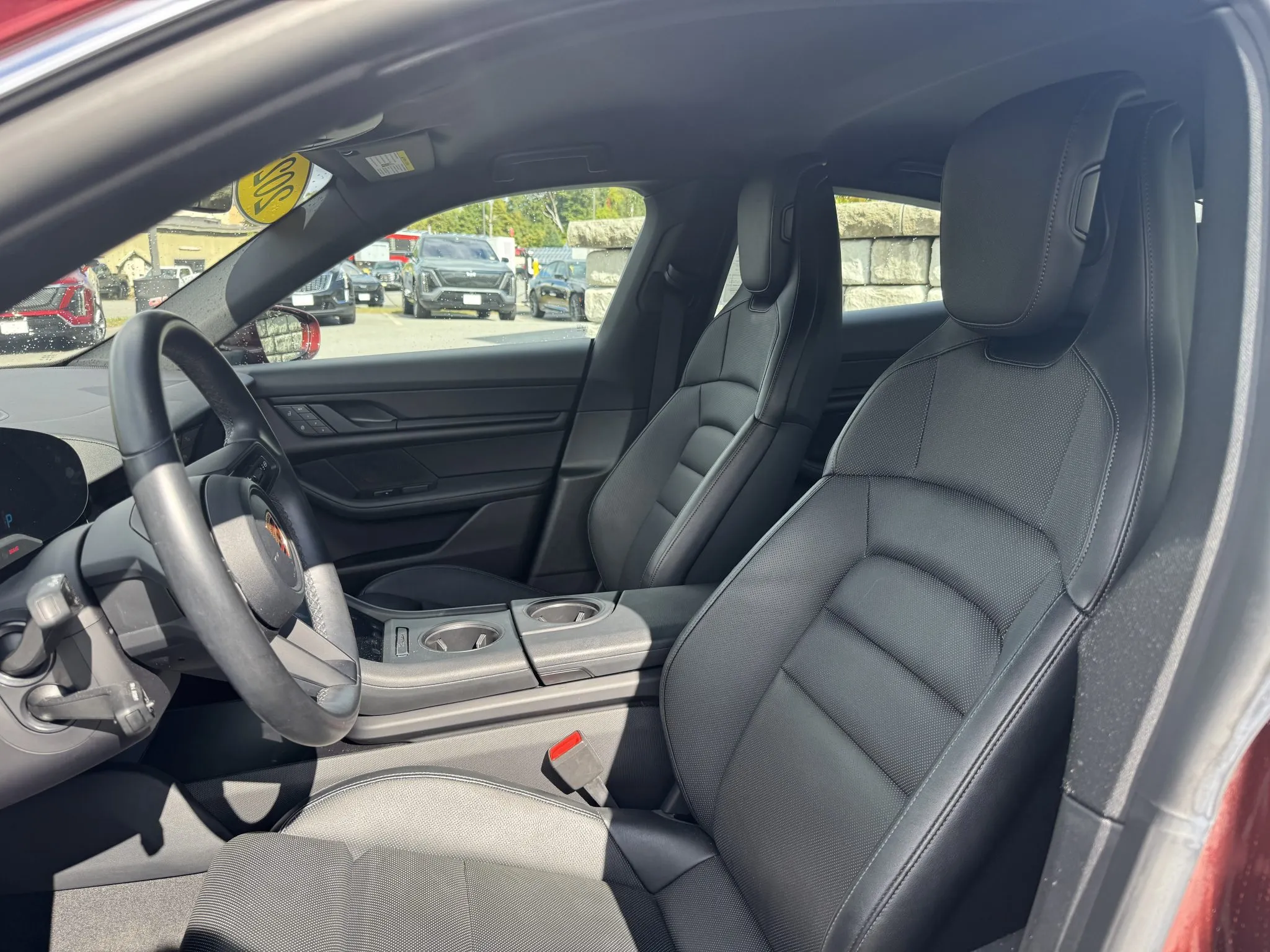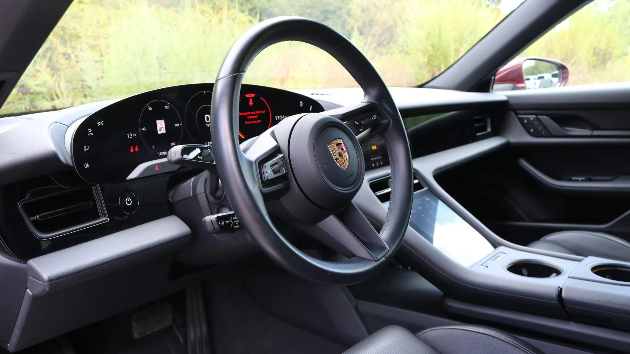 Equipment includes a 93.4-kWh lithium-ion battery pack, 20″ Taycan Turbo Aero wheels, heated and ventilated front seats, heated rear seats, adaptive cruise control, and multi-zone automatic climate control.