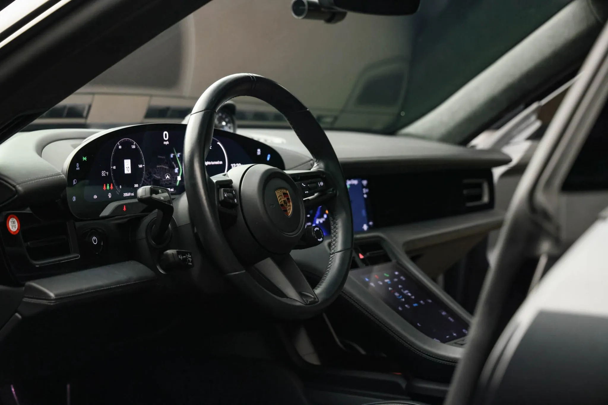 Equipment includes the Sport Chrono Package, a 93.4-kWh lithium-ion battery pack, 21″ RS Spyder Design wheels, heated and ventilated power-adjustable front seats, a Bose sound system, a surround-view camera system, front and rear parking sensors, navigation, and multi-zone automatic climate control.