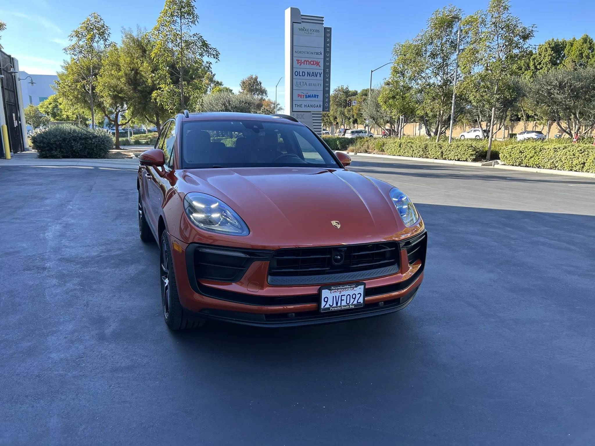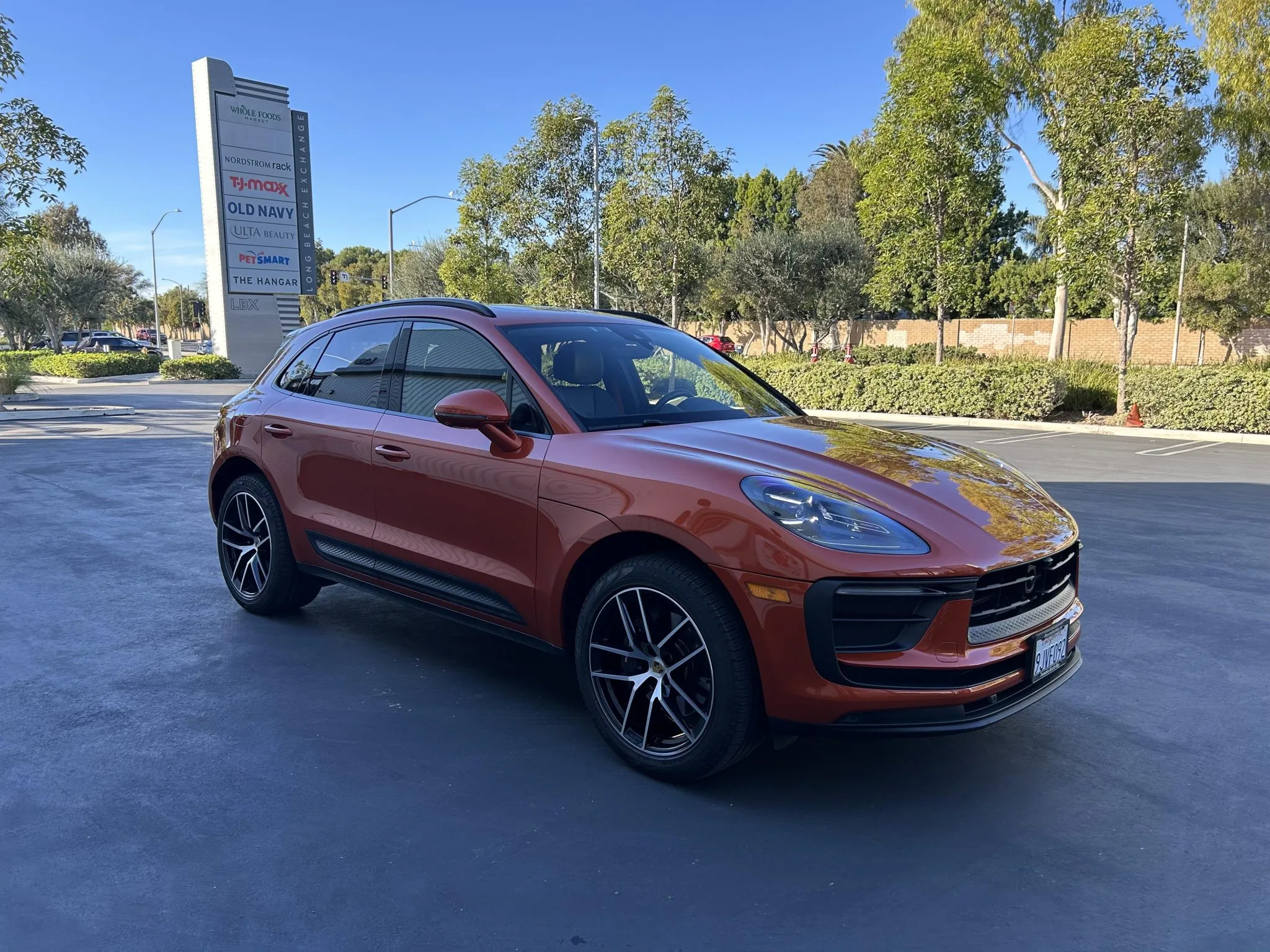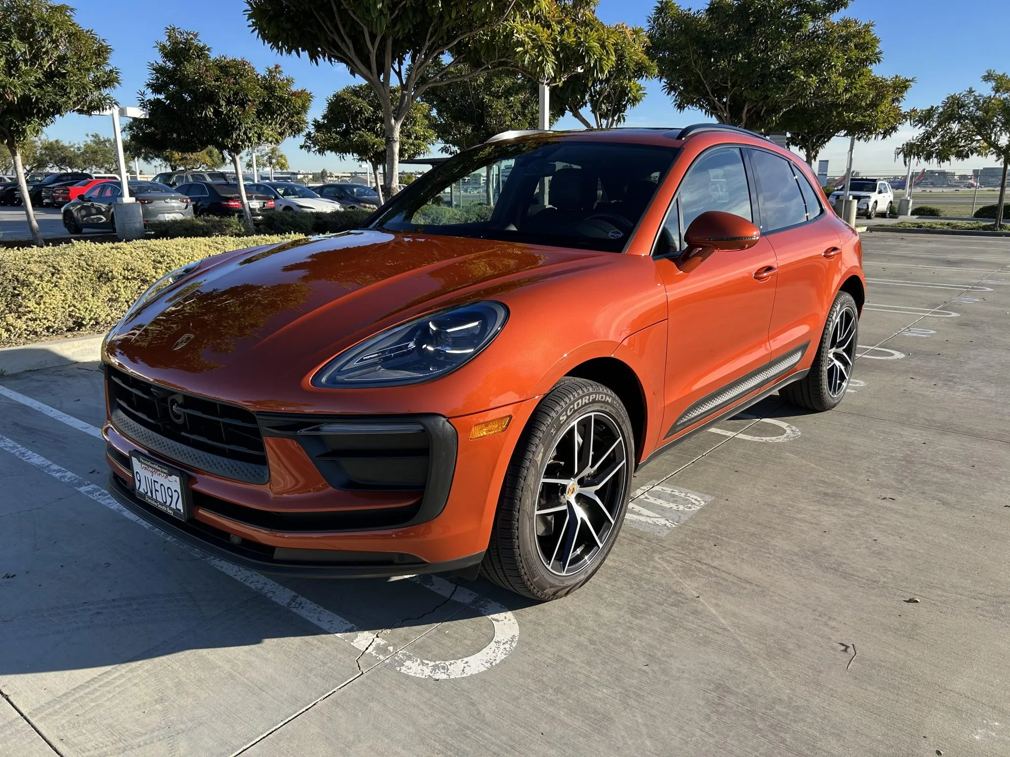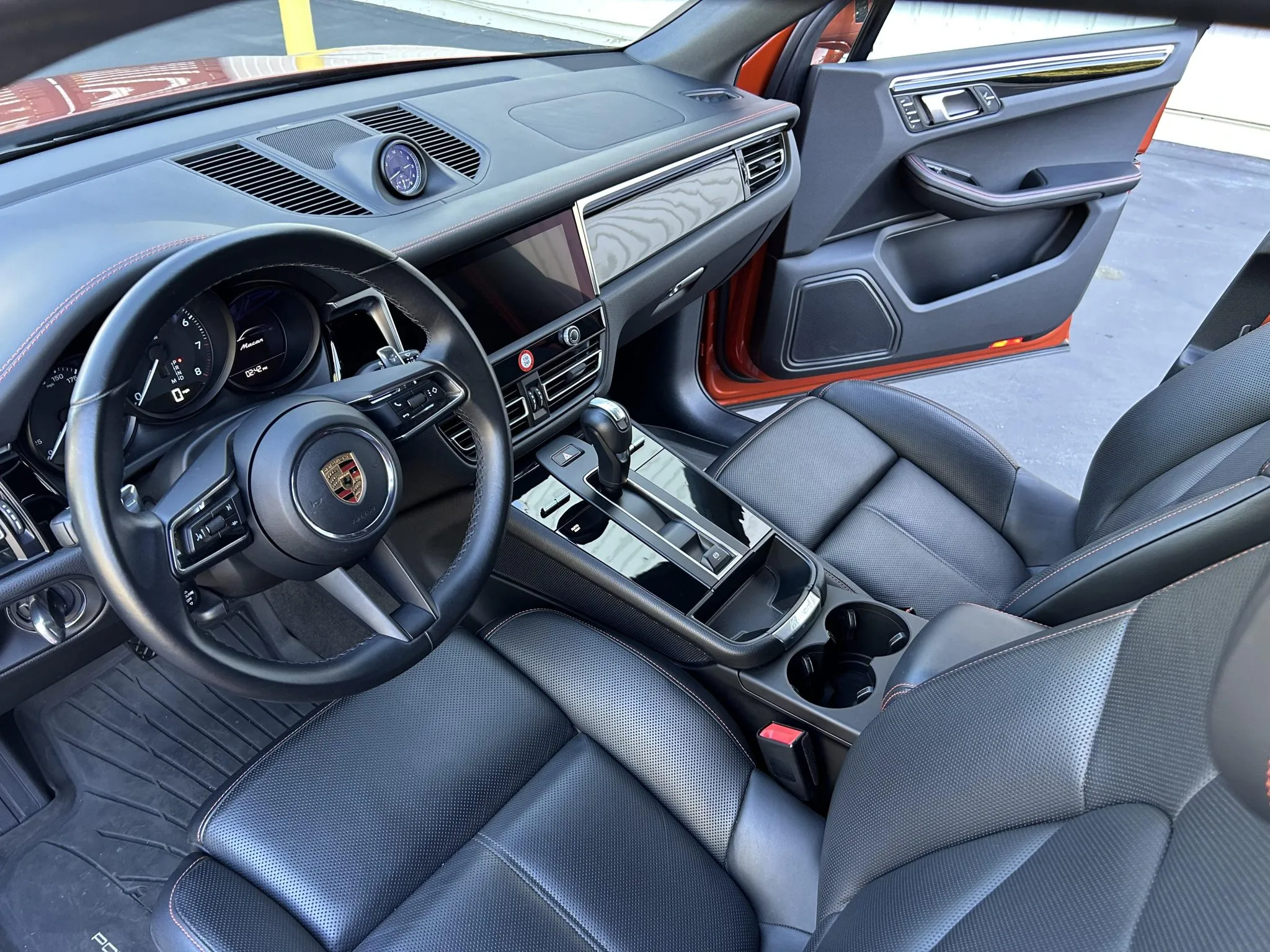 This 2023 Porsche Macan is finished in Papaya Metallic over Black leather with Papaya stitching, and it was ordered with the Premium Plus and Leather packages as well as a panoramic sunroof, 20″ Macan S wheels, heated and ventilated front seats, a surround-view camera, adaptive cruise control, and LED headlights with PDLS+.