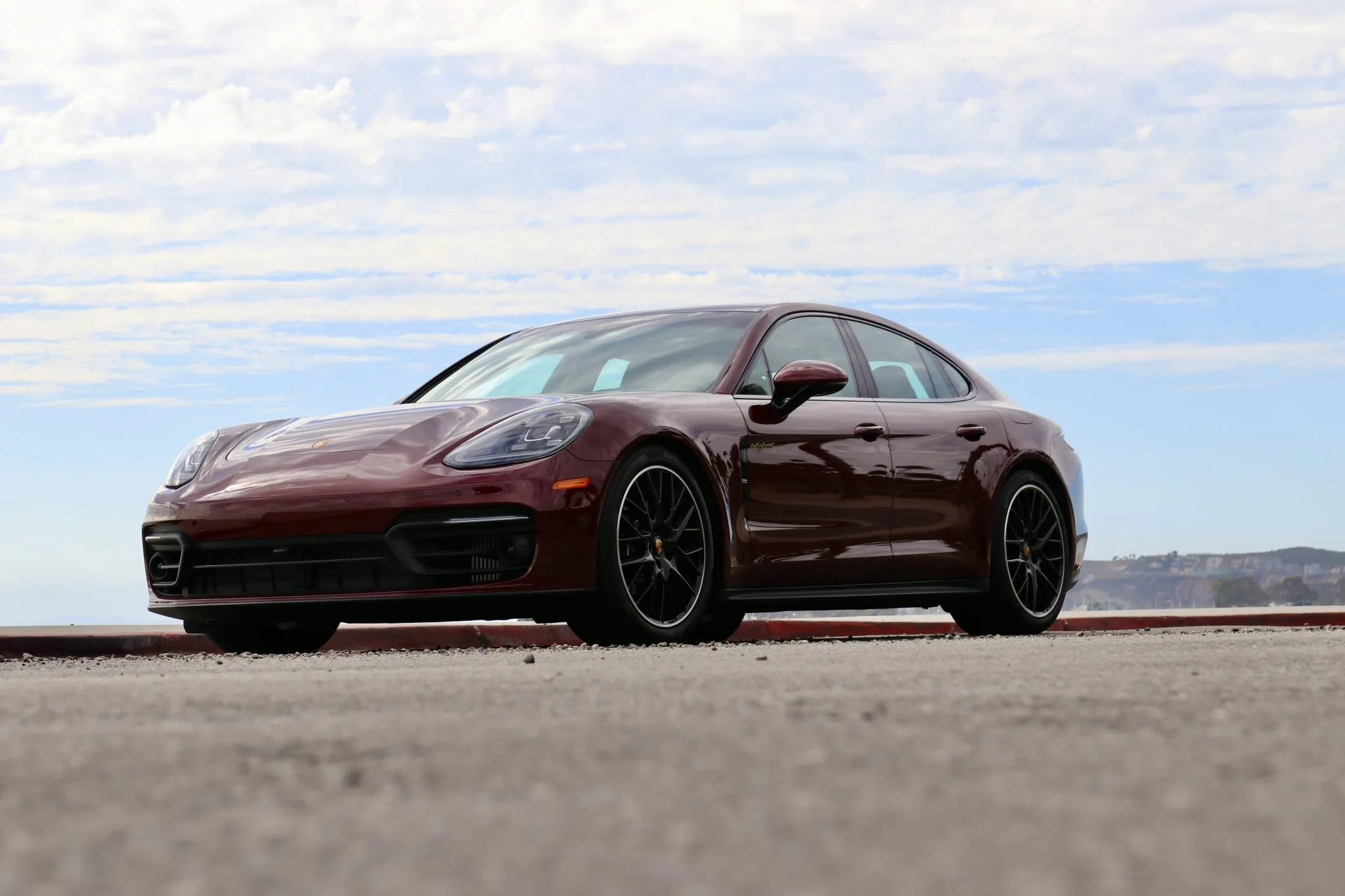 This 2023 Porsche Panamera 4S E-Hybrid is powered by a twin-turbocharged 2.9-liter V6 and synchronous electric motor that drives all four wheels through an eight-speed PDK dual-clutch automatic transmission and is finished in Cherry Metallic beige leather.