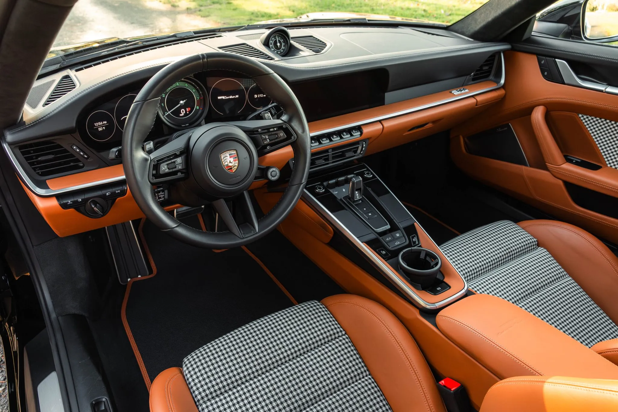 Finished in black over black and Cognac leather with Pepita-style cloth, the car is further equipped with the Sport Chrono Package, a glass sunroof, LED-Matrix Design headlights with PDLS+, Porsche Ceramic Composite Brakes, center-locking 20″ and 21″ Turbo S wheels, a sport exhaust system, PASM sport suspension, Power Steering Plus, a surround-view camera, heated power-adjustable front seats, a High-End Burmester sound system, adaptive cruise control, and Porsche Communication Management with navigation.