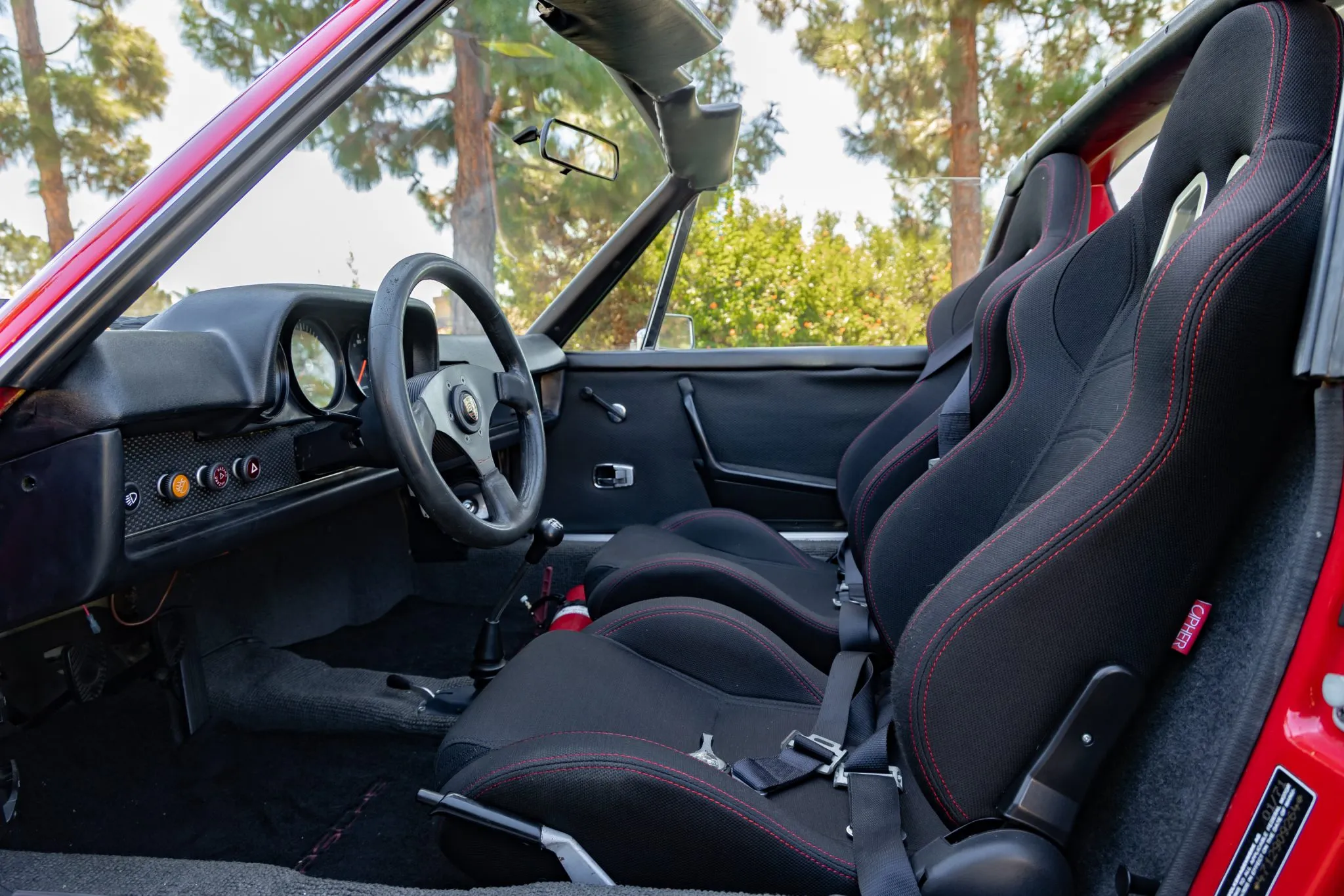 The car has been repainted in red and also has a front fuel filler, hood pins, pop-up H4 headlights, Euro-spec taillights, Cipher Auto bucket seats, a fire extinguisher, an Alpine CD stereo, Pioneer speakers, and an aftermarket steering wheel.