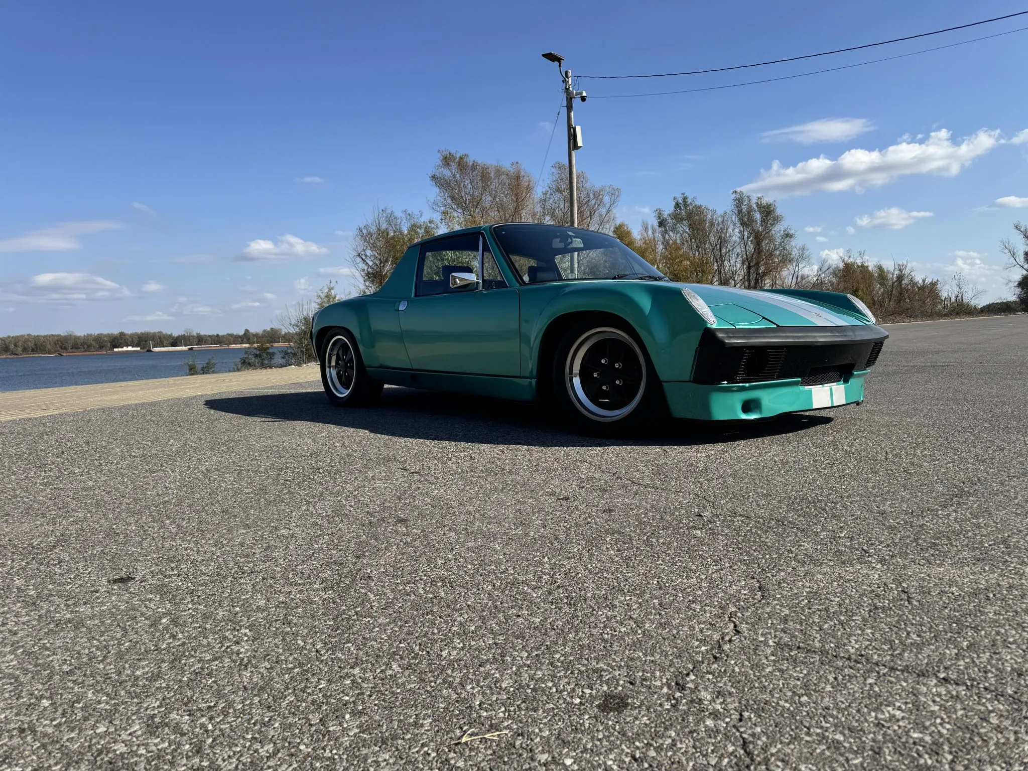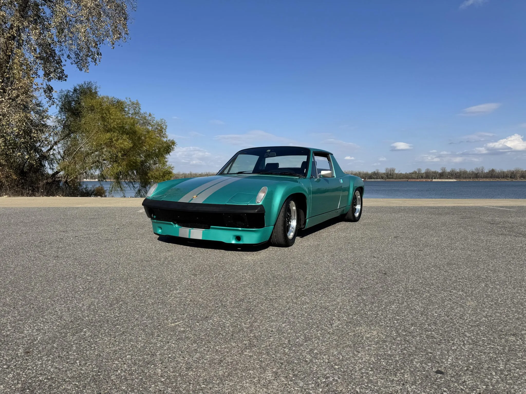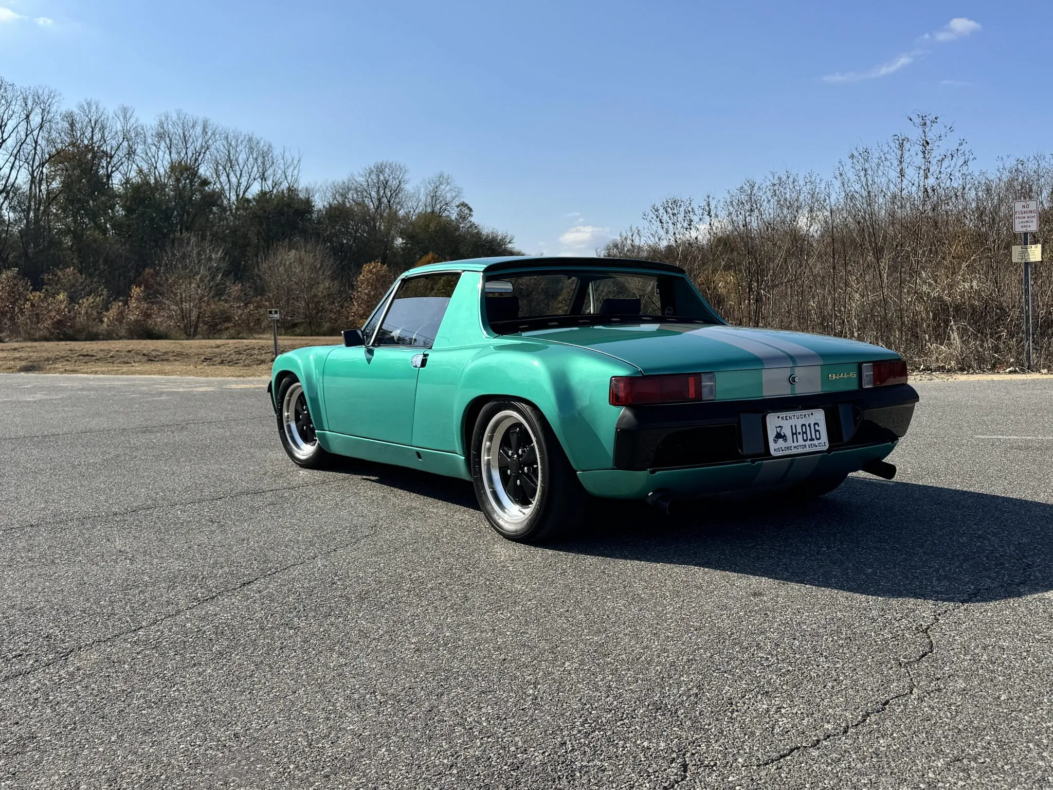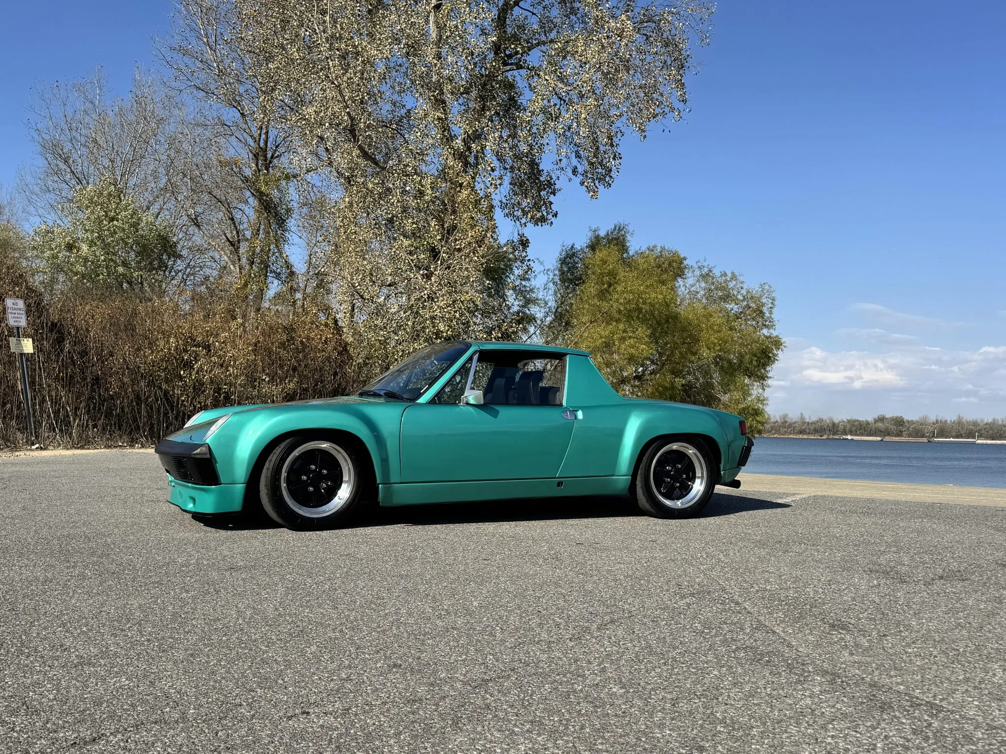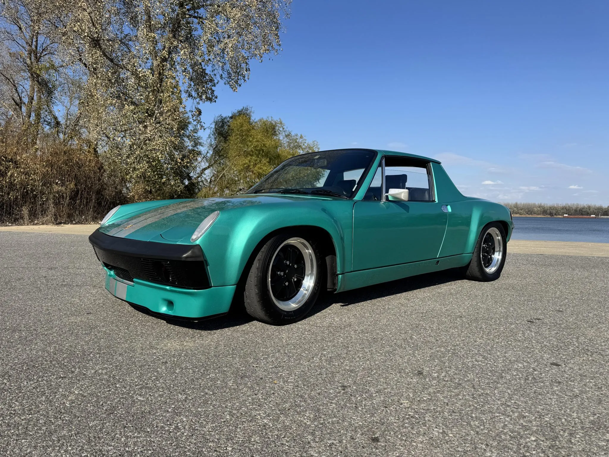 This 1972 Porsche 914 was modified between 2008 and 2012 with the installation of a 3.2-liter M930 flat-six and GT-style fender flares. It is finished in metallic blue over black upholstery and features a side-shift five-speed manual transaxle, Bilstein dampers, 16” Fuchs wheels, and slotted brake rotors with red calipers.