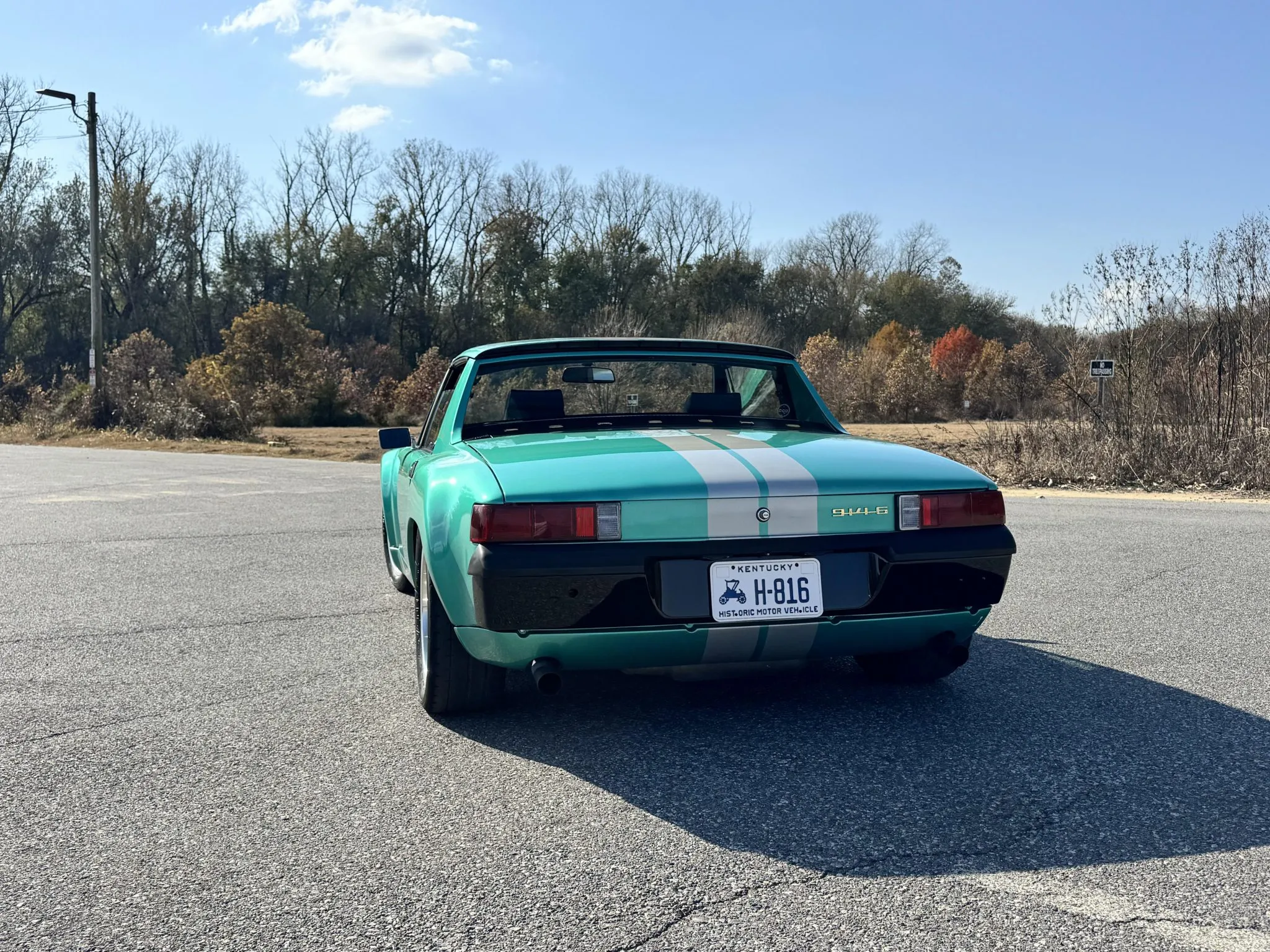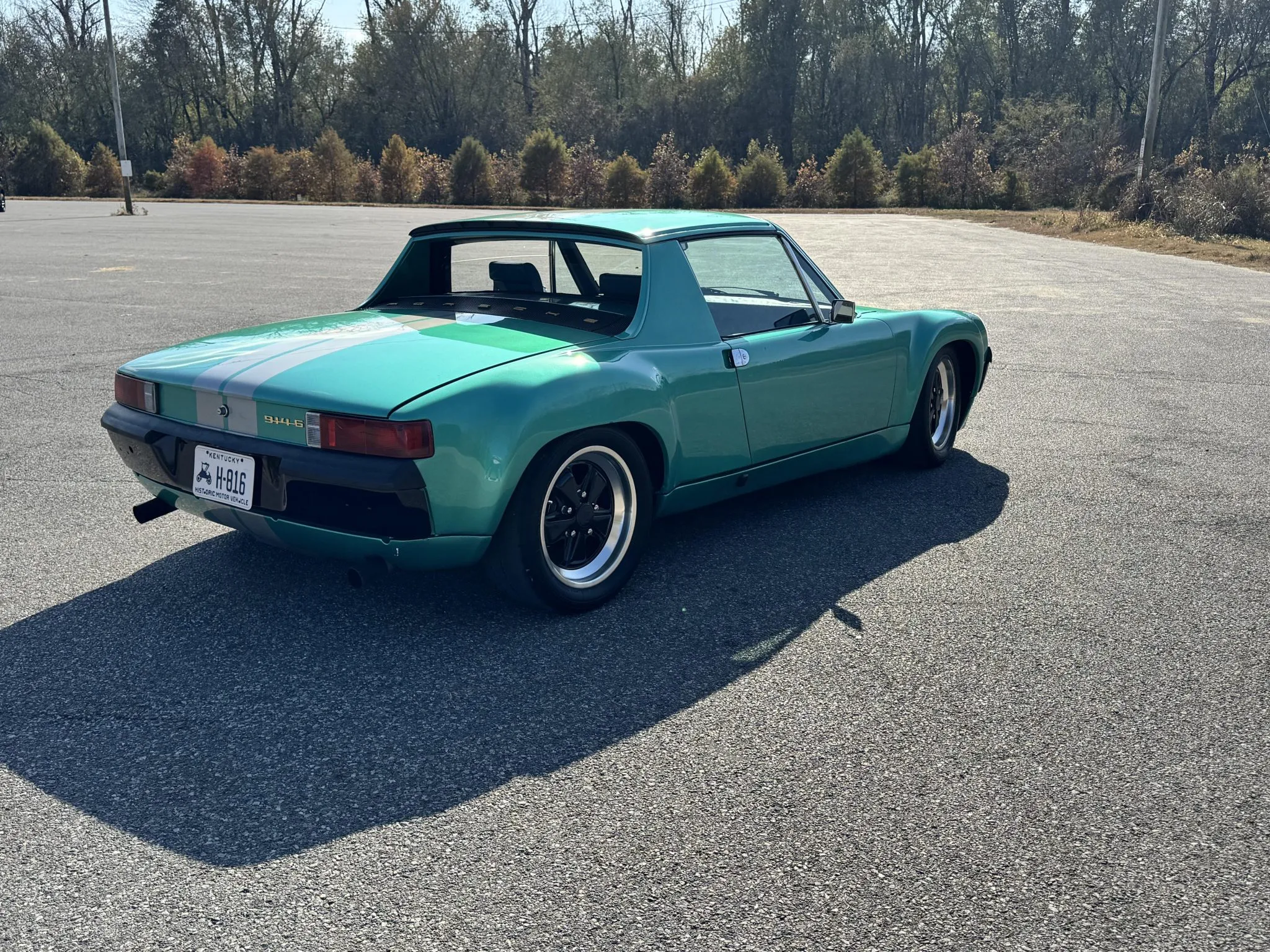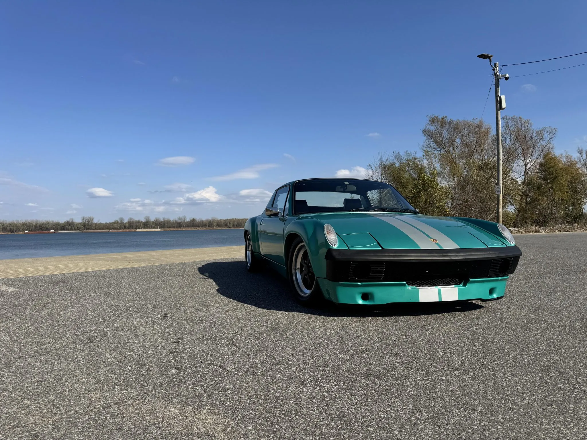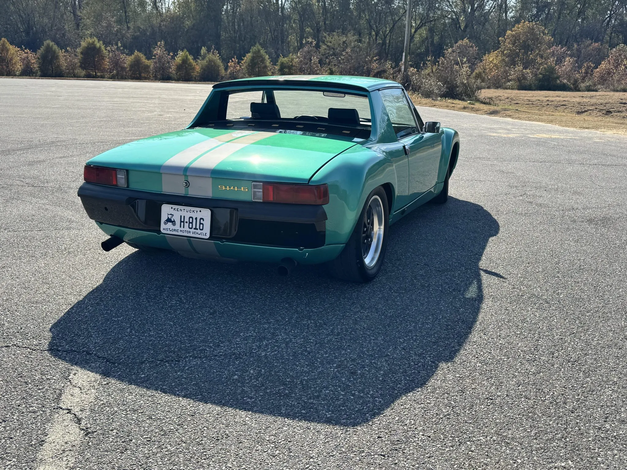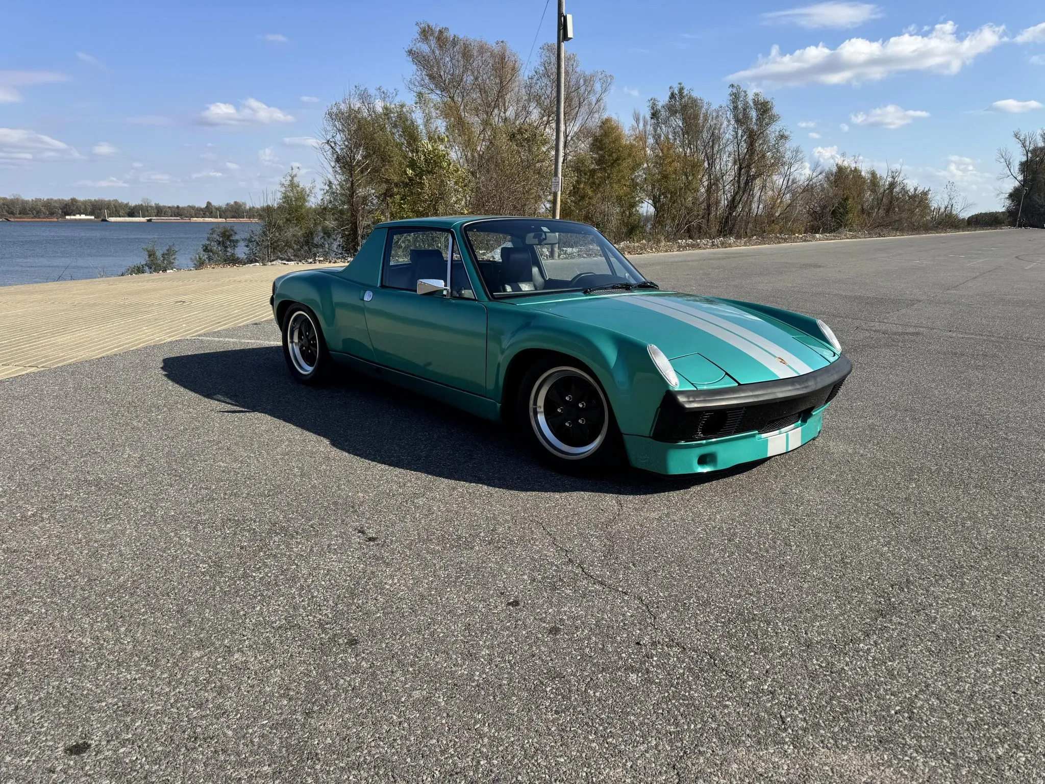 This 1972 Porsche 914 was modified between 2008 and 2012 with the installation of a 3.2-liter M930 flat-six and GT-style fender flares. It is finished in metallic blue over black upholstery and features a side-shift five-speed manual transaxle, Bilstein dampers, 16” Fuchs wheels, and slotted brake rotors with red calipers.