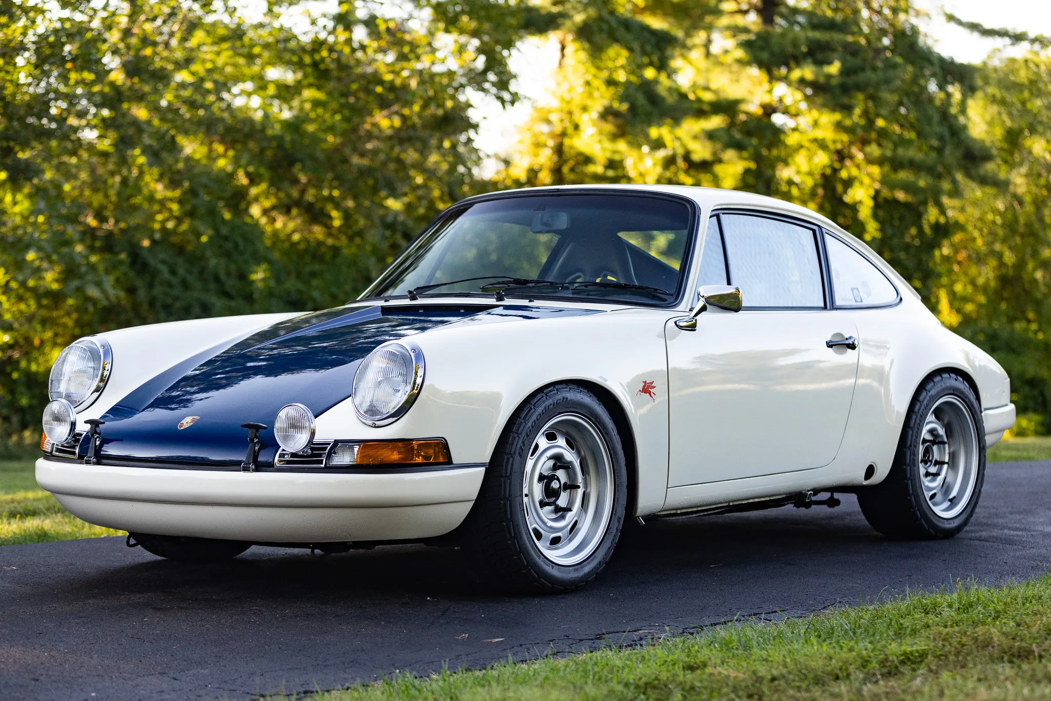 This 1975 Porsche 911S coupe was acquired by the current owner in 2018 and was the subject of a backdate build between 2022 and 2025, including the installation of a long hood, fiberglass bumpers, flared rear fenders, and a sunroof delete panel. Power is supplied by a 3.2-liter flat-six equipped with dual PMO carburetors and linked with a five-speed manual transaxle.