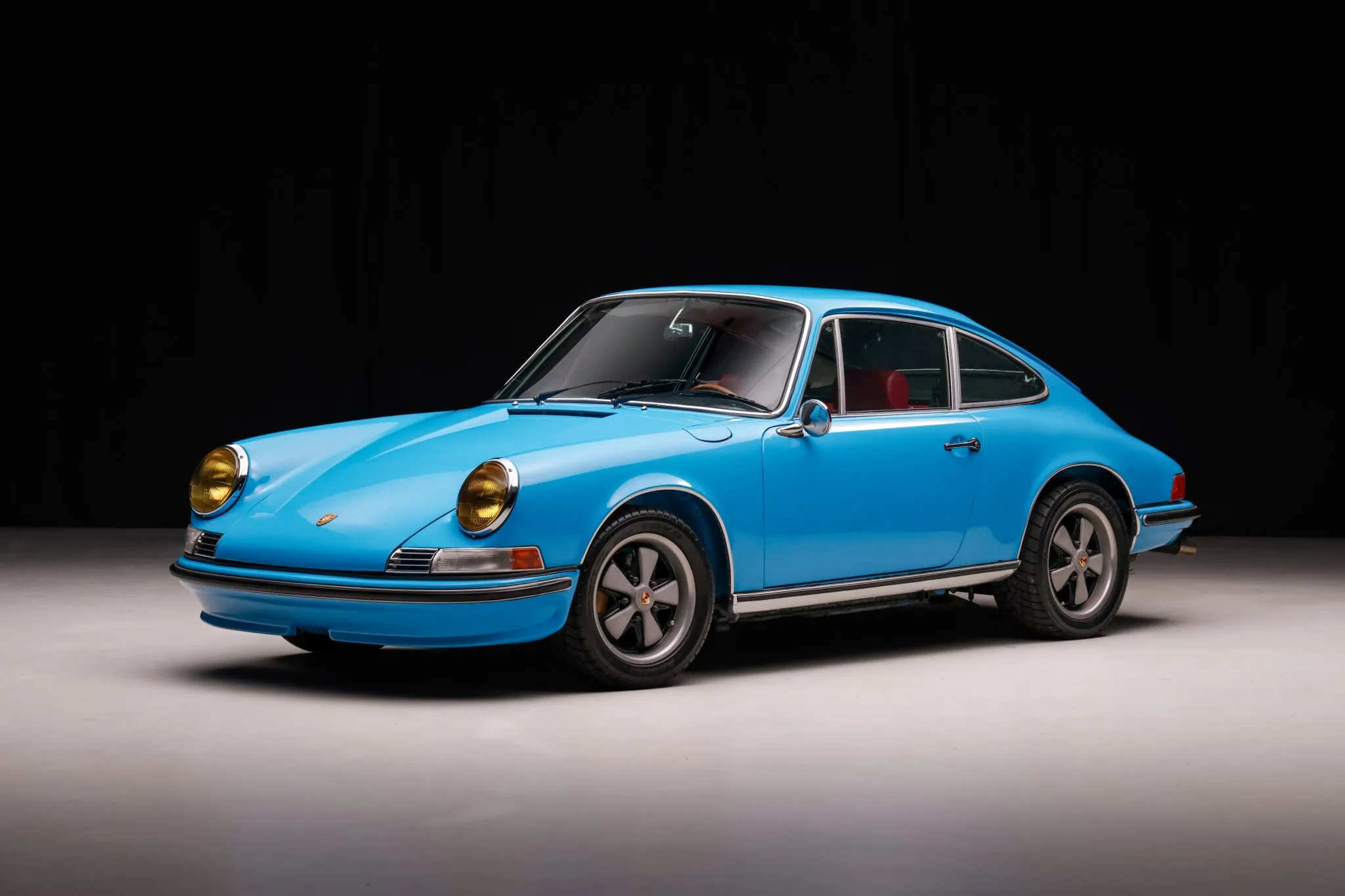 Additional details include an early 1970s-style Glacier Blue exterior finish, yellow H4 headlights, 15″ Fuchs-style wheels, Brembo disc brakes, coilover suspension, red vinyl upholstery, sport bucket seats, Haargarn carpeting, a dual RSR-style pedal assembly, and a 901-style dashboard, steering wheel, door panels, and instrumentation.