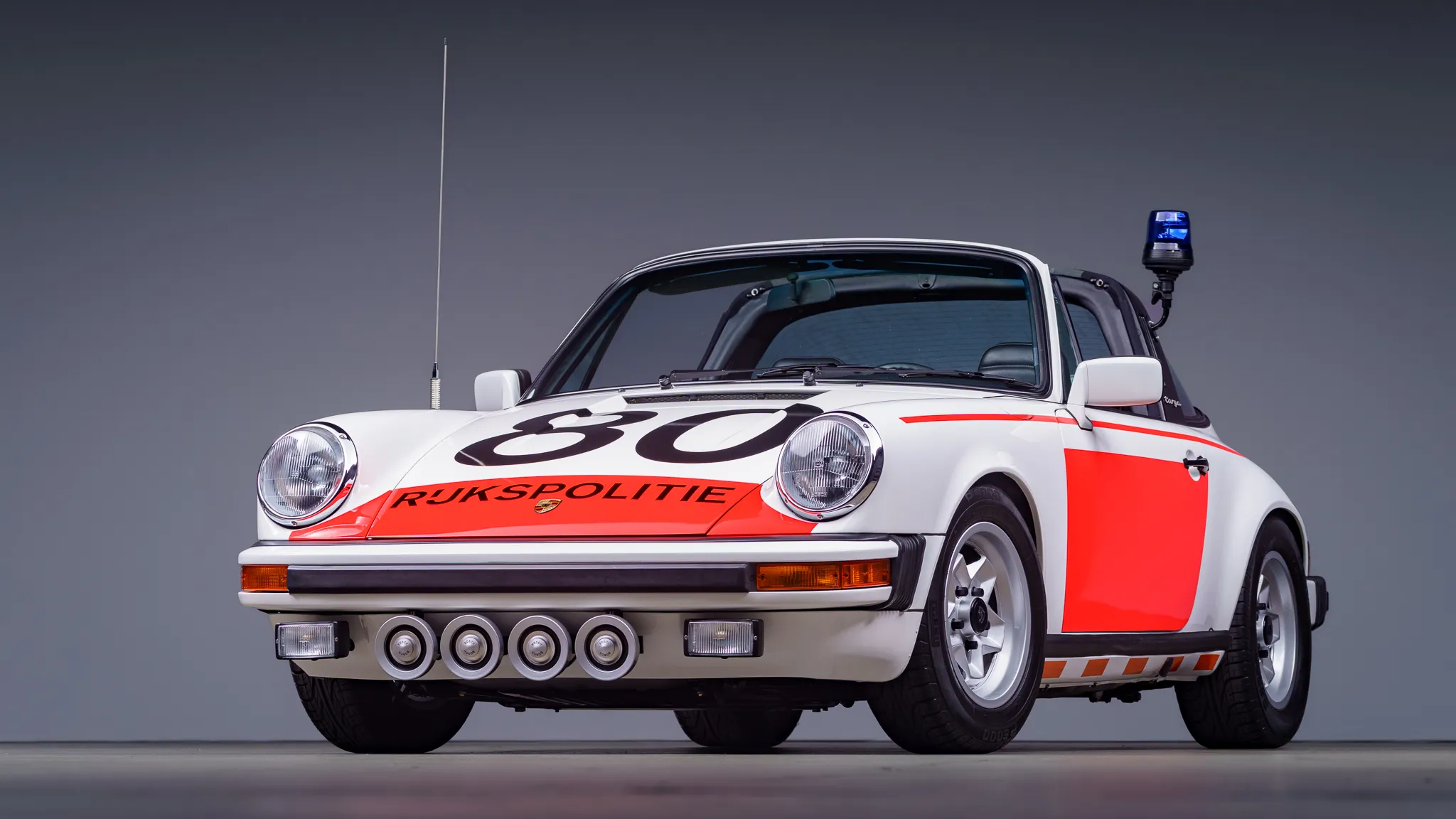 Modifications in the style of 911 Targas used by the Dutch police force included the installation of red vinyl livery, Bosch front horns, a blue beacon light, a PA system, a rear message display, a custom dashboard switch panel, a CB radio, and a custom interior equipment organizer.
