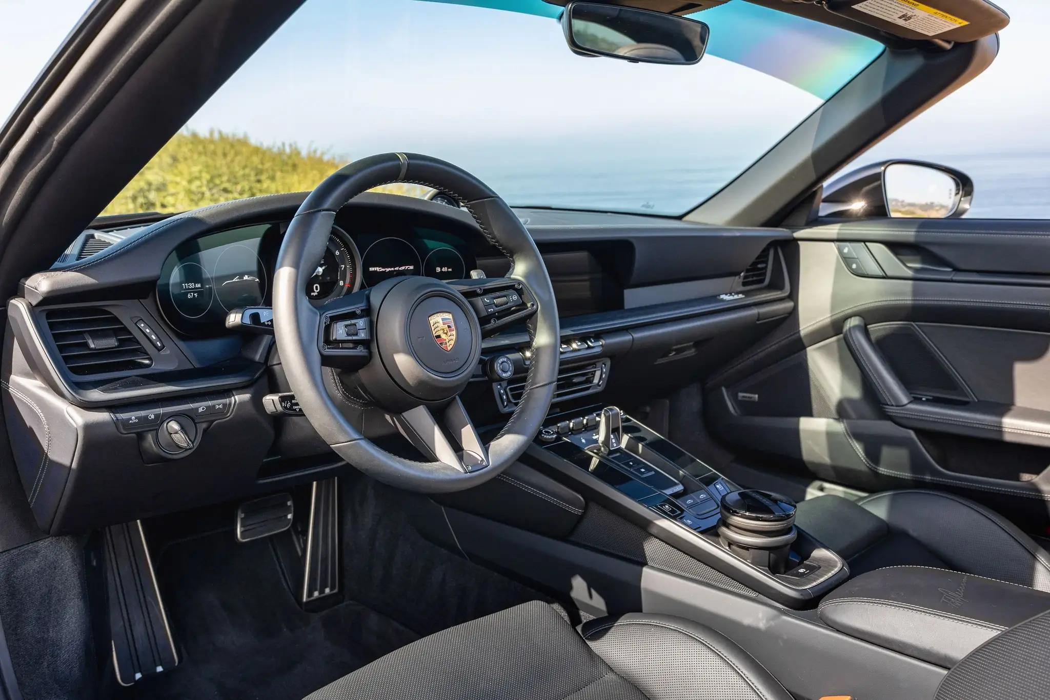The cabin features Black leather with Slate Grey stitching and Black/Cool Grey checkered Sport-Tex seat centers. As standard, a Porsche Design Subsecond clock adorns the dashboard, featuring a red second hand inspired by the 1972 Chronograph I. Additionally, a Slate Grey 12 o’clock marking accents the steering wheel, complemented by matching seatbelts, and “Porsche Design 50th Anniversary” logos can be found on the headrests and brushed aluminum door entry guards. The 18-way Adaptive Sport Seats Plus with the Memory Package were further selected with leather backrest shells and inlays. Additional options include heated and ventilated front seats, a heated GT Sport steering wheel in leather, the Extended Leather Package, BOSE Surround Sound System, Storage Package, Surround View, Lane Change Assist (LCA), Ambient Lighting, and under-door puddle light projectors.