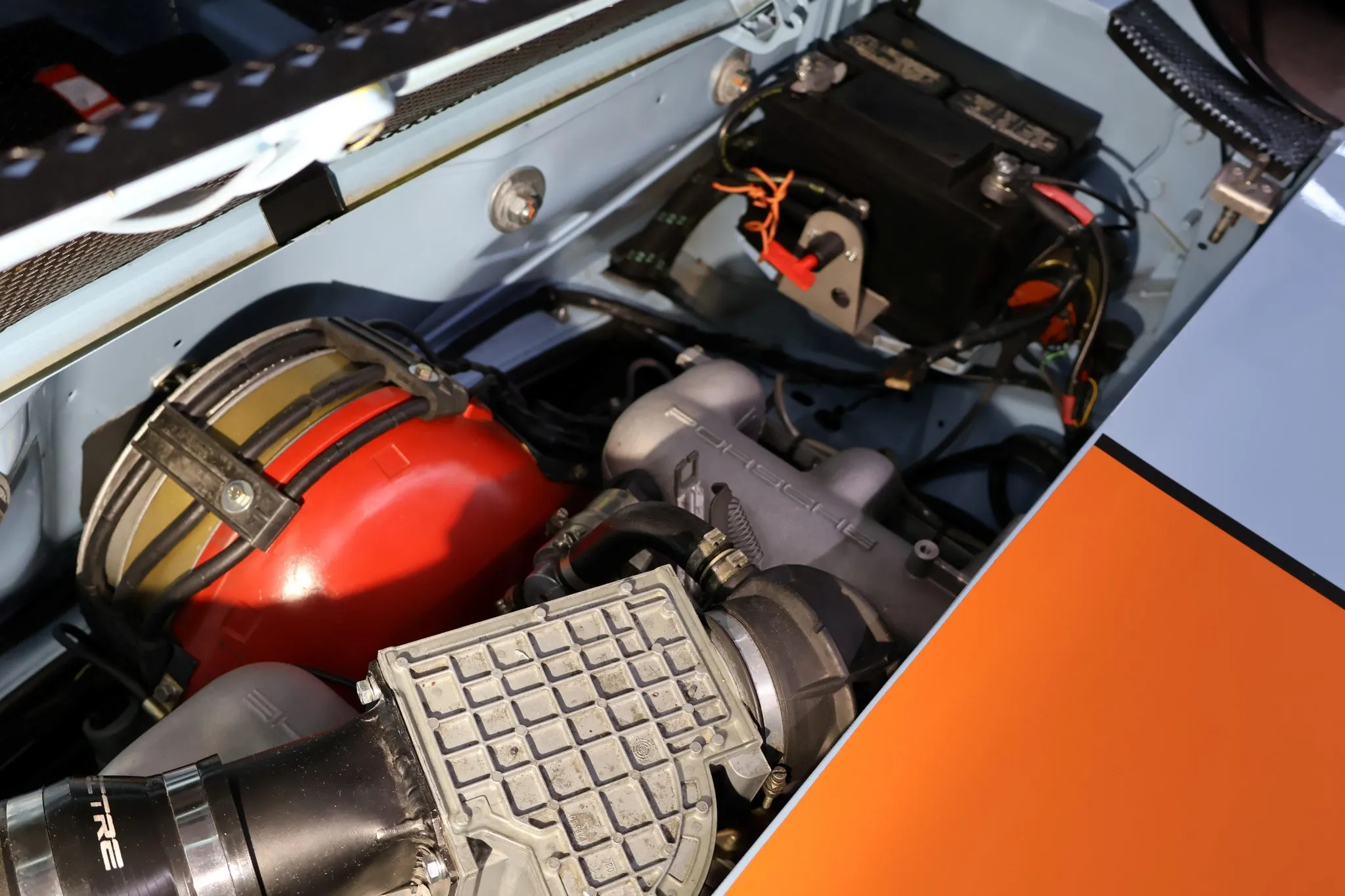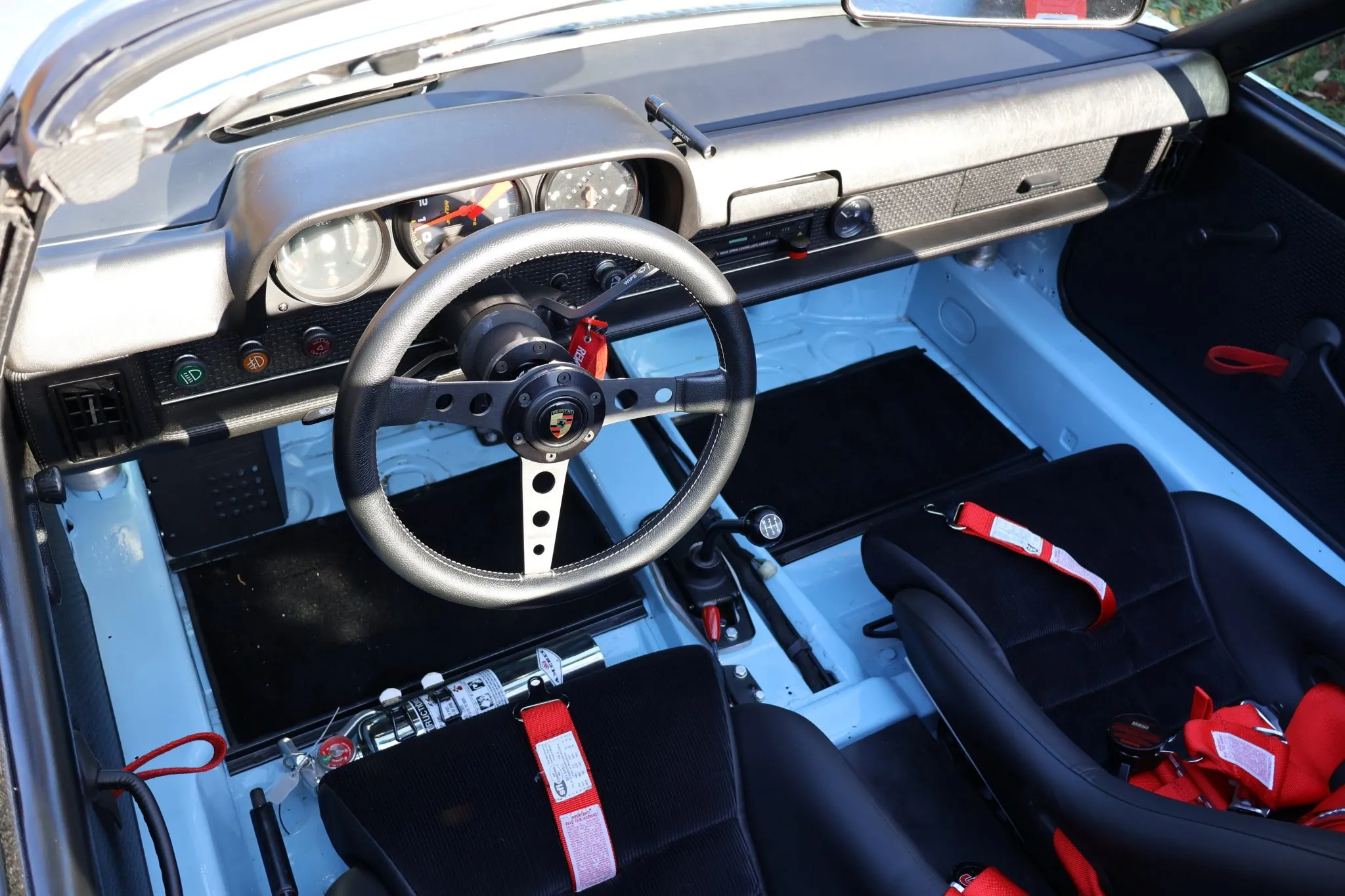 The car wears GT-style flared fiberglass bodywork that has been painted in a Gulf-style livery, and the partially stripped interior was redone and features GTS bucket seats, harnesses, Rennline pedals, a MOMO-style steering wheel mounted on a quick-release hub, and an aftermarket shifter.