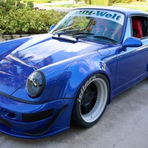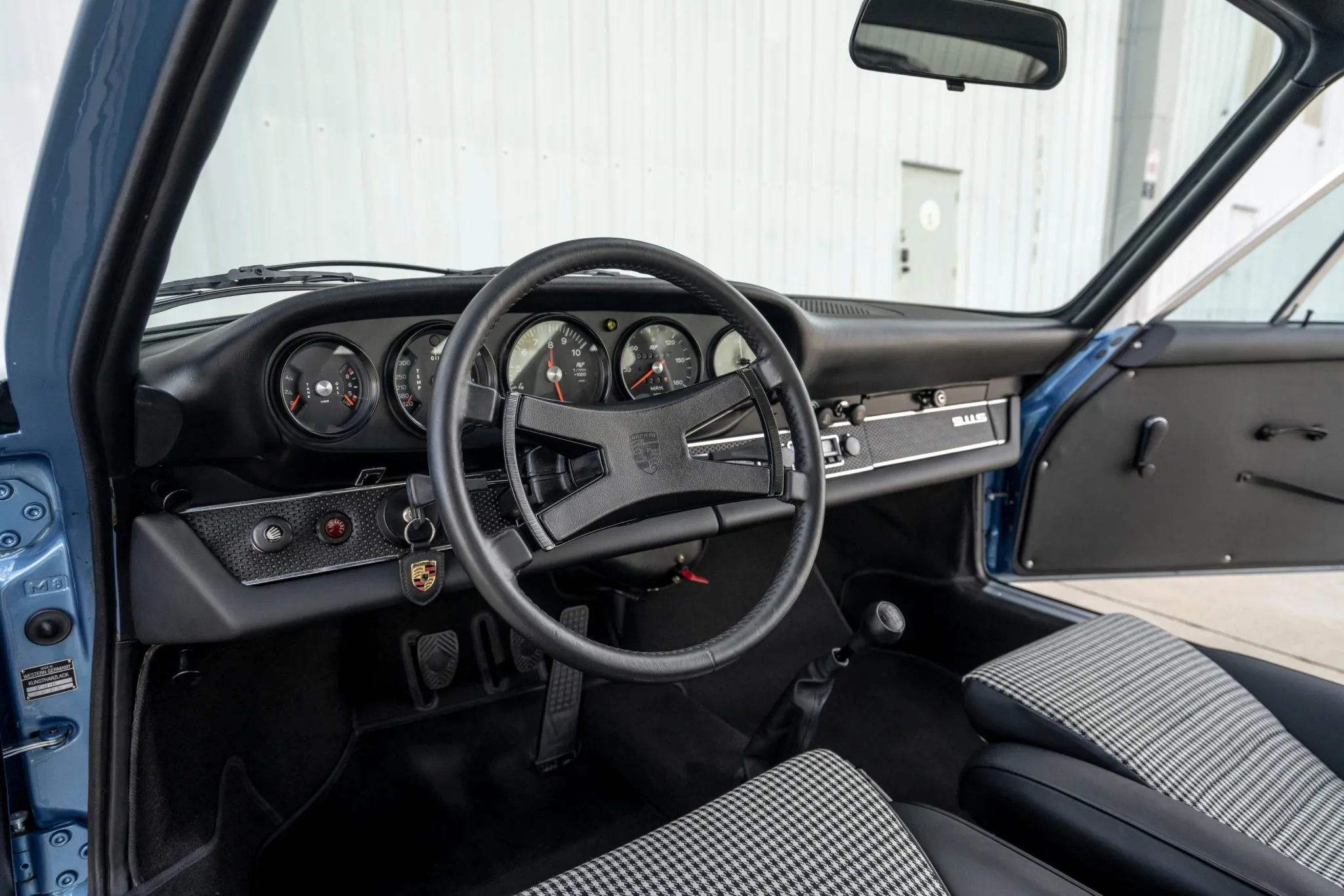 Flared rear wheel arches were added to the body before a repaint in Gemini Blue Metallic, while the interior was redone with Pepita and leather upholstery as well as lightweight door panels. Other highlights include a RUF exhaust system, upgraded oil coolers, Fuchs 15” wheels, a power-operated sunroof, H4 headlights, and a Blaupunkt AM/FM radio.