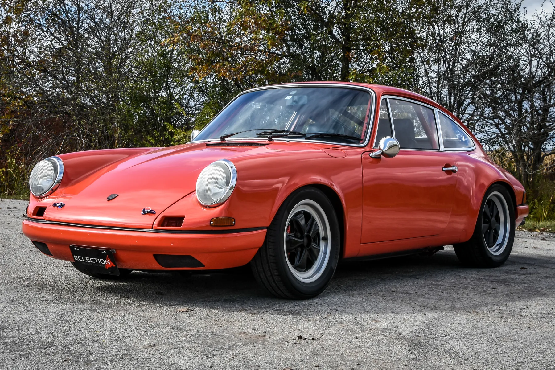 The car was fitted with a composite 911R-style front end, doors, decklid, and rear bumpers as well as flared RS-style steel rear quarters before being refinished in Tangerine, and the interior was redone with polycarbonate windows, a roll cage, a MOMO steering wheel, Recaro bucket seats, and RS-style door panels.