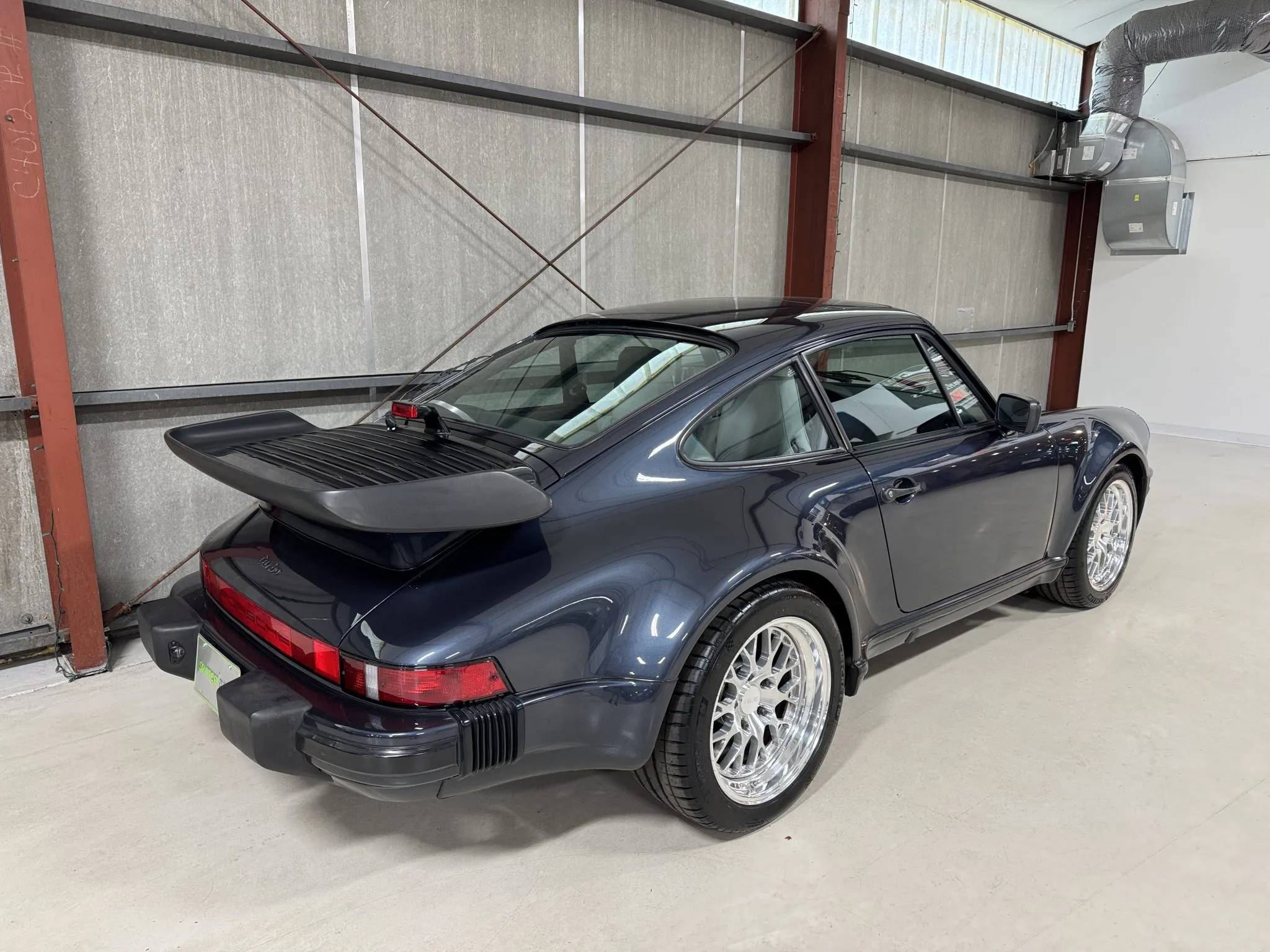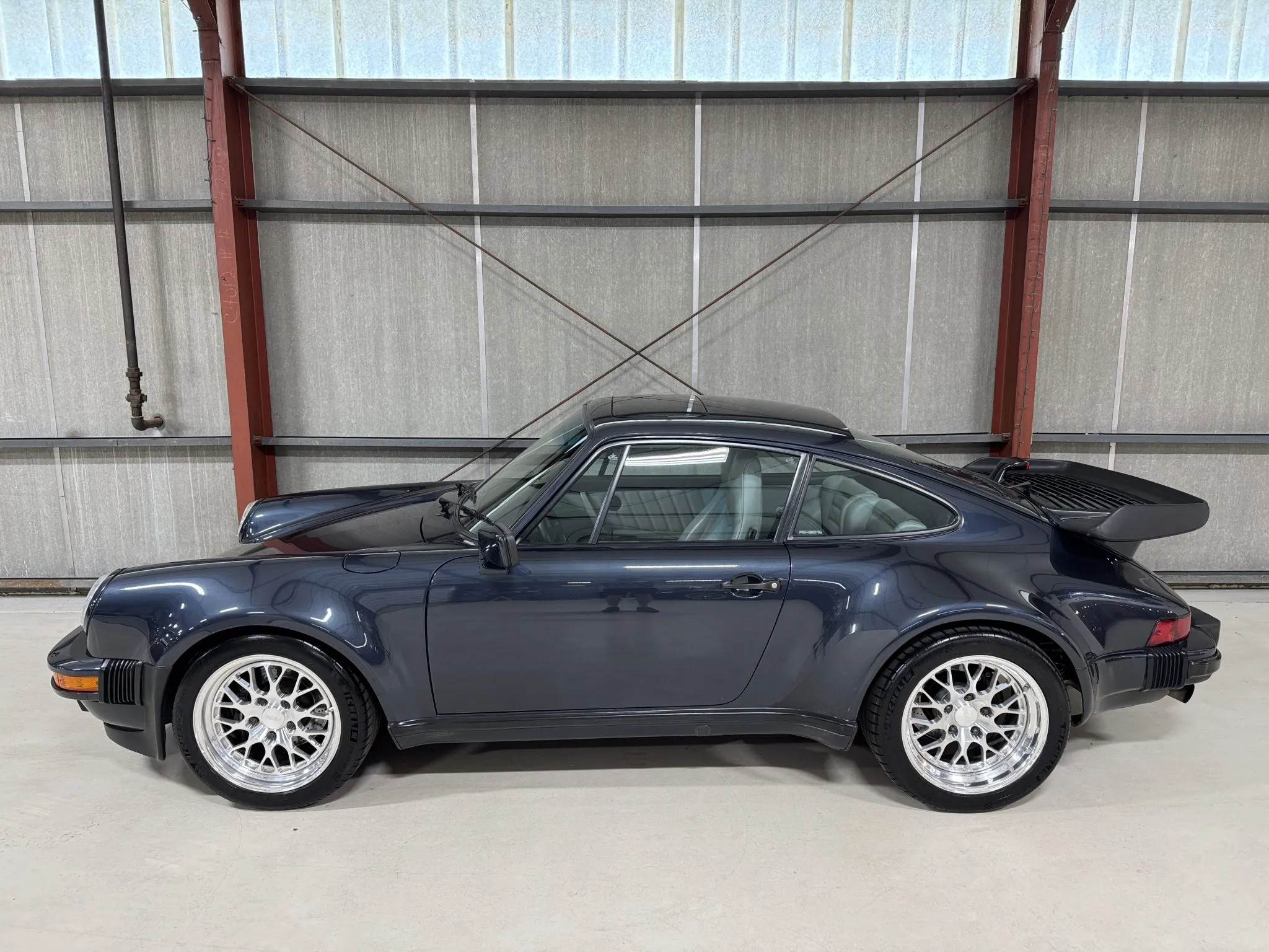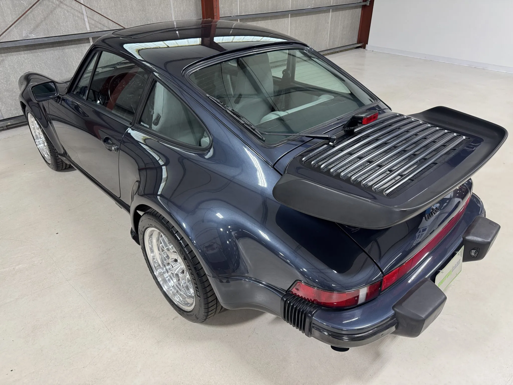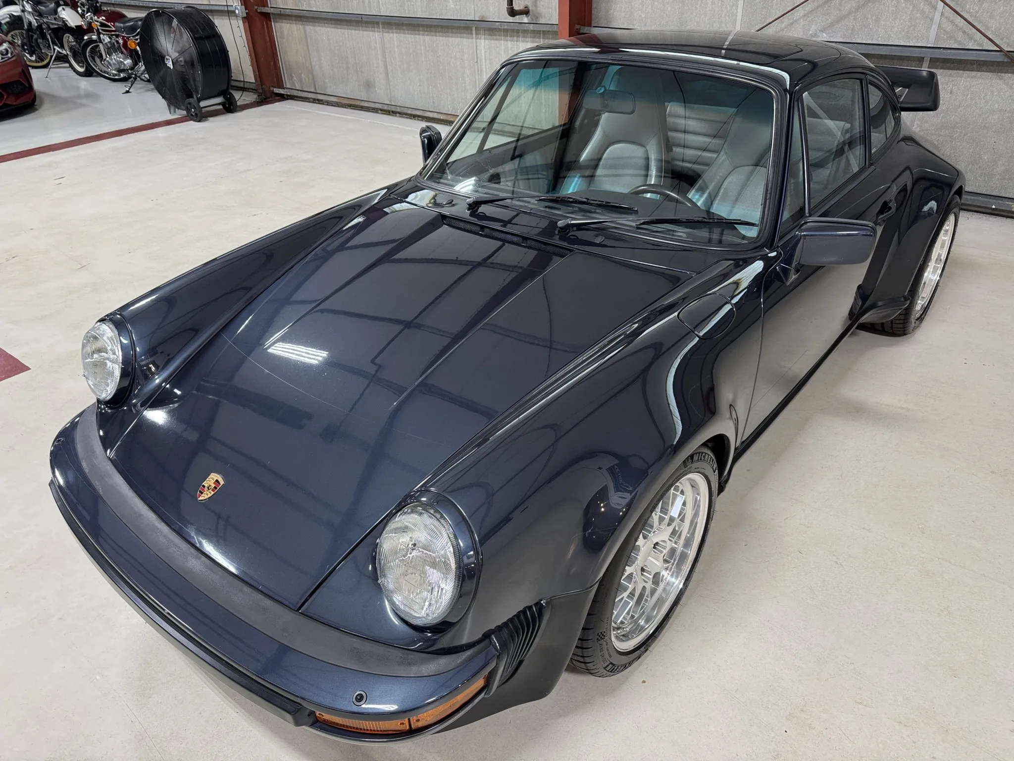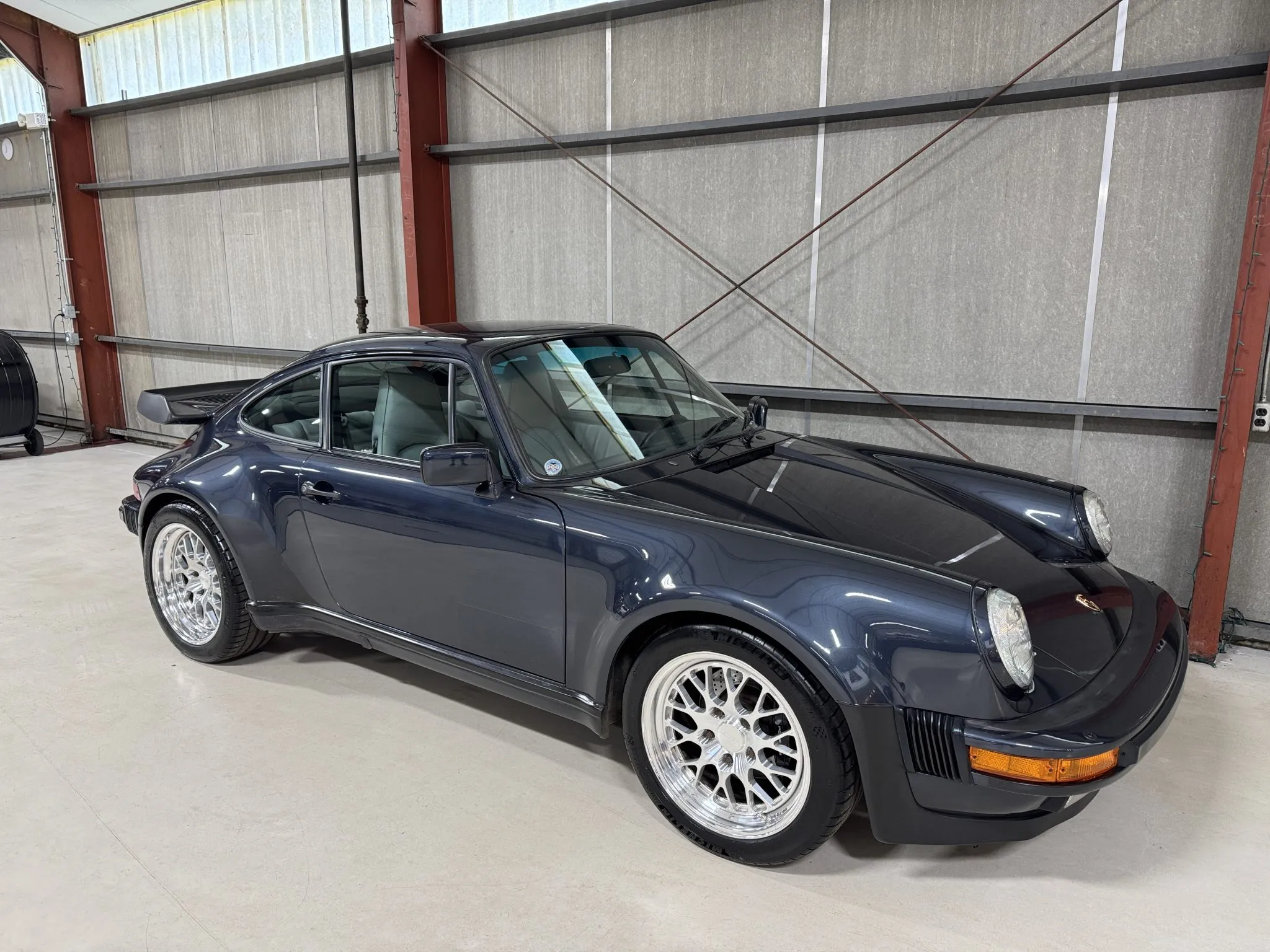This 1987 Porsche 911 Turbo coupe is finished in metallic blue over gray leather upholstery and is powered by a turbocharged 3.3-liter flat-six that has been modified with a K27 turbocharger, an Andial fuel-enrichment system, and an aftermarket intercooler, airbox, exhaust, and camshafts.