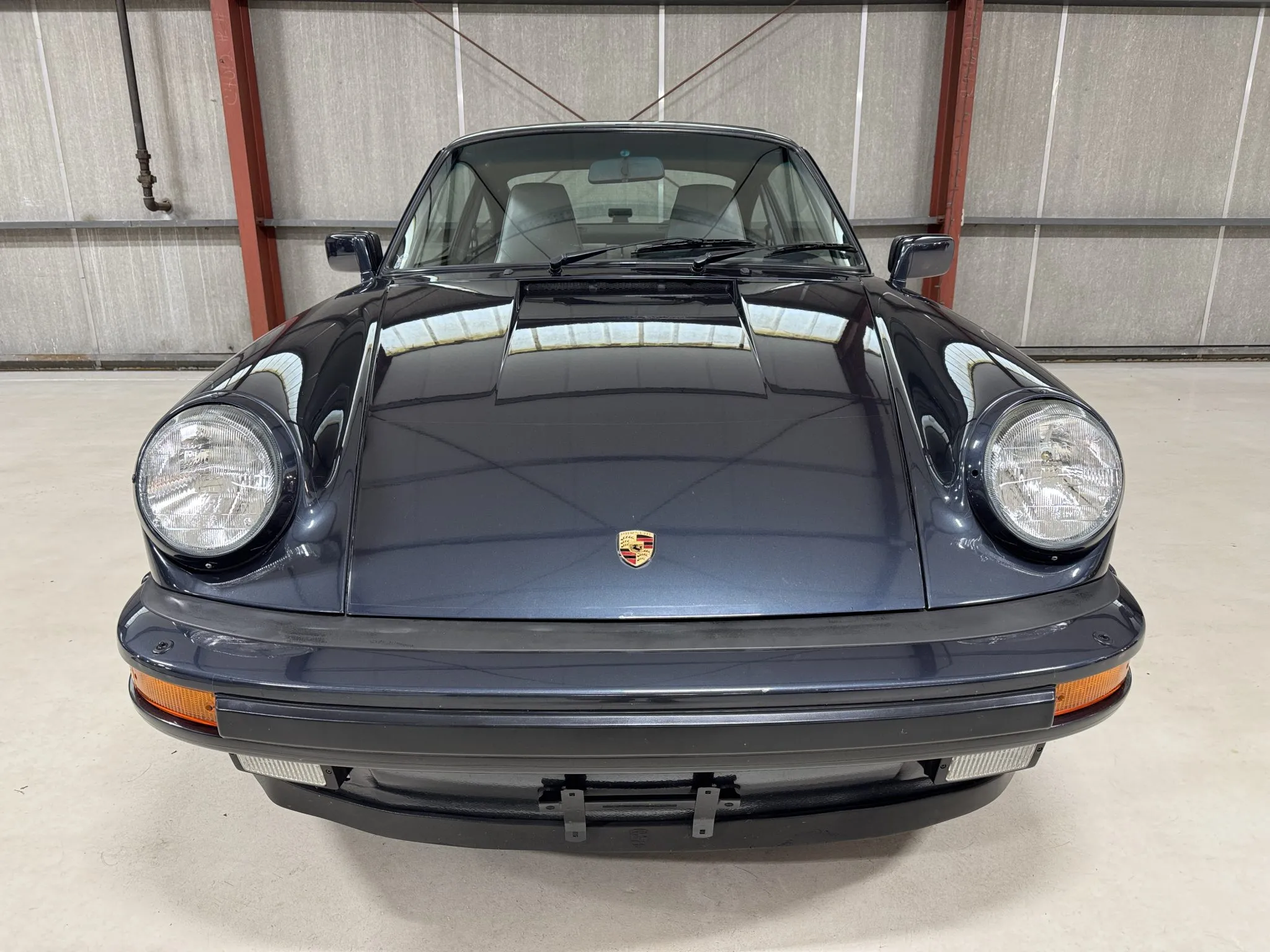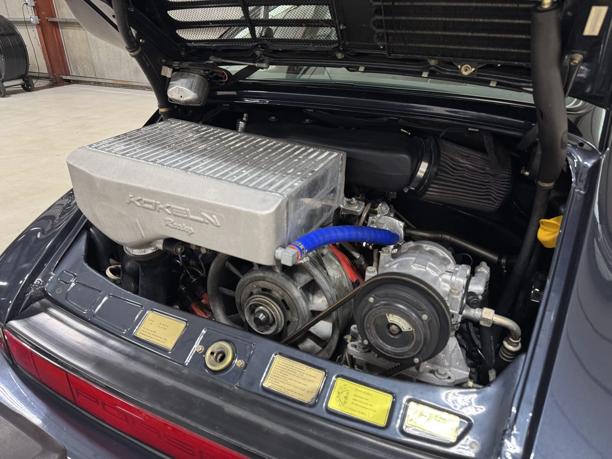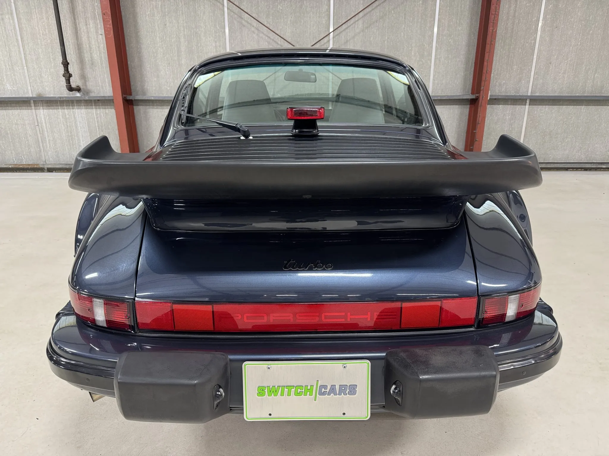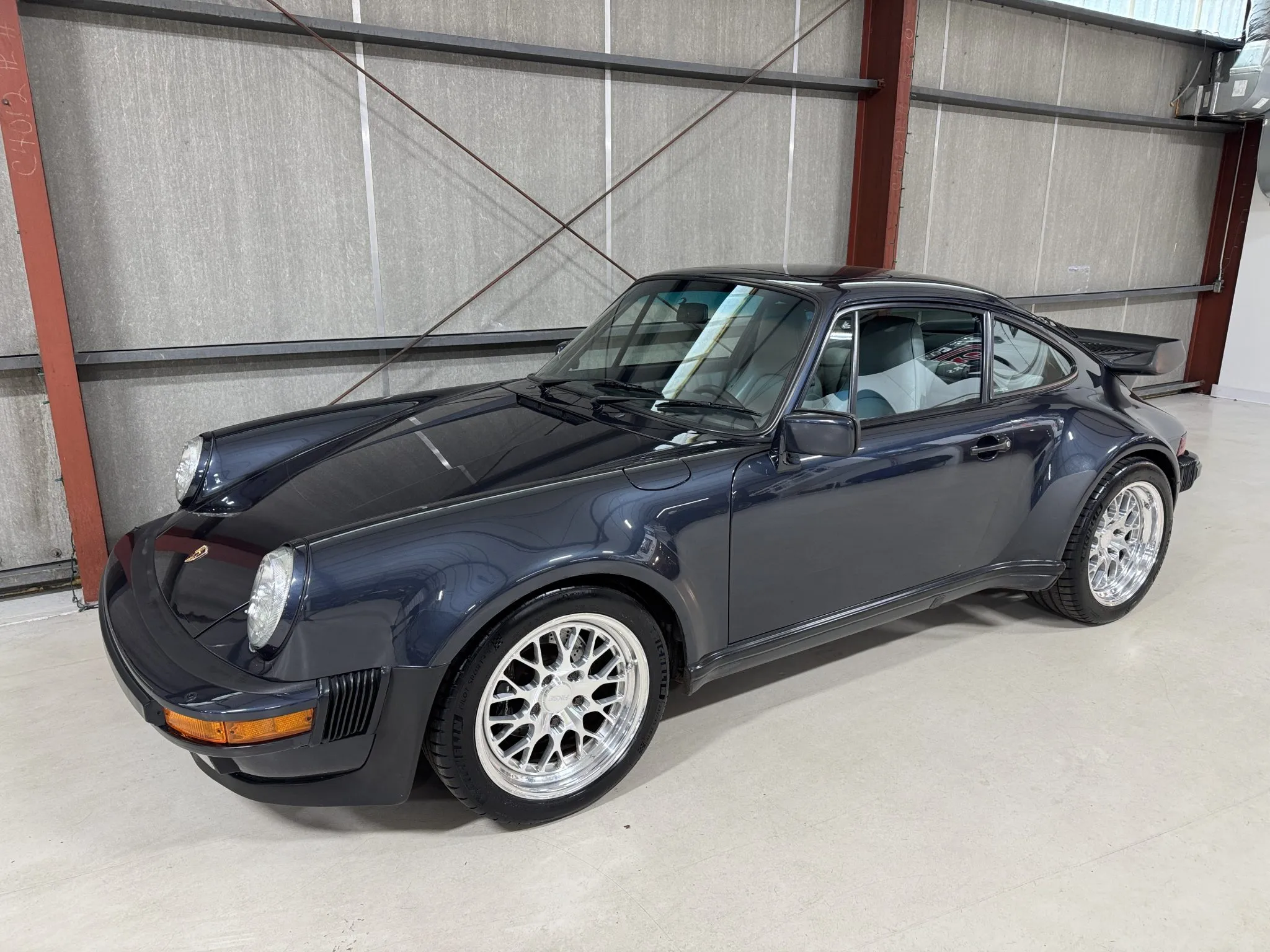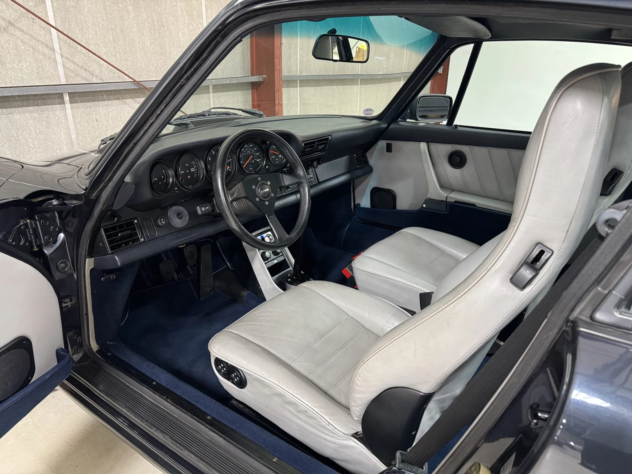 This 1987 Porsche 911 Turbo coupe is finished in metallic blue over gray leather upholstery and is powered by a turbocharged 3.3-liter flat-six that has been modified with a K27 turbocharger, an Andial fuel-enrichment system, and an aftermarket intercooler, airbox, exhaust, and camshafts.