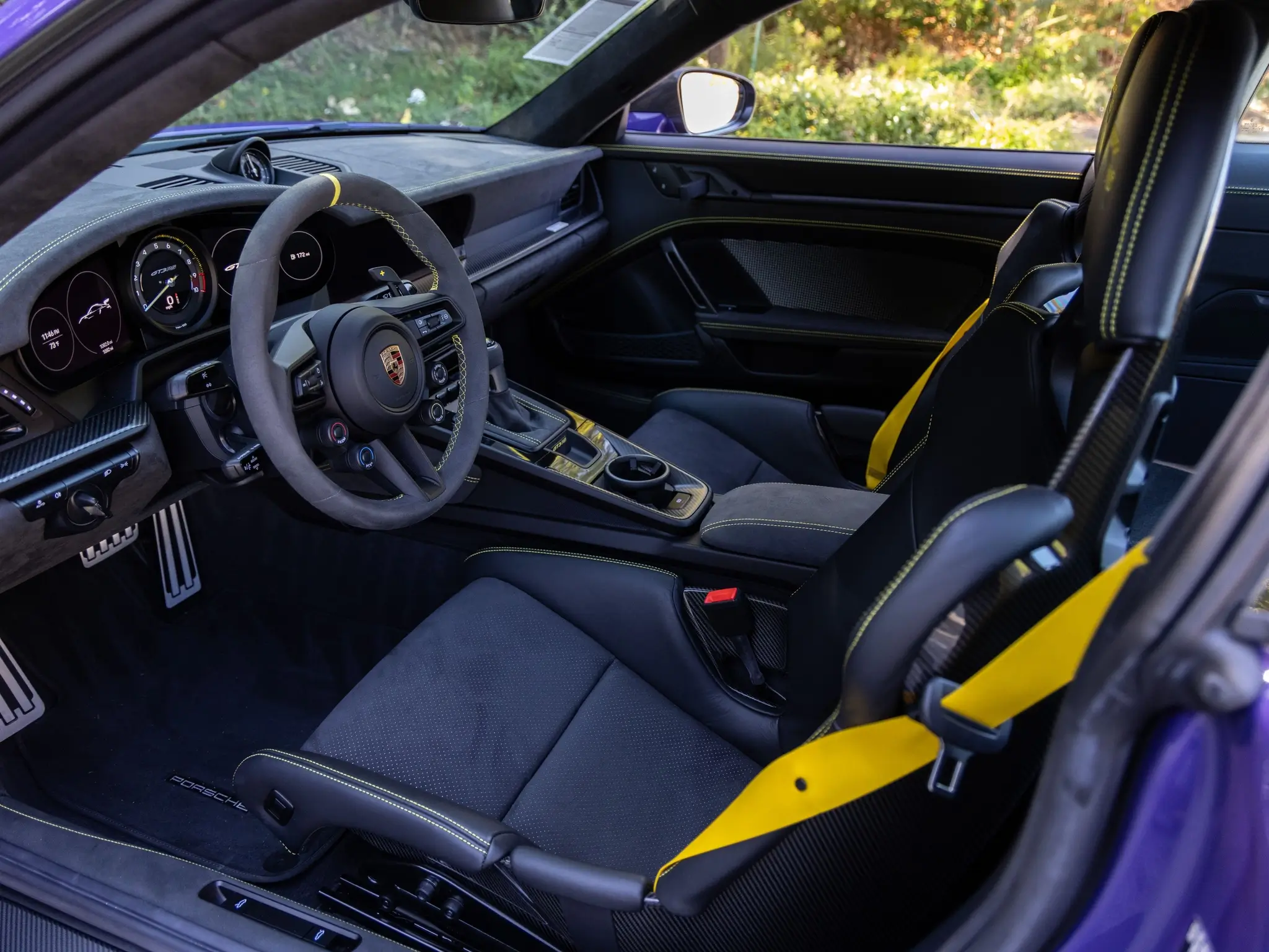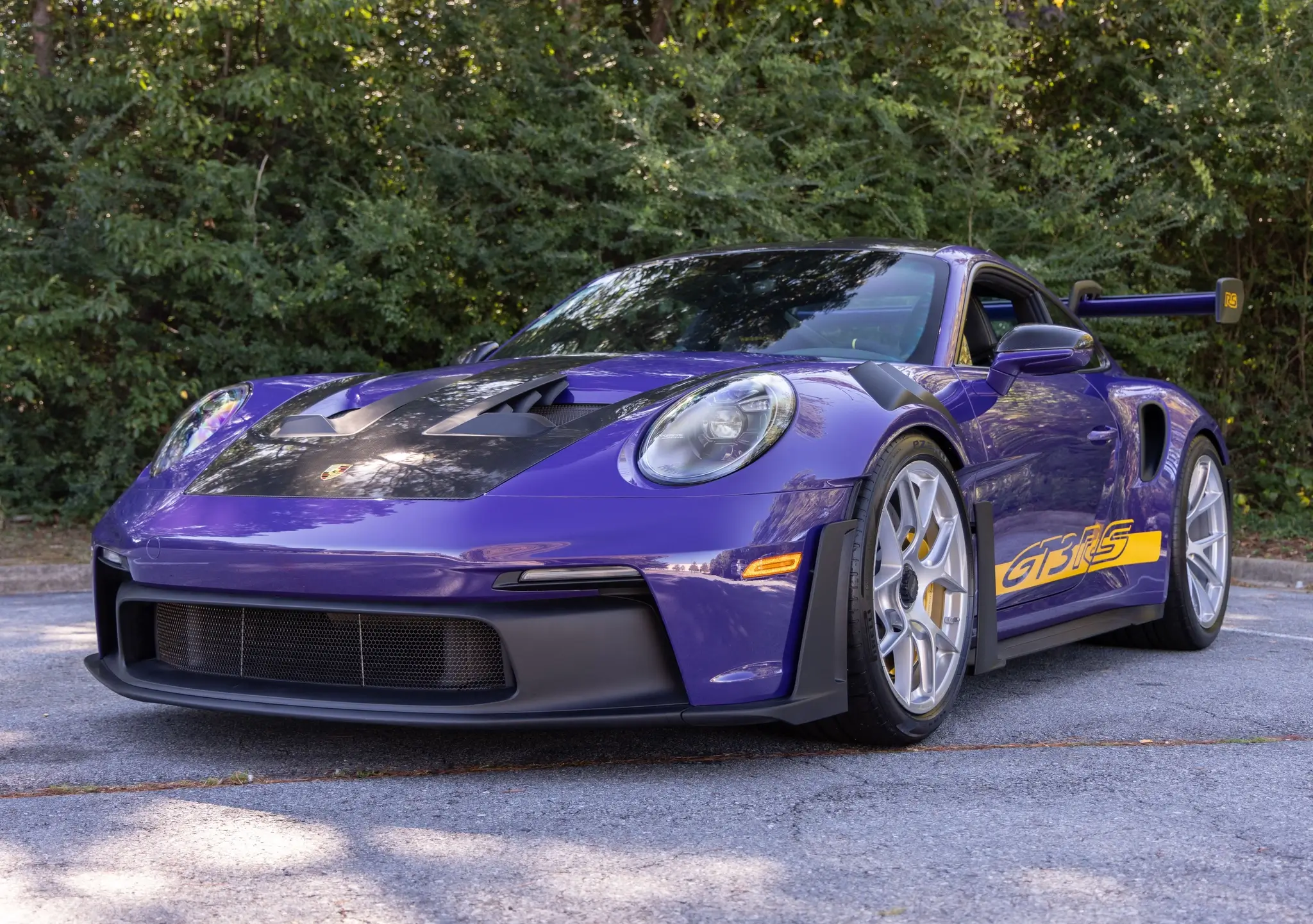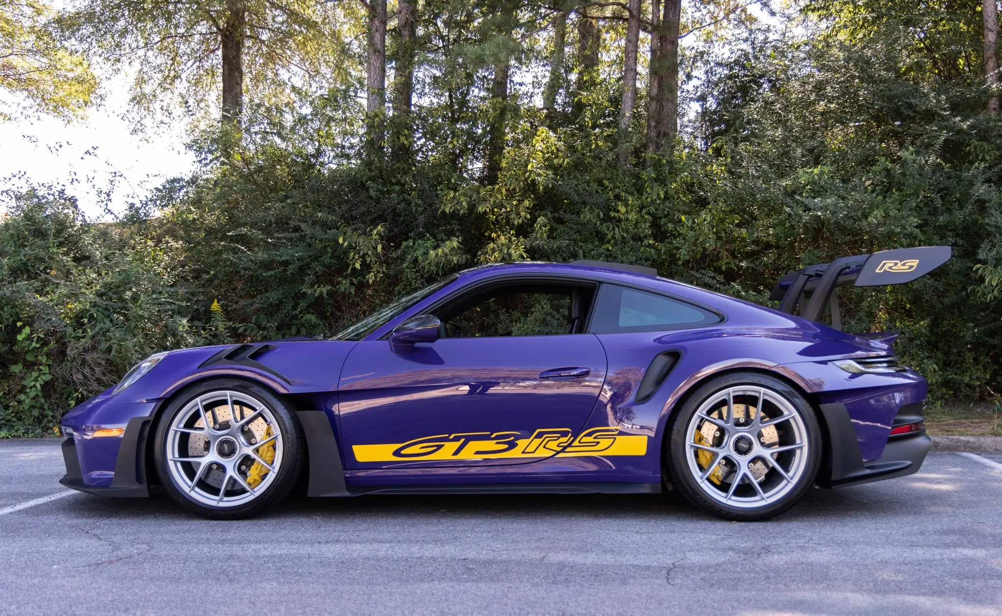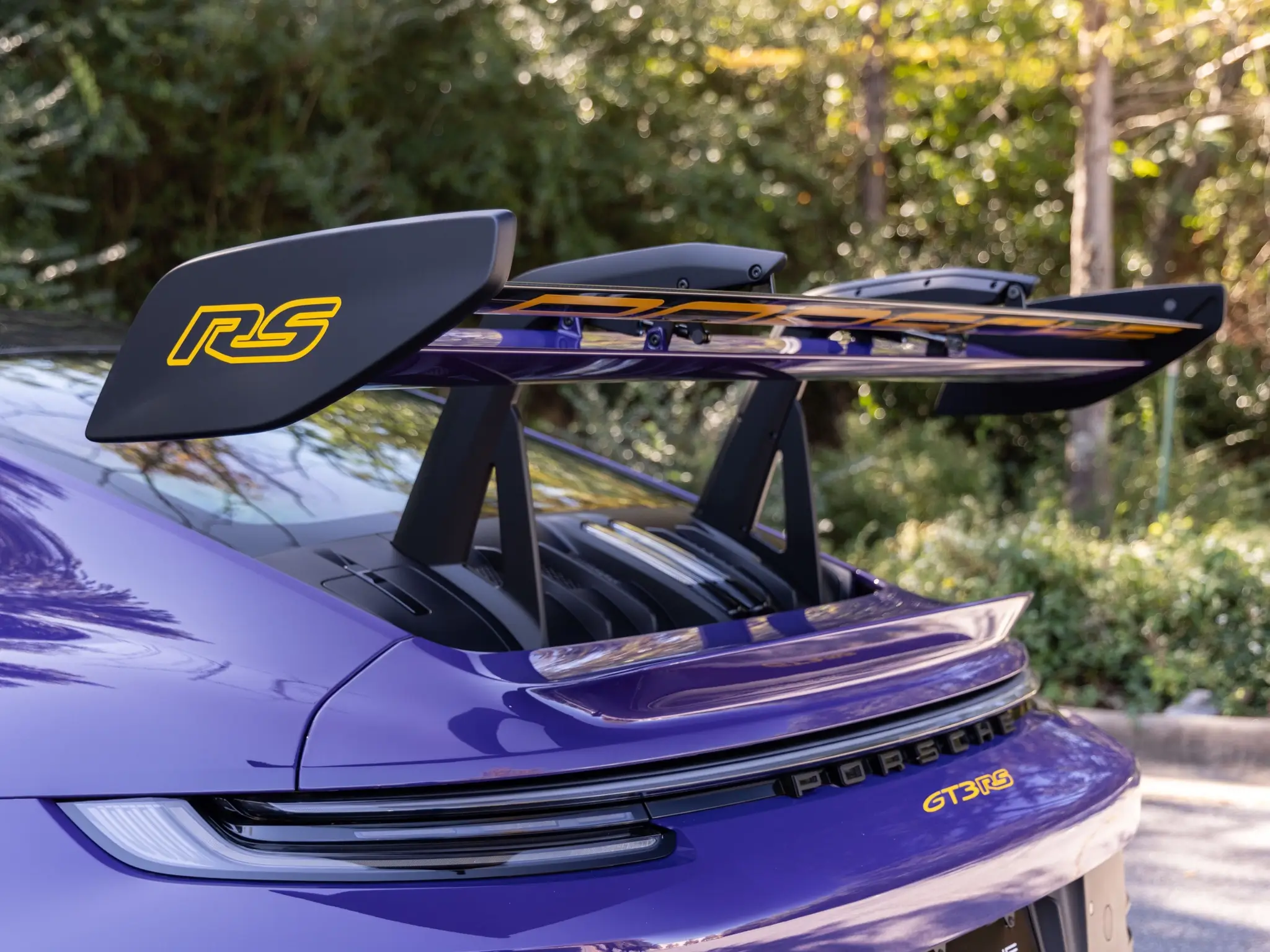 Specified in Paint to Sample Ultraviolet over Black leather and Race-Tex upholstery with yellow stitching, this 2025 Porsche 992 GT3 RS sits among the marque’s ultimate track-focused offerings.