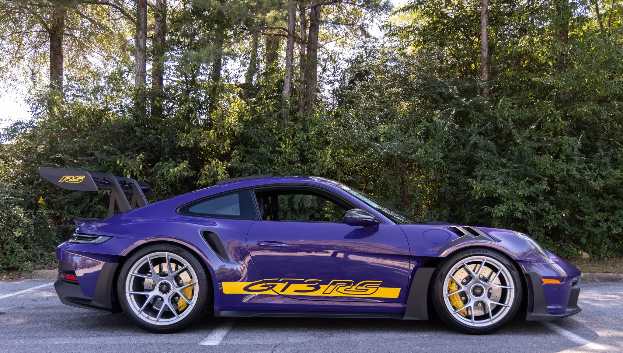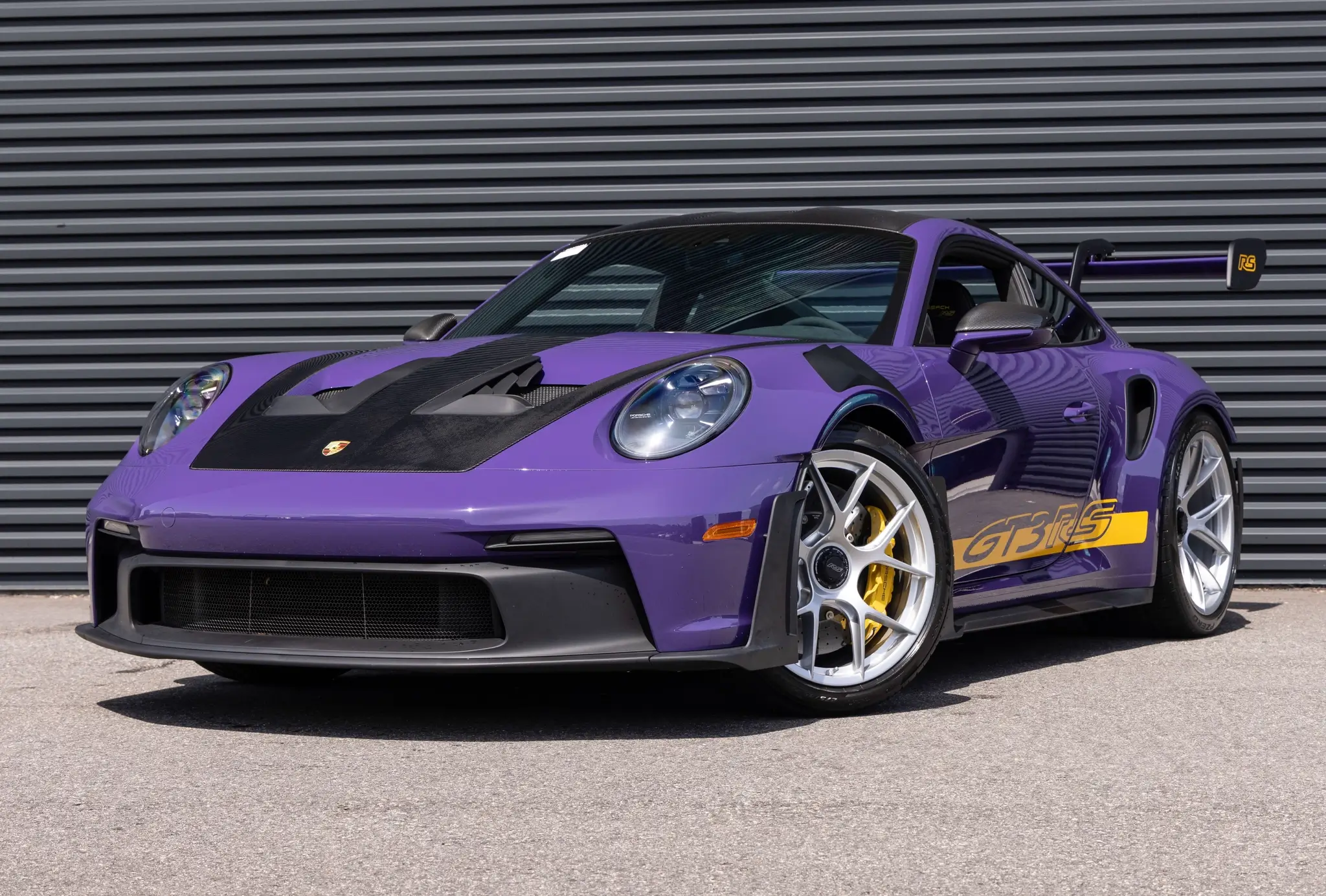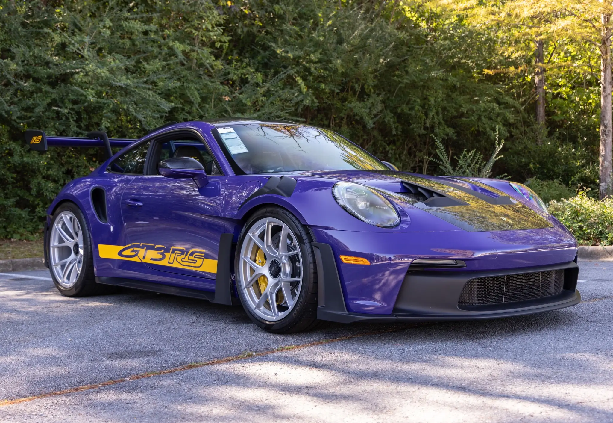 Specified in Paint to Sample Ultraviolet over Black leather and Race-Tex upholstery with yellow stitching, this 2025 Porsche 992 GT3 RS sits among the marque’s ultimate track-focused offerings.
