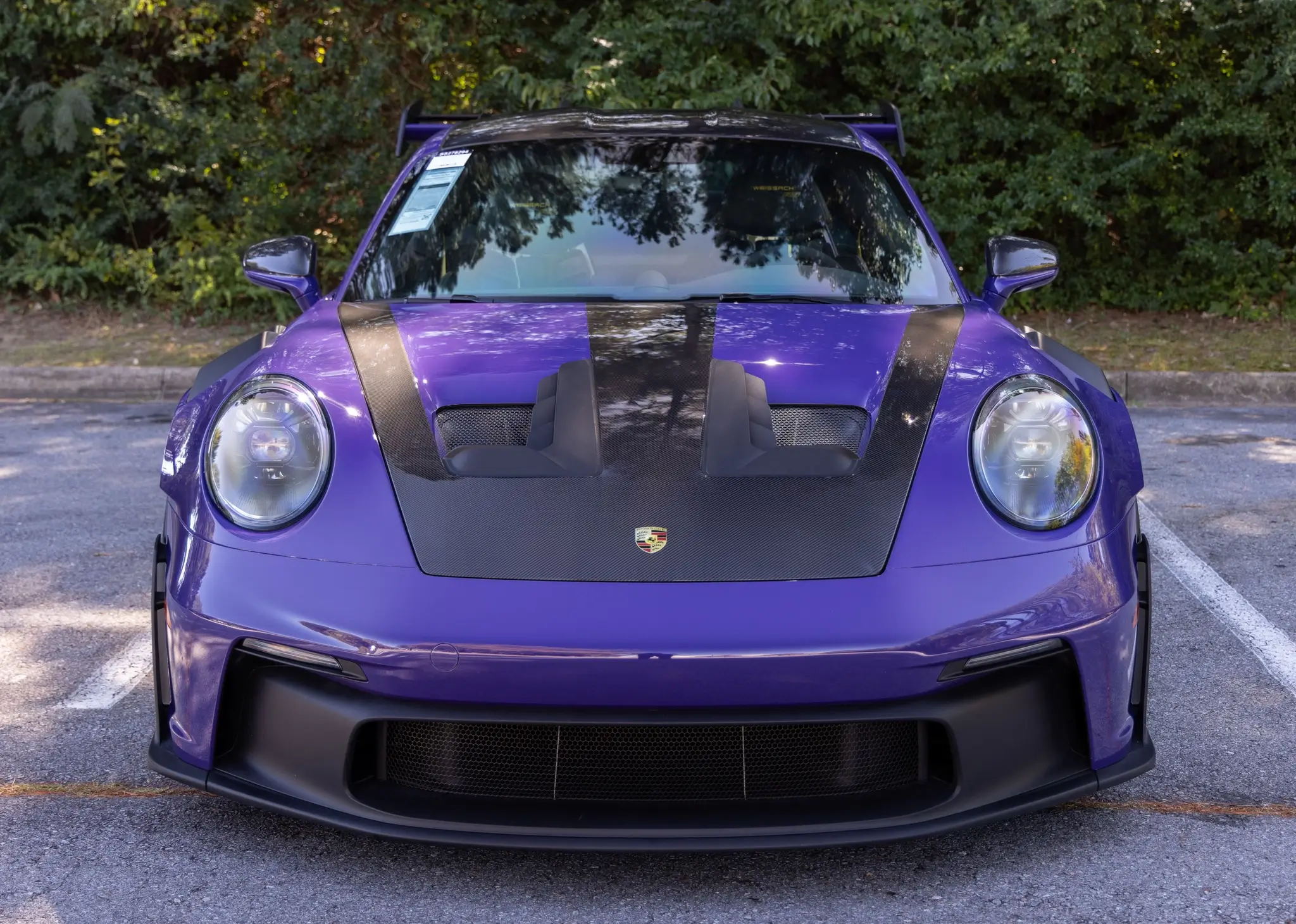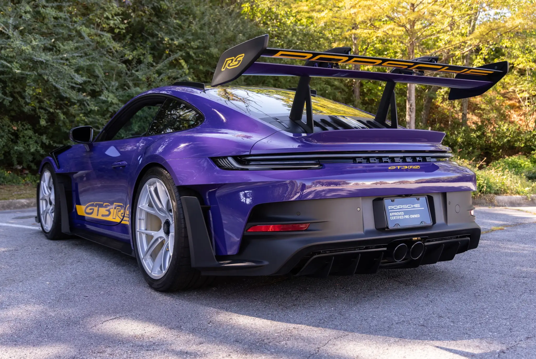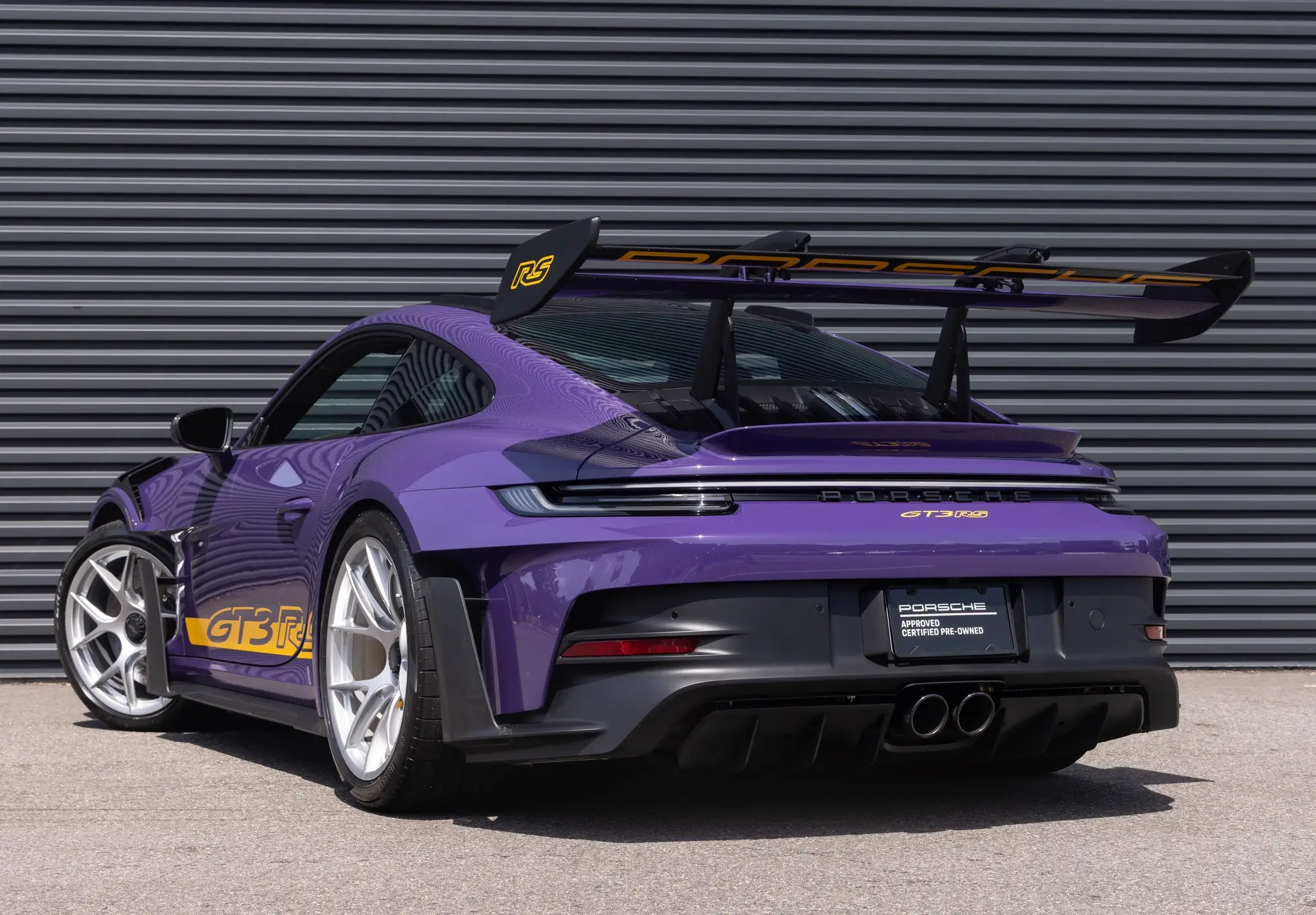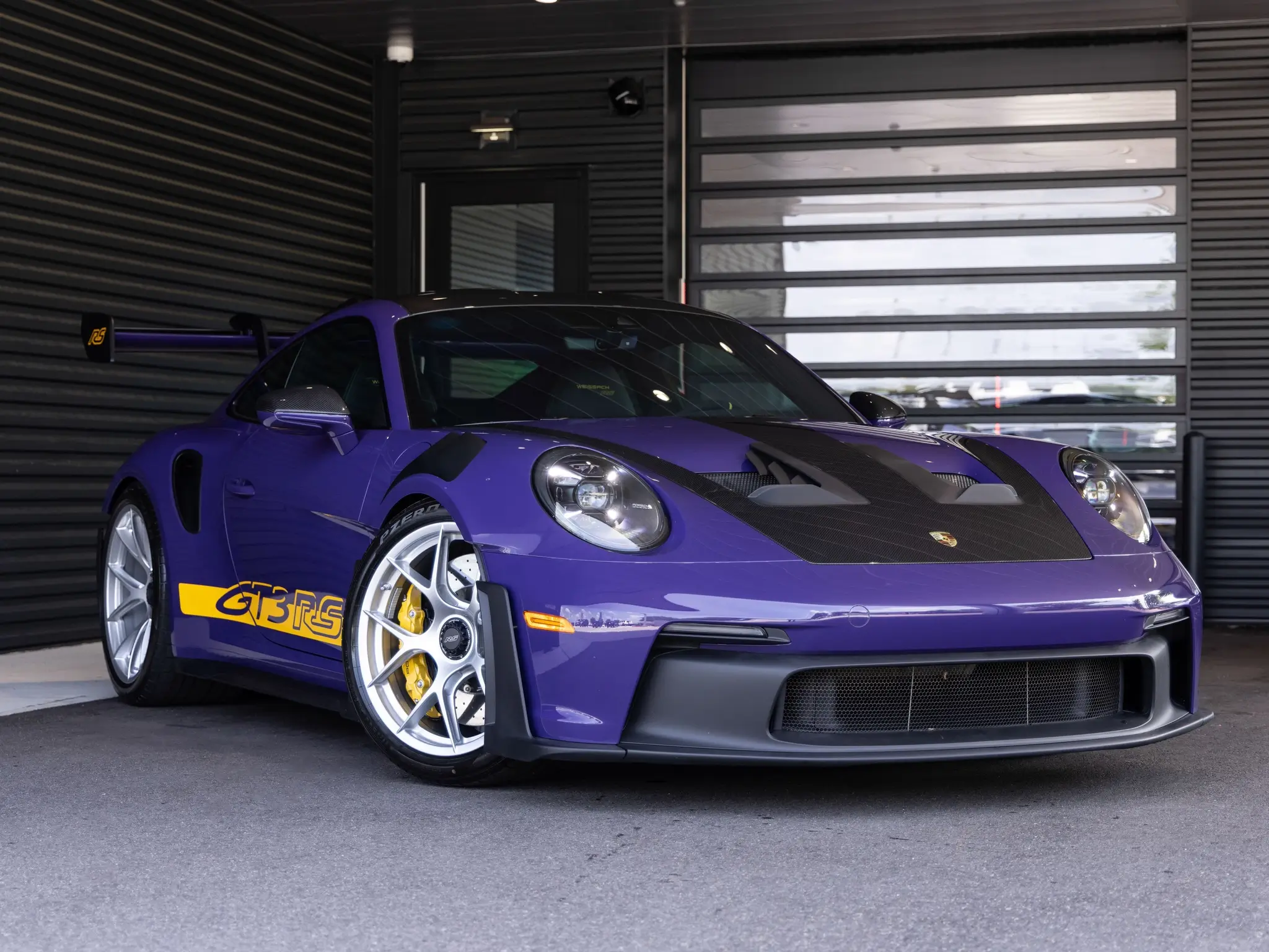 Specified in Paint to Sample Ultraviolet over Black leather and Race-Tex upholstery with yellow stitching, this 2025 Porsche 992 GT3 RS sits among the marque’s ultimate track-focused offerings.