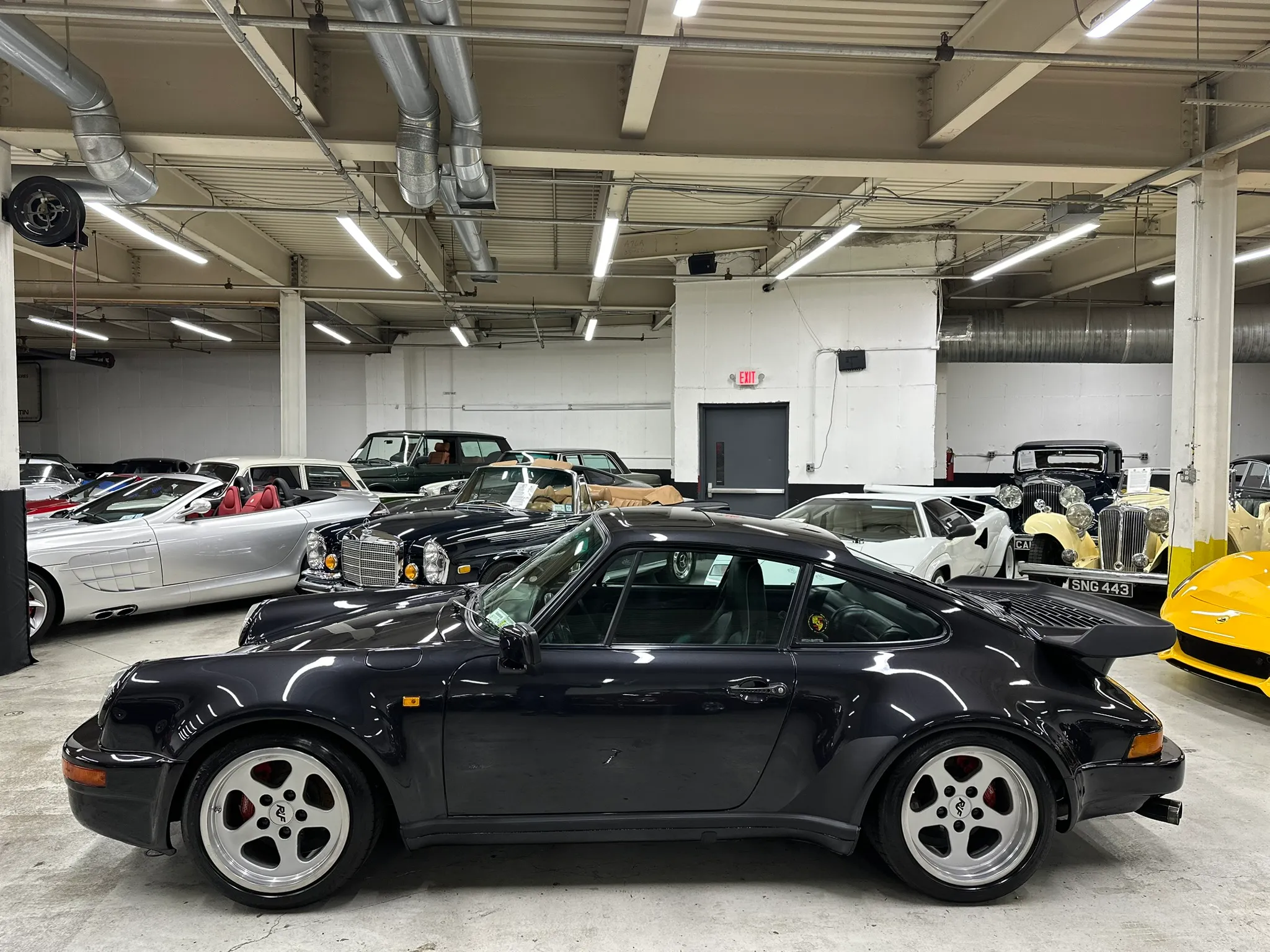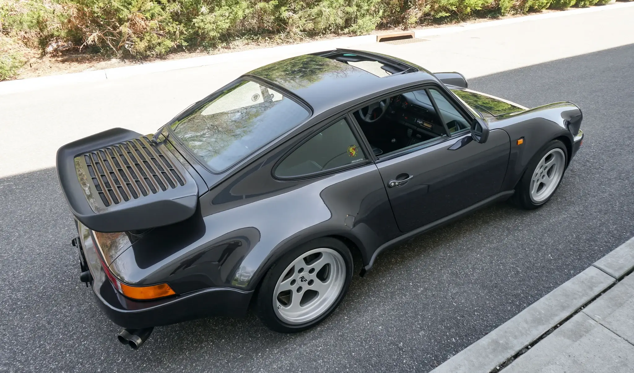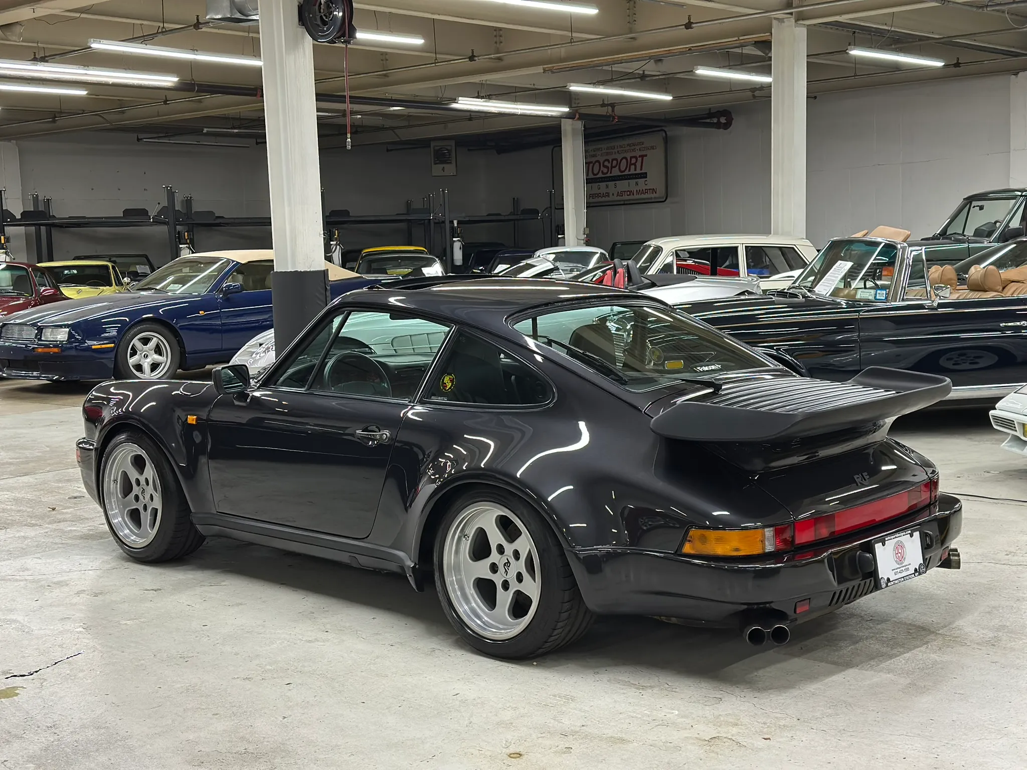 Work performed between 2024 and 2025 involved a repaint, dry ice cleaning of the underside, a rebuild of the turbocharged 3.4-liter Type 930 flat-six, and replacement of the clutch. Finished in Black Metallic over black leather, the car is equipped with a G50/50 five-speed manual transaxle with a limited-slip differential, cross-drilled and ventilated disc brakes, staggered-width 17″ RUF Speedline wheels, Bilstein shocks, RUF front and rear valances, a sunroof, heated sport seats, air conditioning, and power windows.