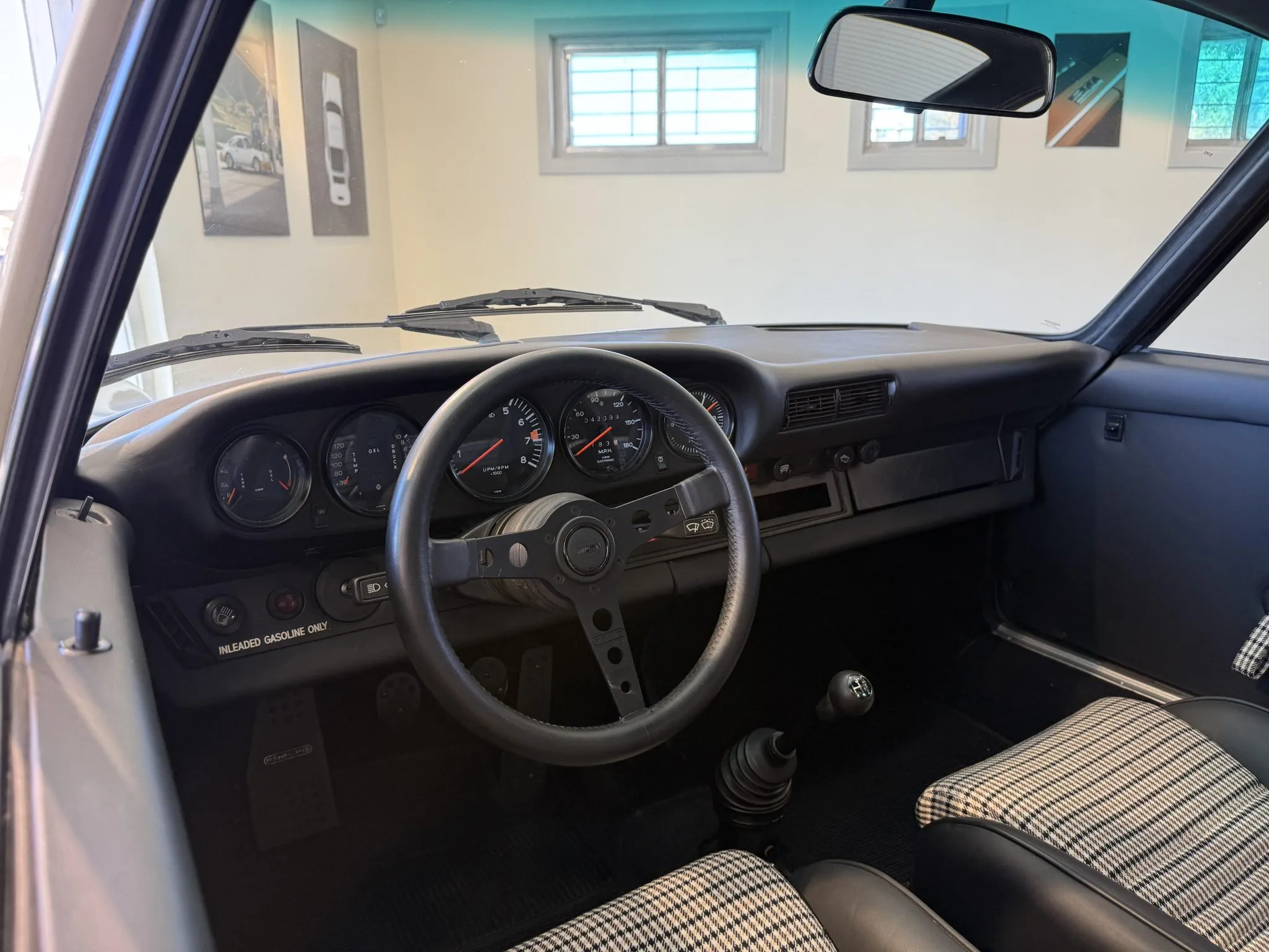 Inside, the front sport seats and individual rear seats have been re-trimmed in black with patterned inserts, the dash has been recovered, and the cabin has been equipped with an electric air conditioning system, a MOMO steering wheel, a RennShift shifter, and a Rennline pedal set and floor boards. The car rides on refurbished 16″ Fuchs wheels and has a revised four-disc brake setup, a whale-tale spoiler, a sunroof, and RS-style door panels.