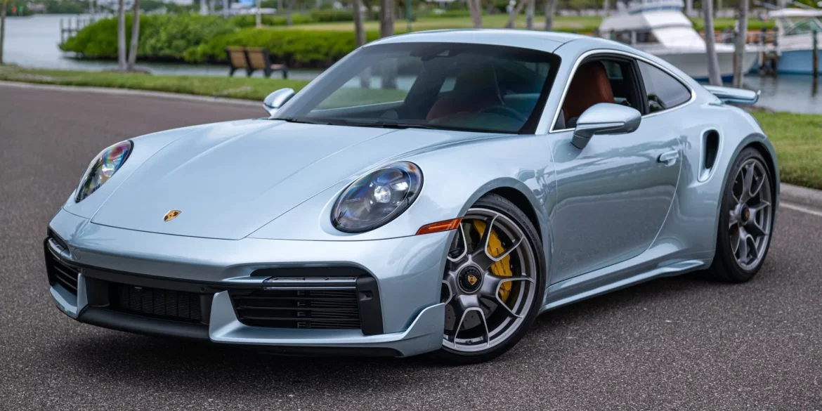 This 2024 Porsche 911 Turbo S coupe was optioned from the factory with the Classic Heritage Design and SportDesign packages, and it is finished in paint-to-sample Azzuro Thetys Metallic over black and Classic Cognac leather with Pepita-style cloth inserts. Powered by a twin-turbocharged 3.7L flat-six linked with an eight-speed PDK...