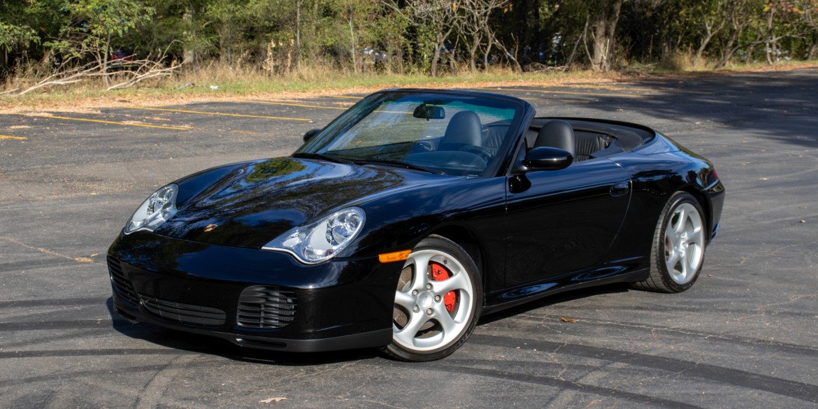 This 2004 Porsche 911 Carrera 4S is a black-over-black cabriolet powered by a 3.6-liter flat-six that drives all four wheels through a six-speed manual transaxle. It features a black convertible top, a Sport exhaust system, xenon headlights, an aftermarket rear spoiler, and 19″ Carrera Sport wheels along with heated power-adjustable...