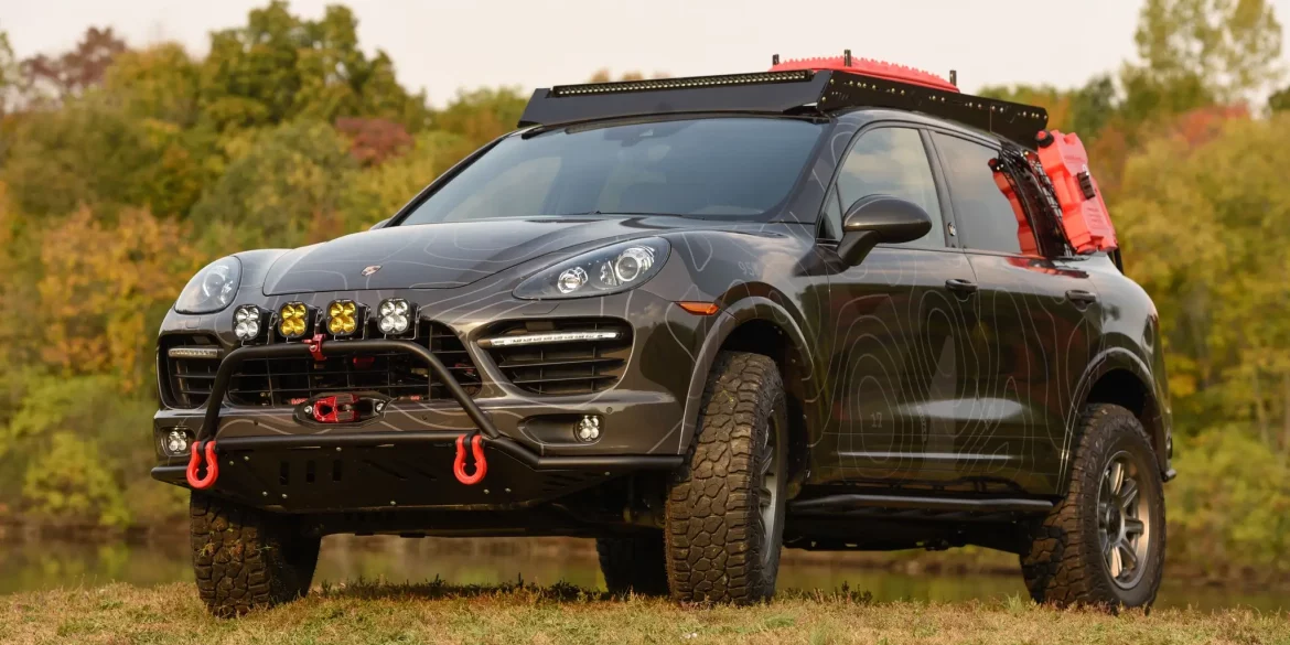 Finished in Jet Black Metallic over Black leather and Alcantara upholstery, this 2014 Porsche Cayenne has been modified with a topography-themed exterior wrap, various Eurowise body protection, JRZ coilovers, a coil spring conversion while maintaining the PDCC system, Baja Designs off-road lighting, and a WARN winch system. Sporting Turbo bodywork...
