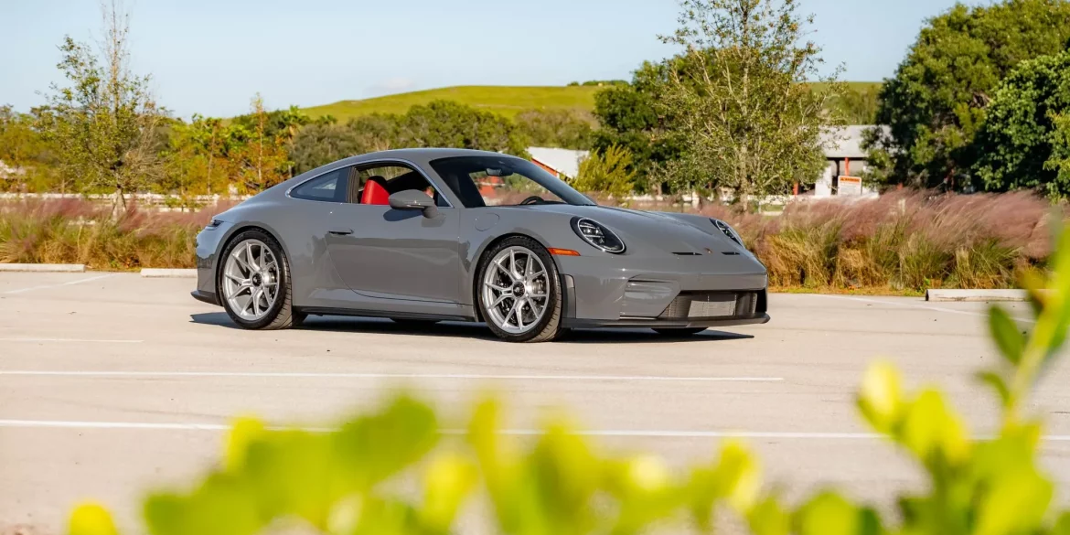 This 2026 Porsche 911 GT3 Touring was specified from the factory in Slate Grey Neo over an Extended Exclusive Manufaktur Leather Interior trimmed in Guards Red leather. The car is powered by a 4.0-liter flat-six linked with a six-speed manual transaxle with a Porsche Torque Vectoring Plus electronically locking differential...