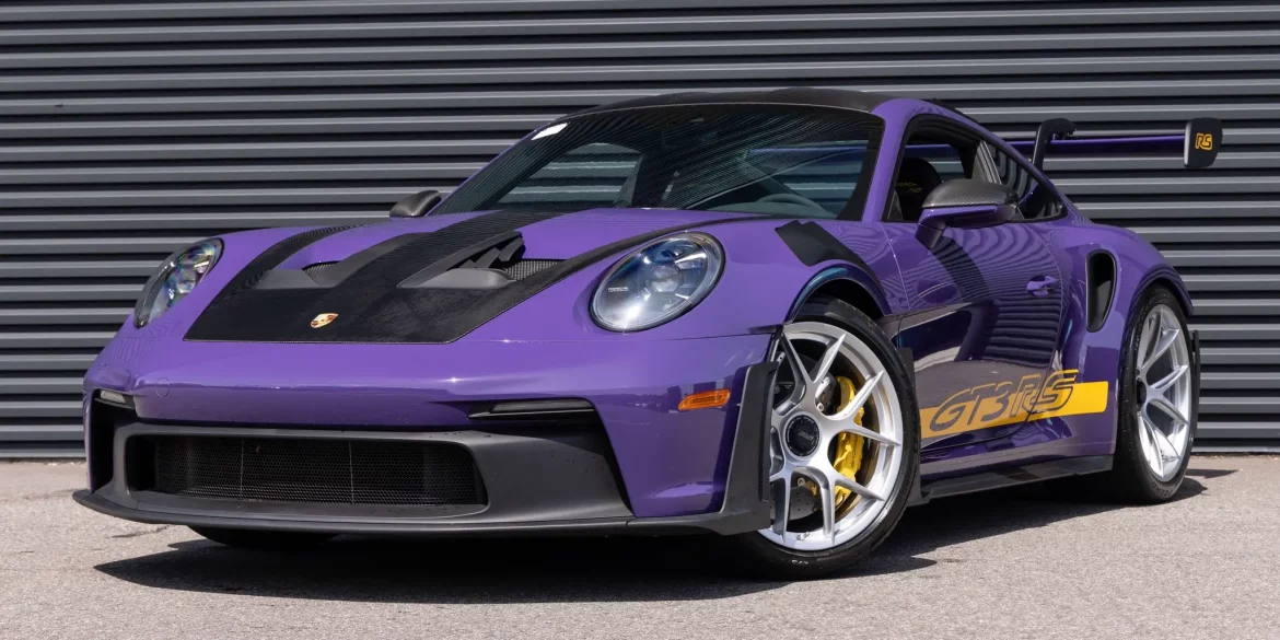 Specified in Paint to Sample Ultraviolet over Black leather and Race-Tex upholstery with yellow stitching, this 2025 Porsche 992 GT3 RS sits among the marque’s ultimate track-focused offerings. This example features the optional Weissach Package, Porsche Ceramic Composite Brakes (PCCB), the Front Axle Lift System, LED-Matrix Design headlights in Black...