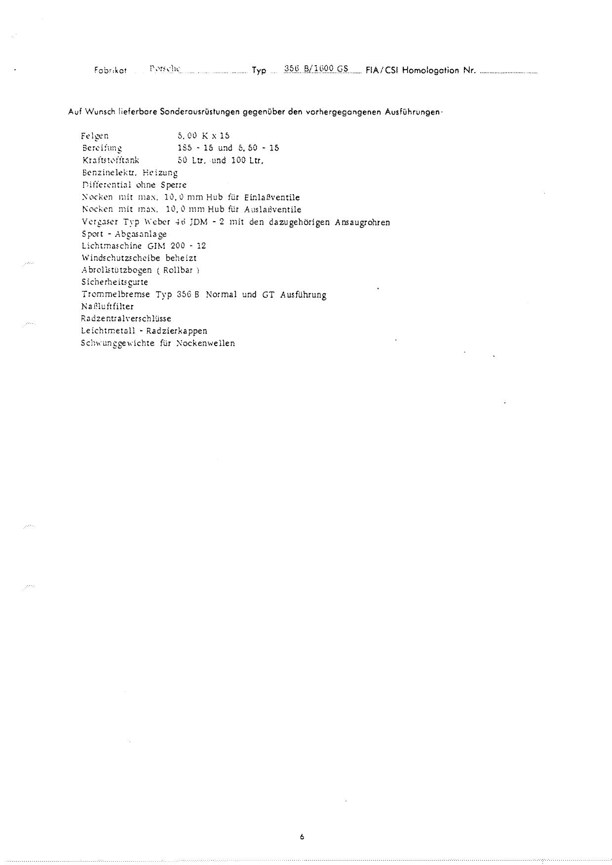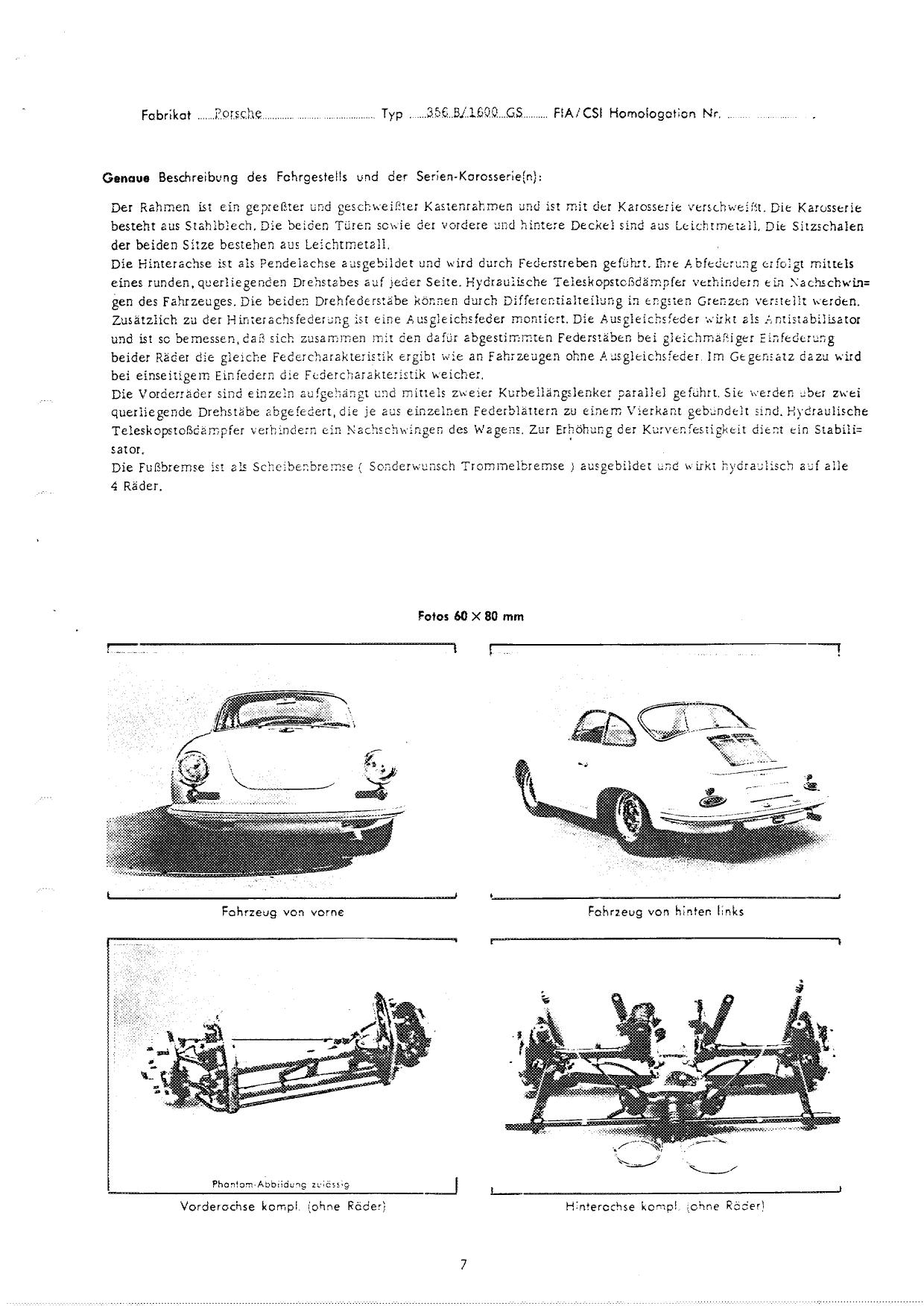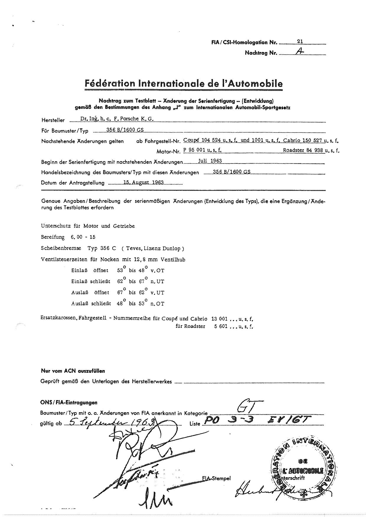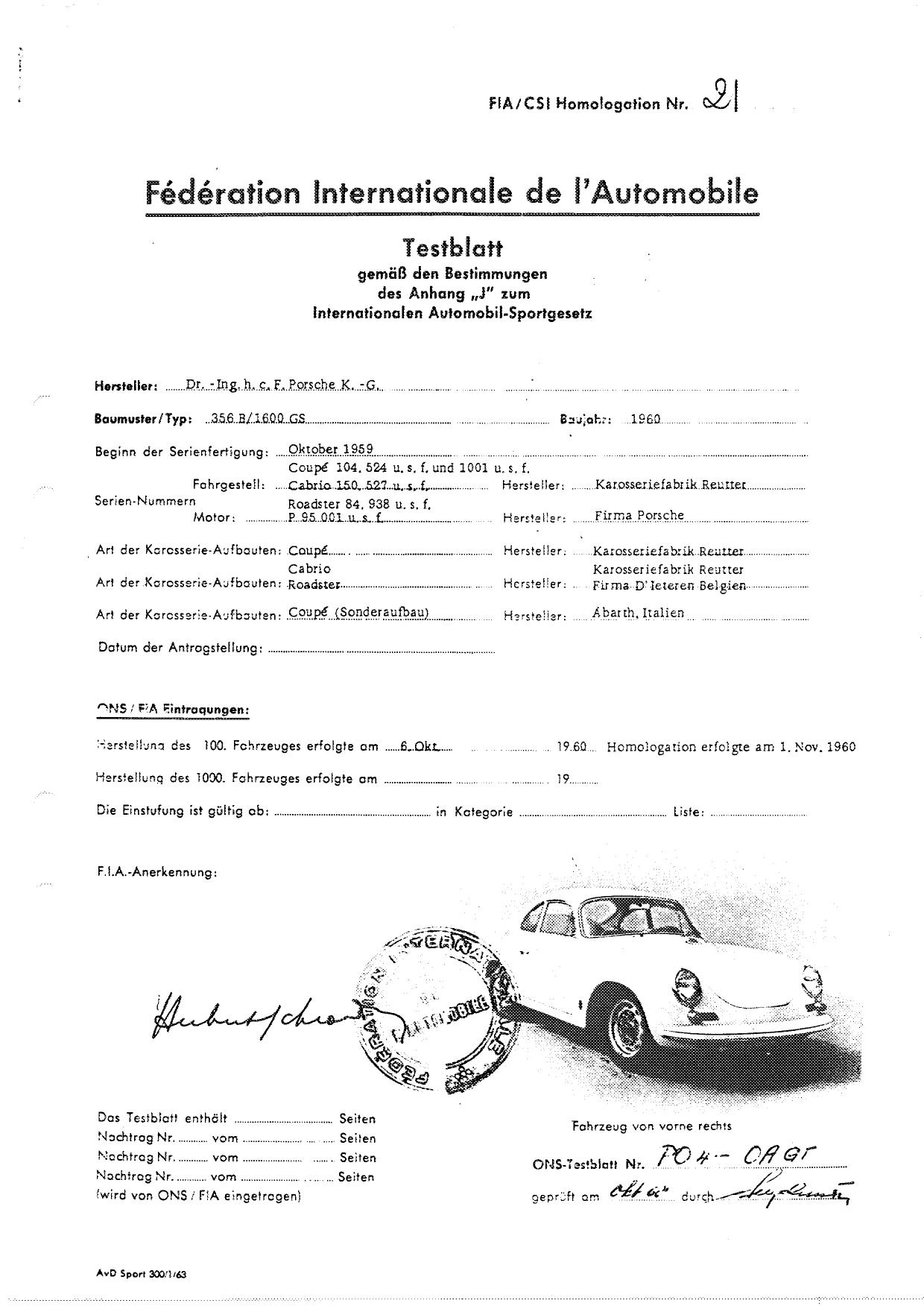 FIA Homologation Protocol for Porsche-356 B 1600 GS, 1960