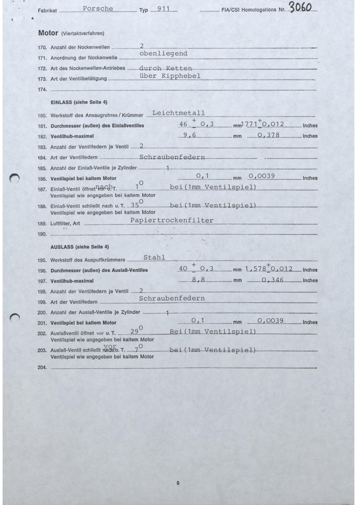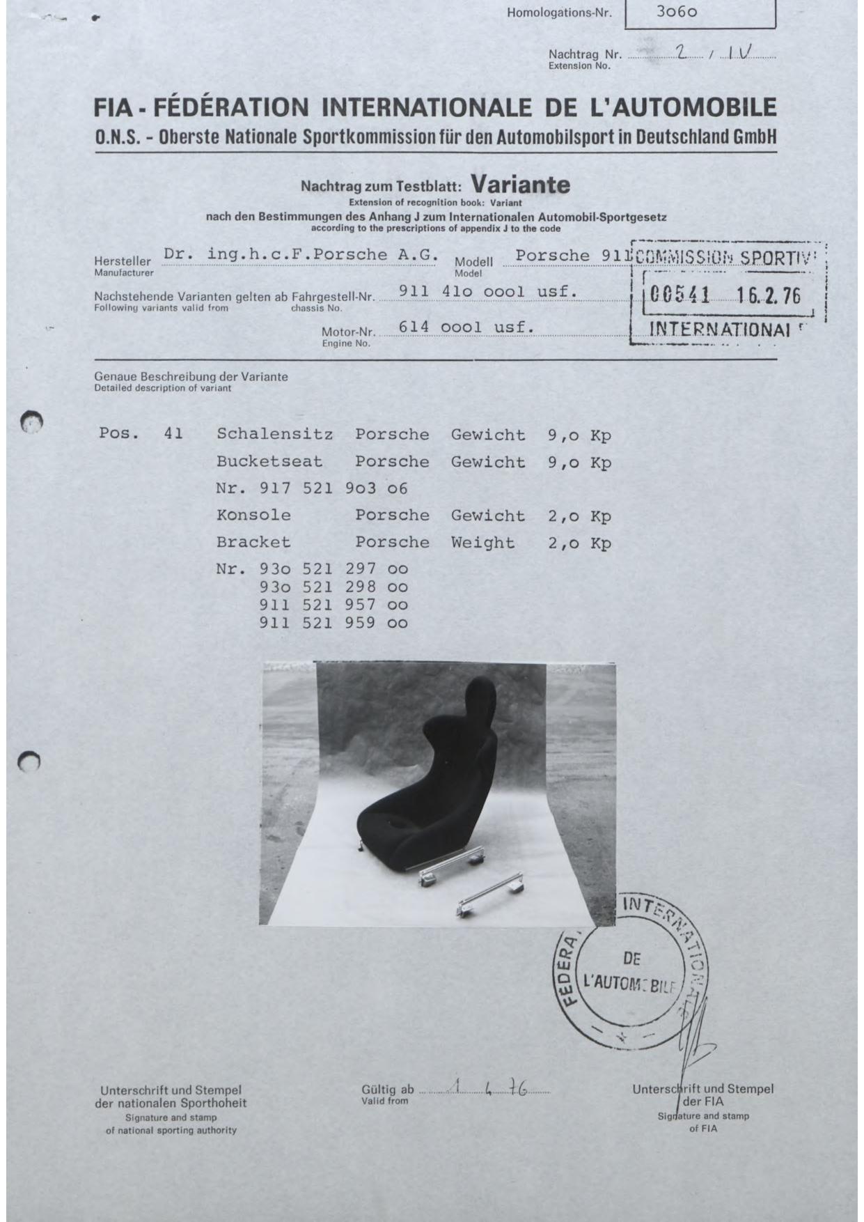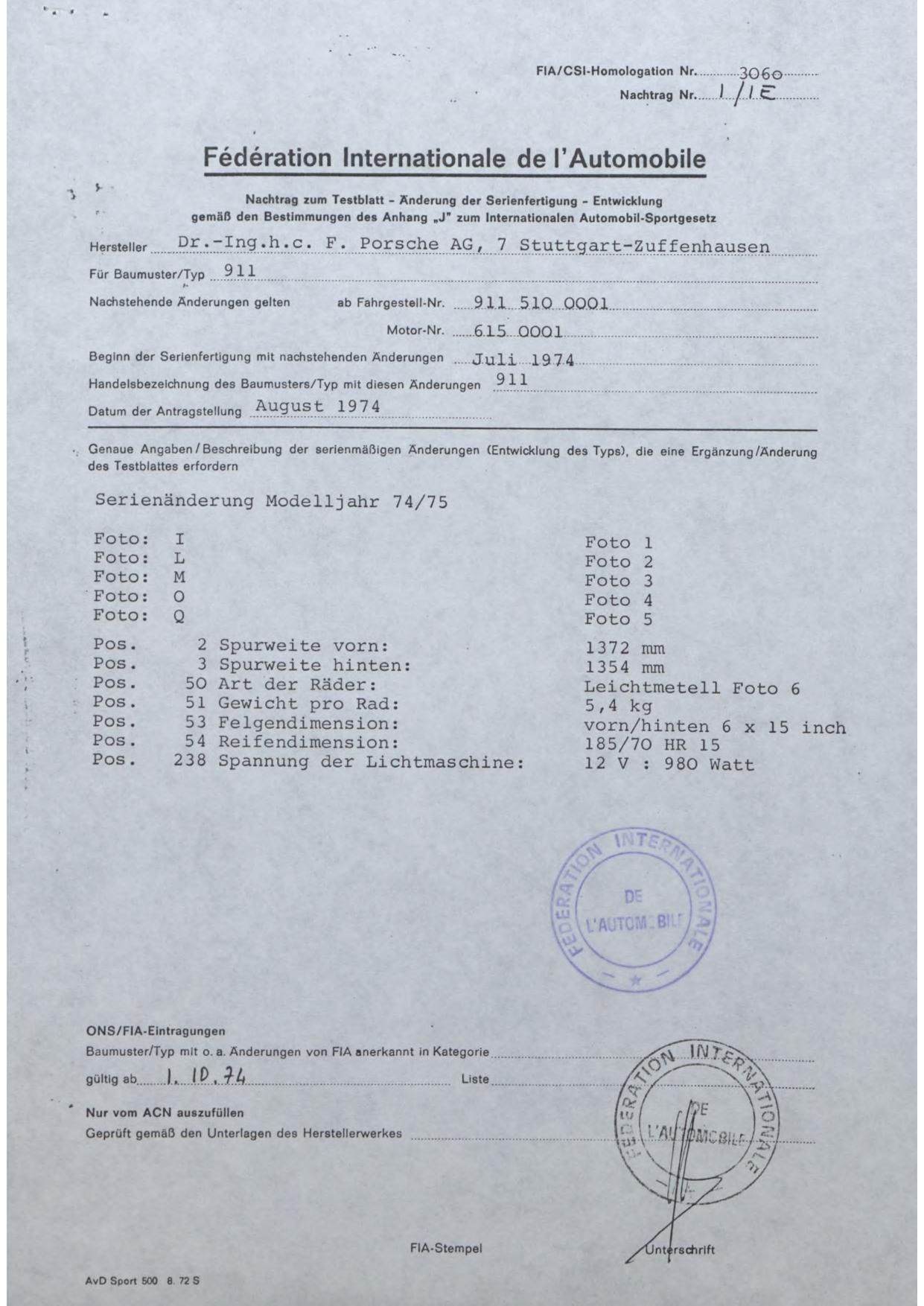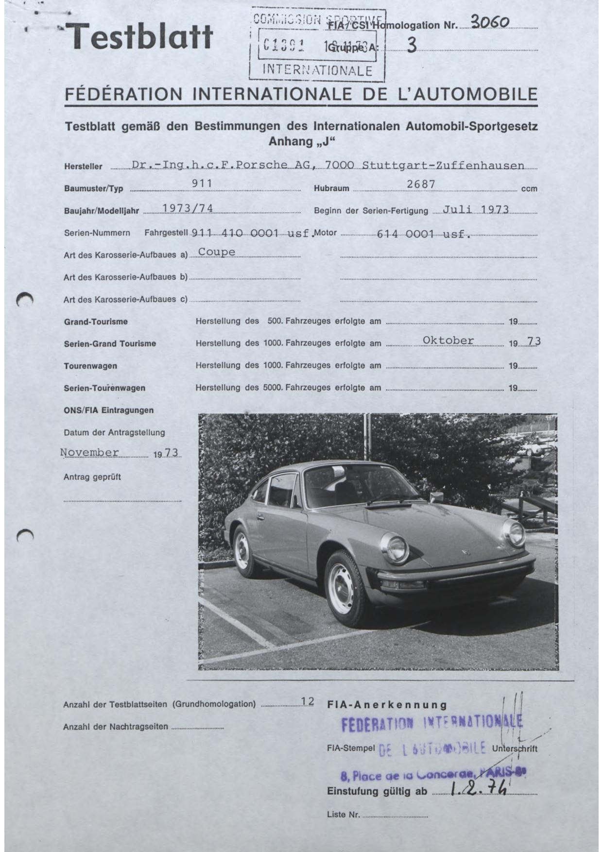 FIA Homologation Protocol for Porsche-911 2.7, 1973