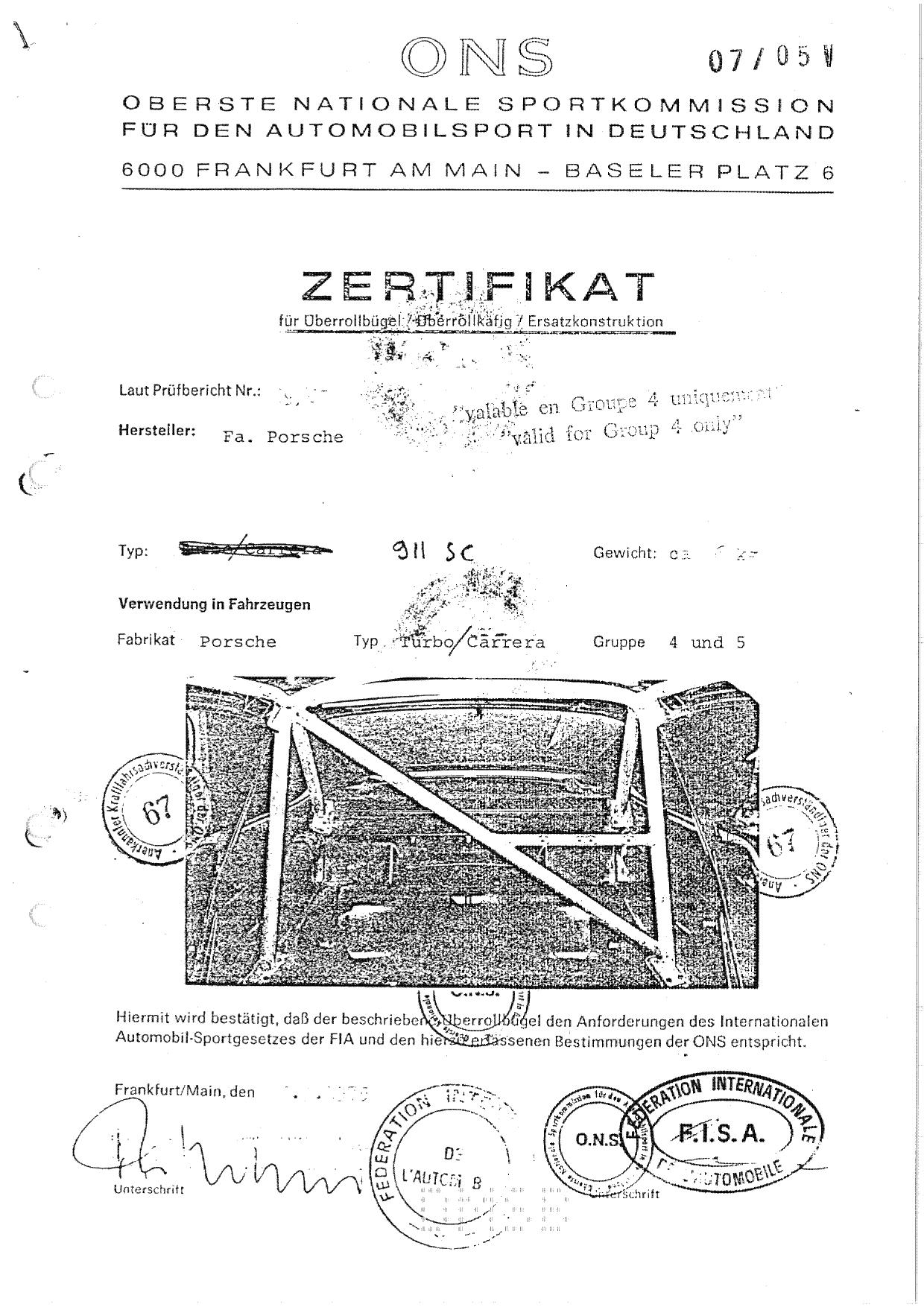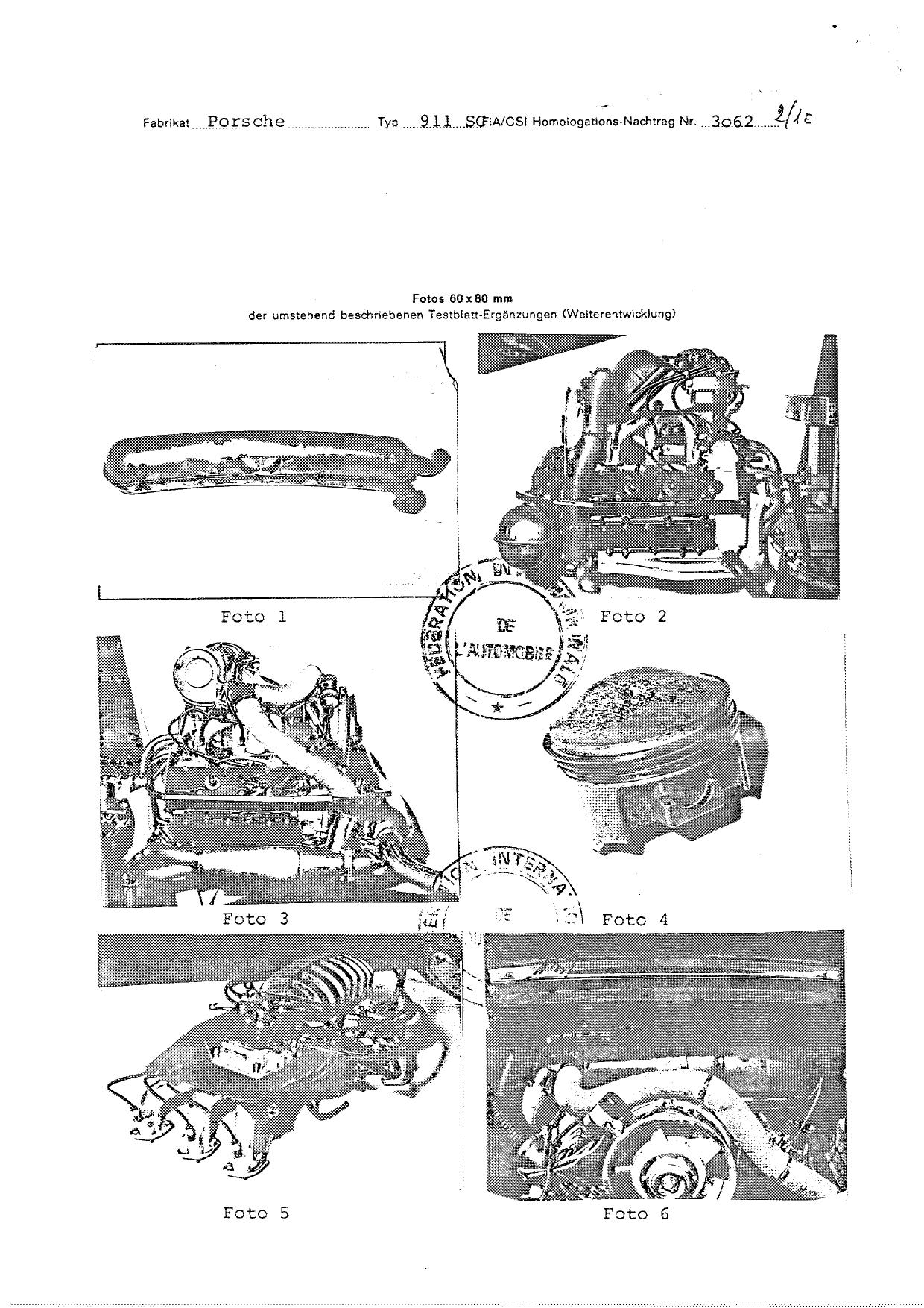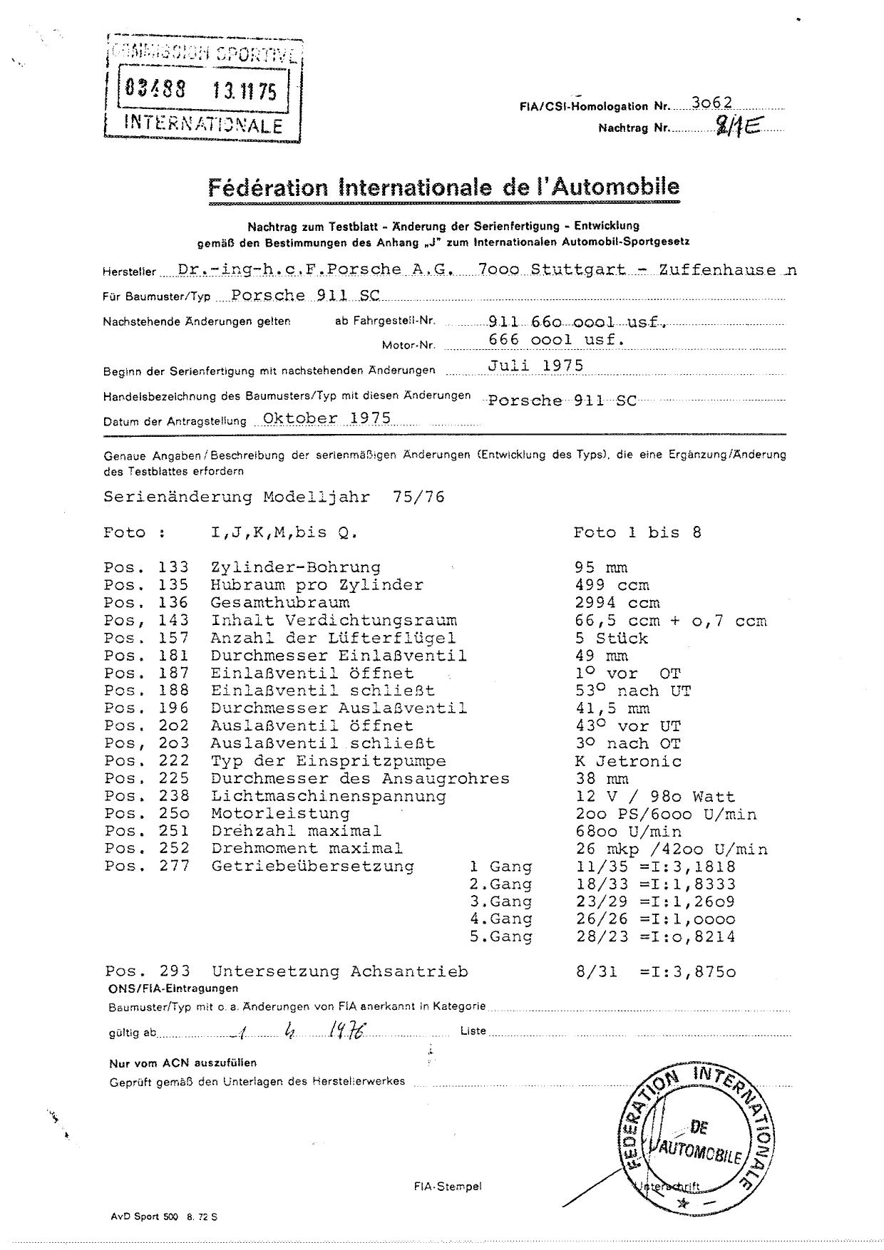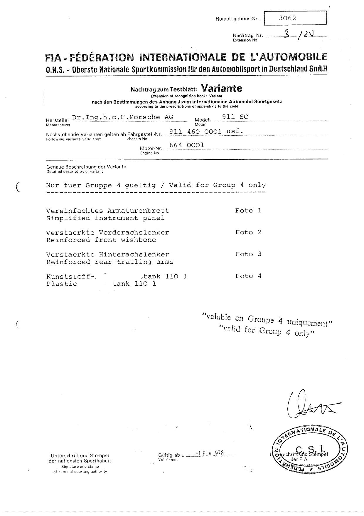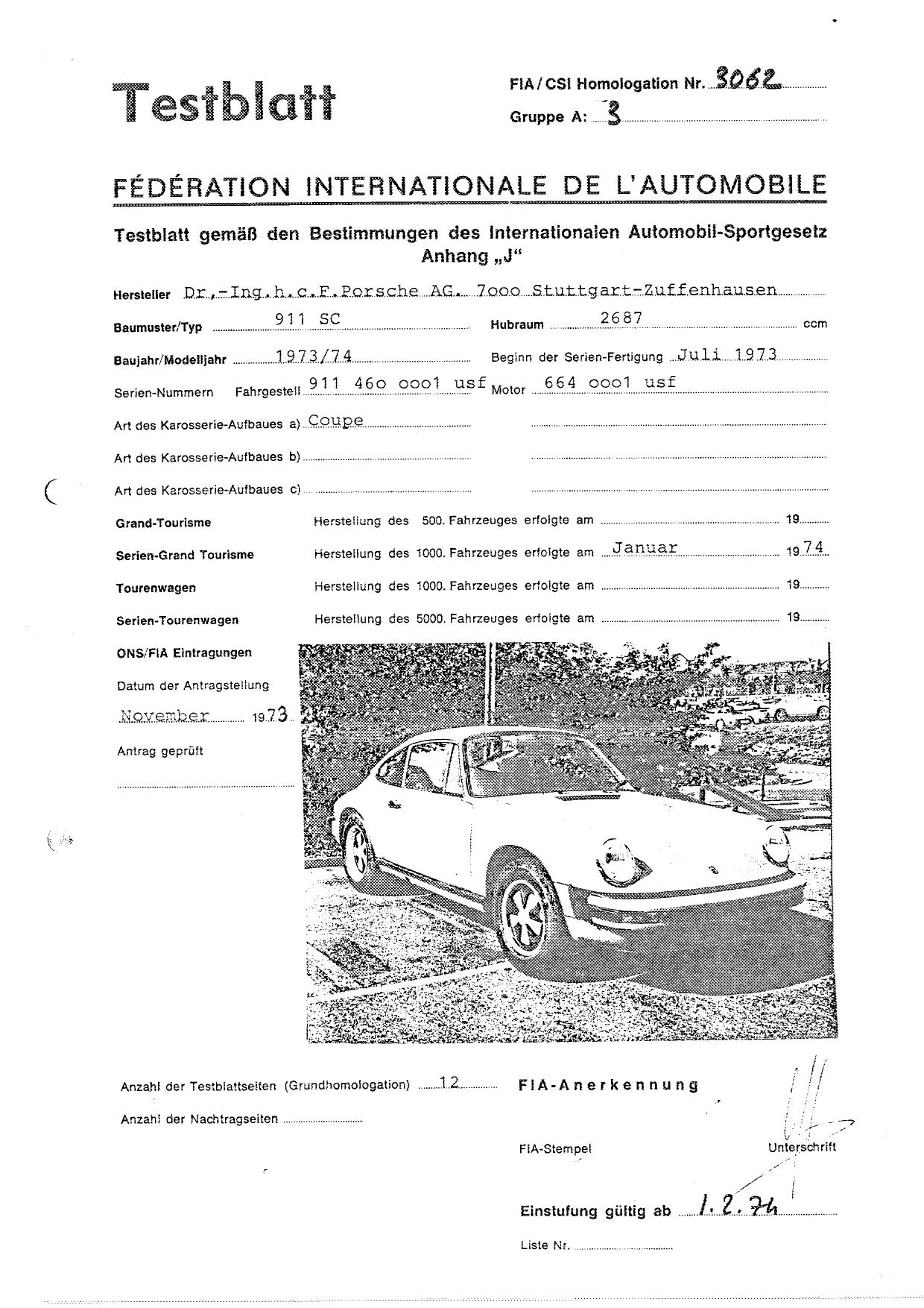 FIA Homologation Protocol for Porsche 911 Carrera 2.7 chassis #911 460 0001
