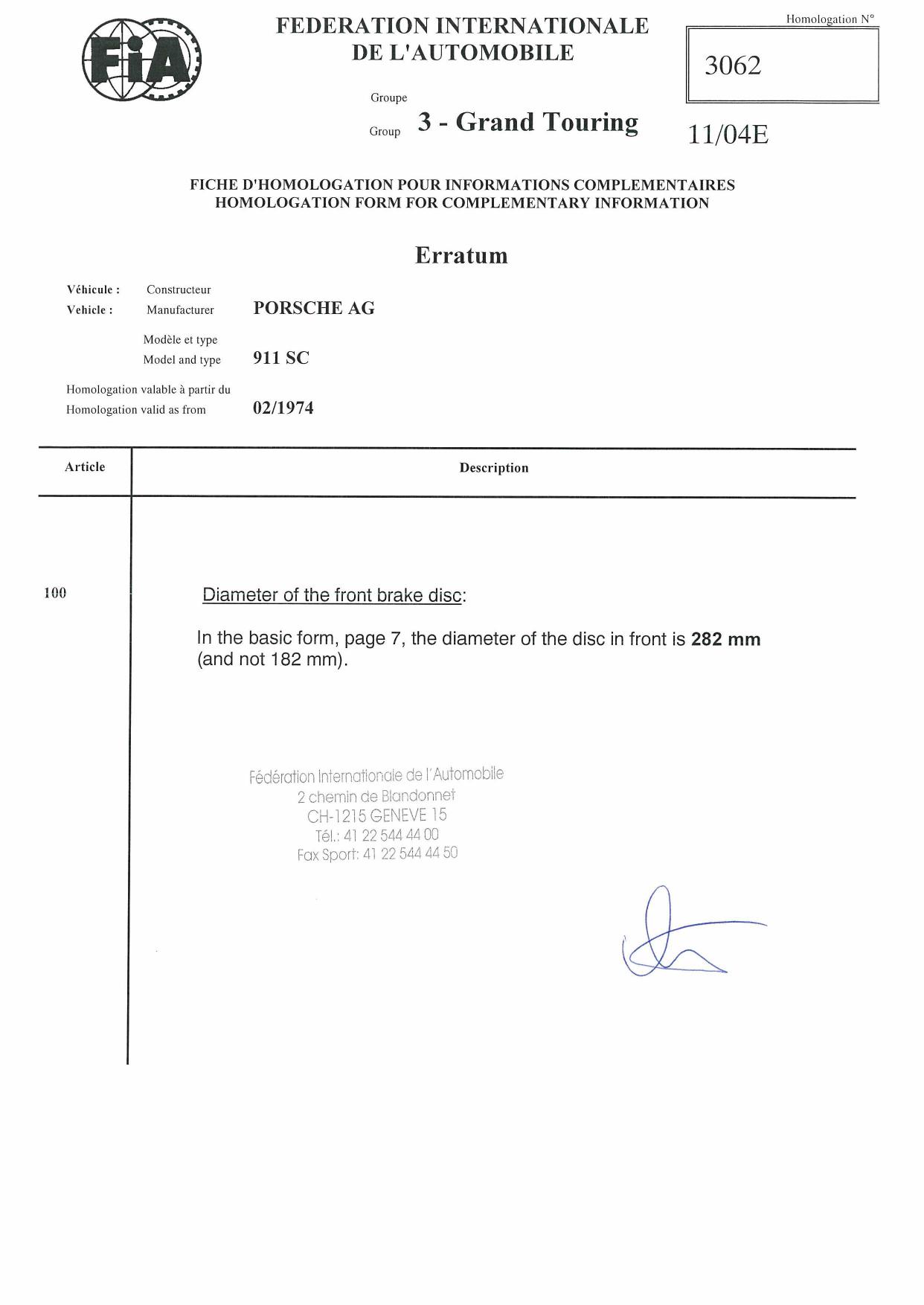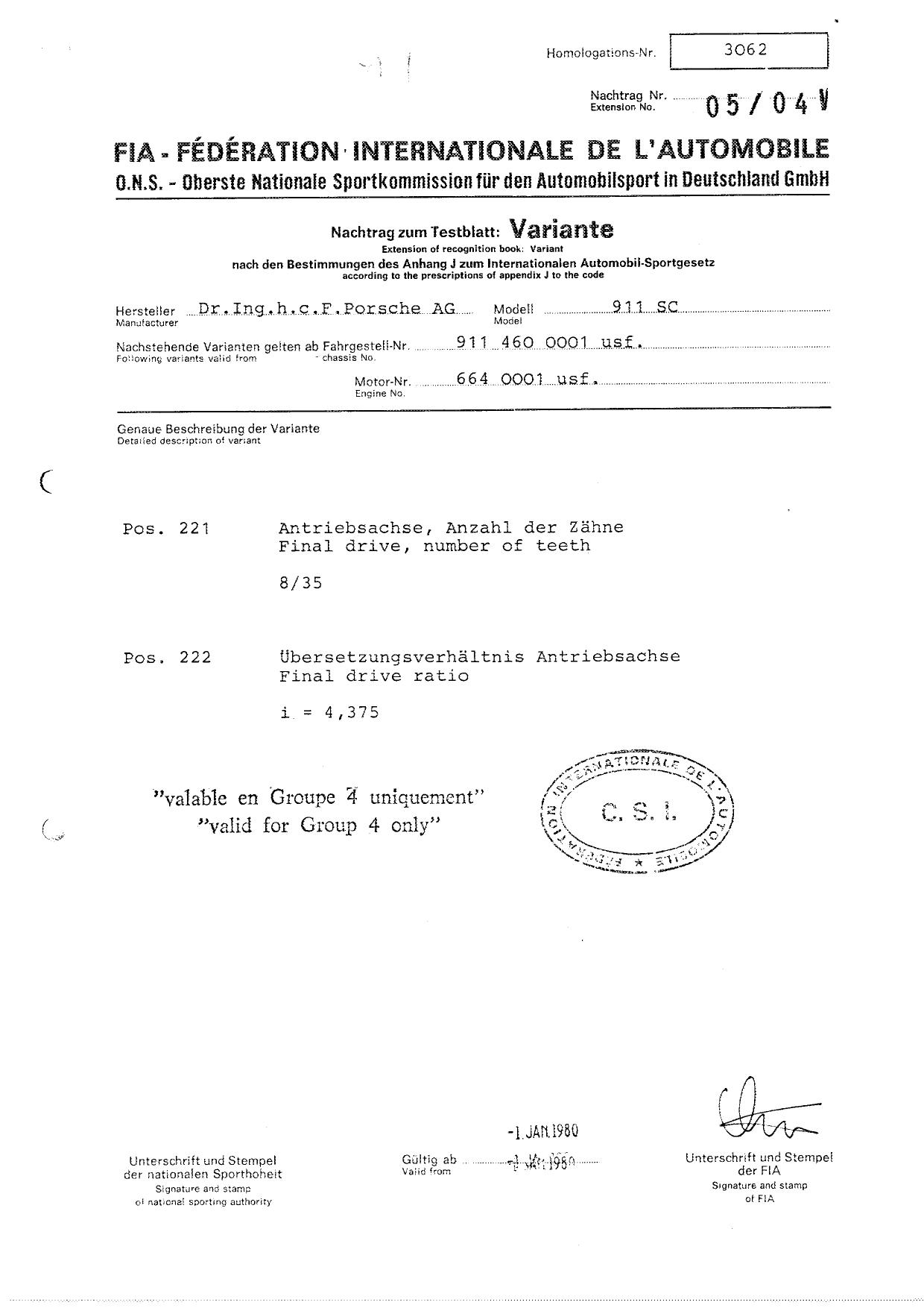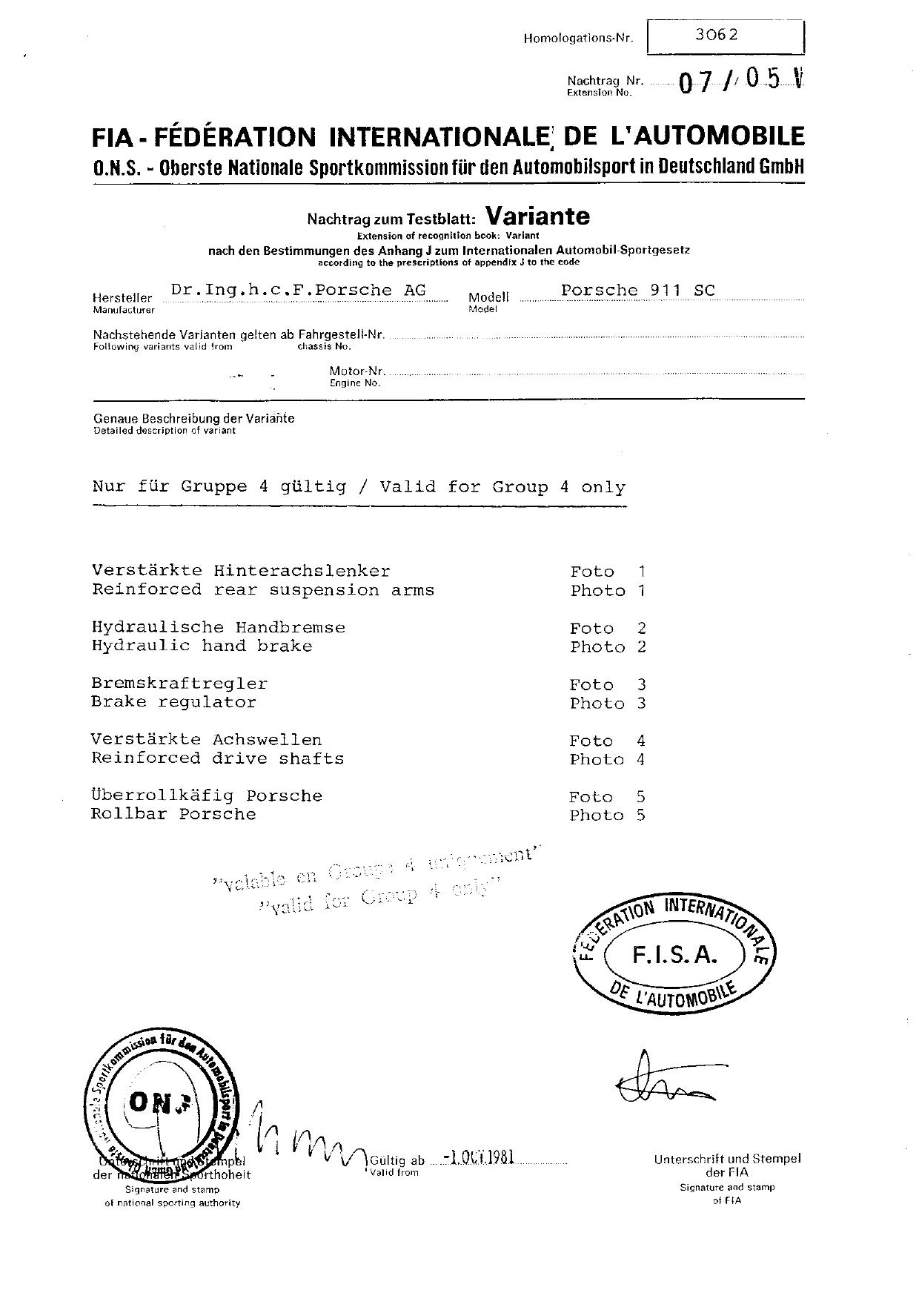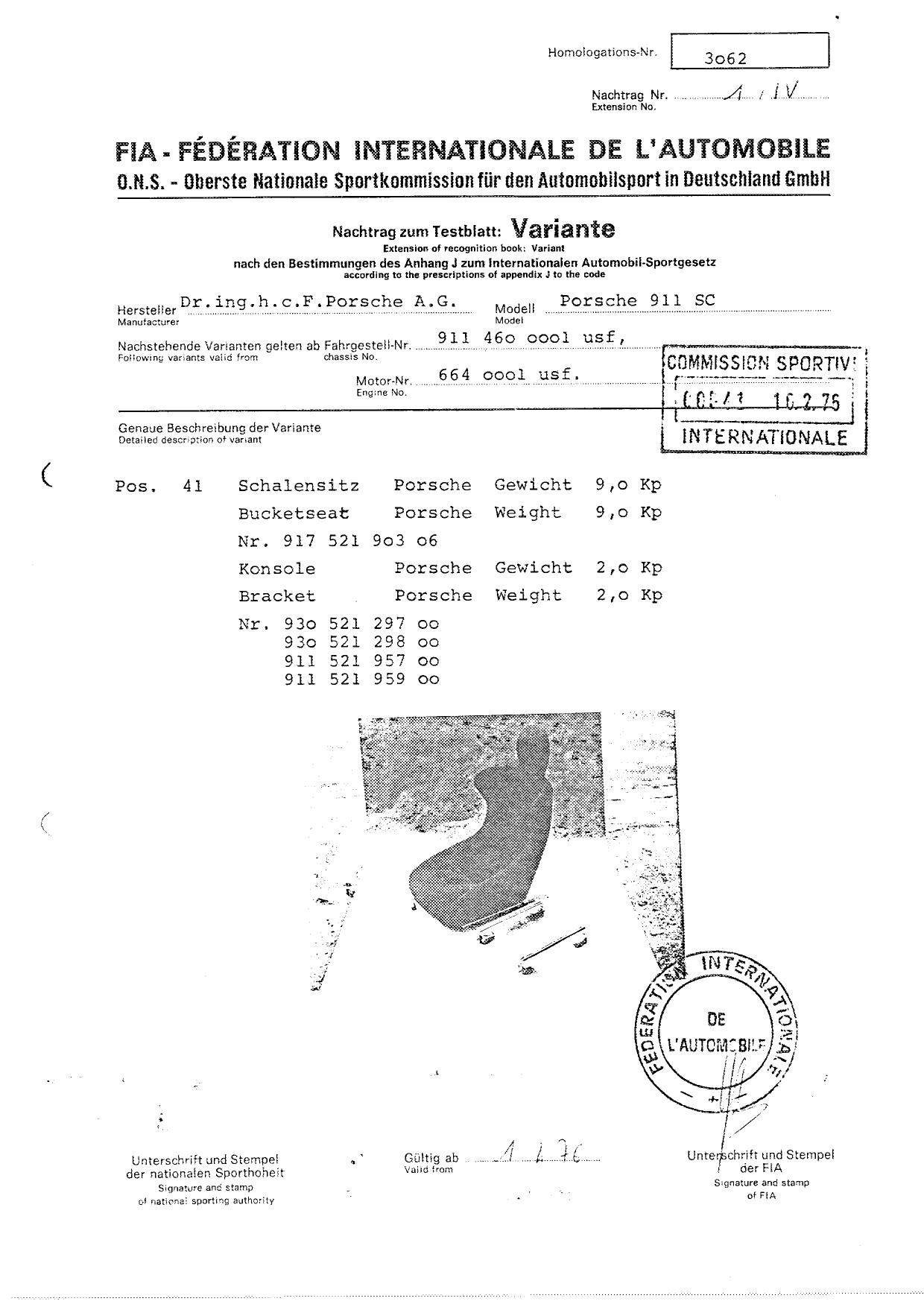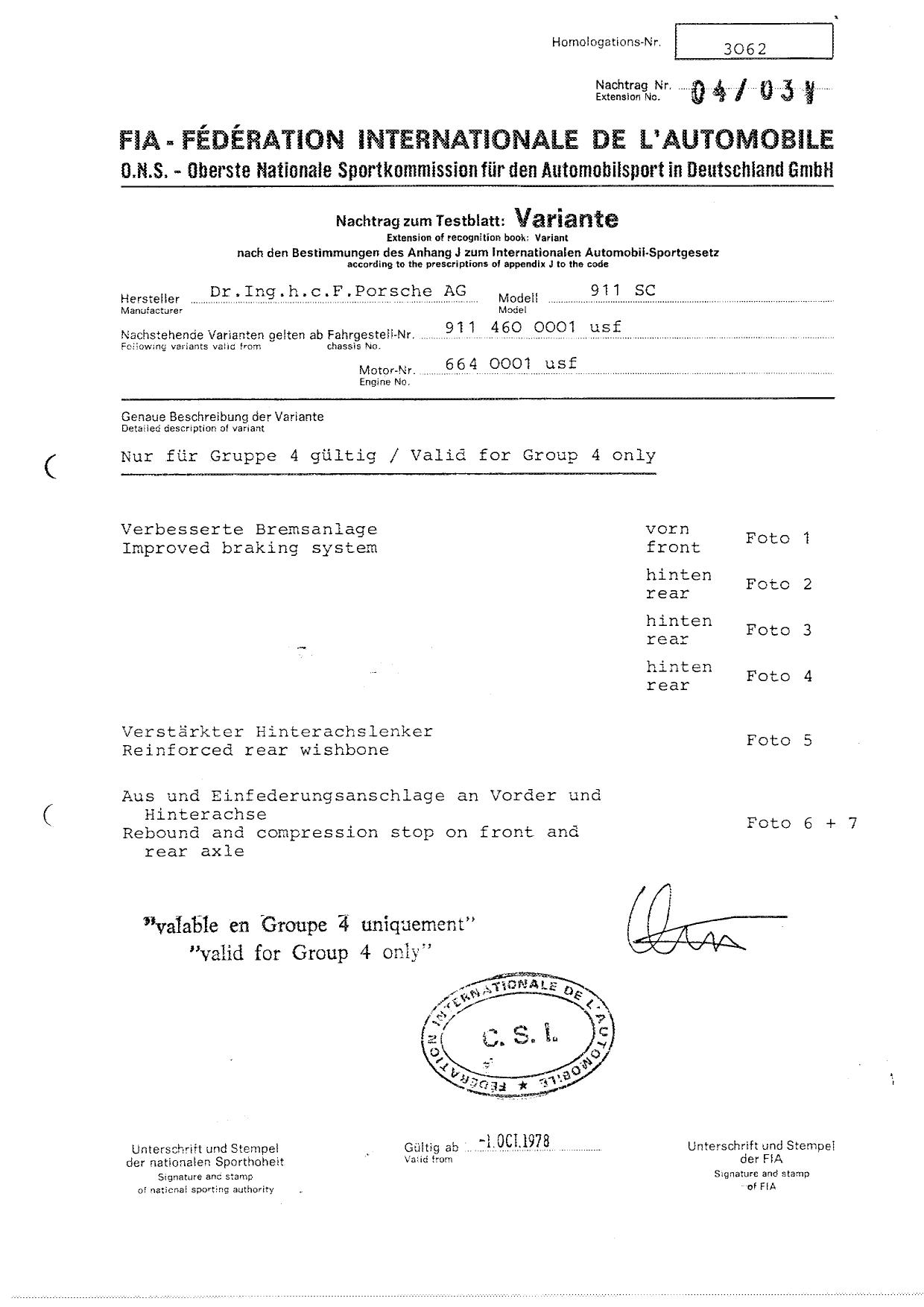 FIA Homologation Protocol for Porsche 911 Carrera 2.7 chassis #911 460 0001