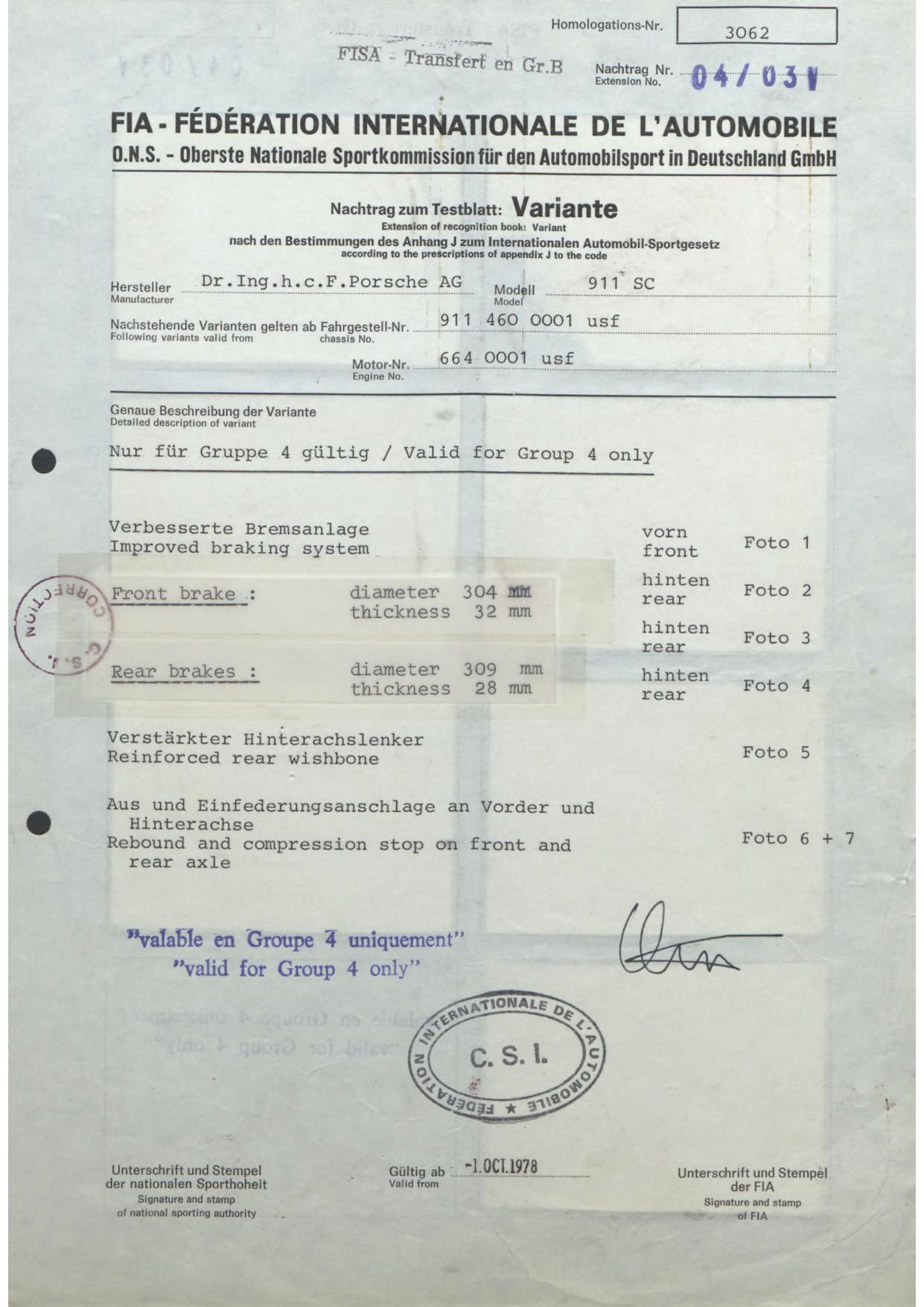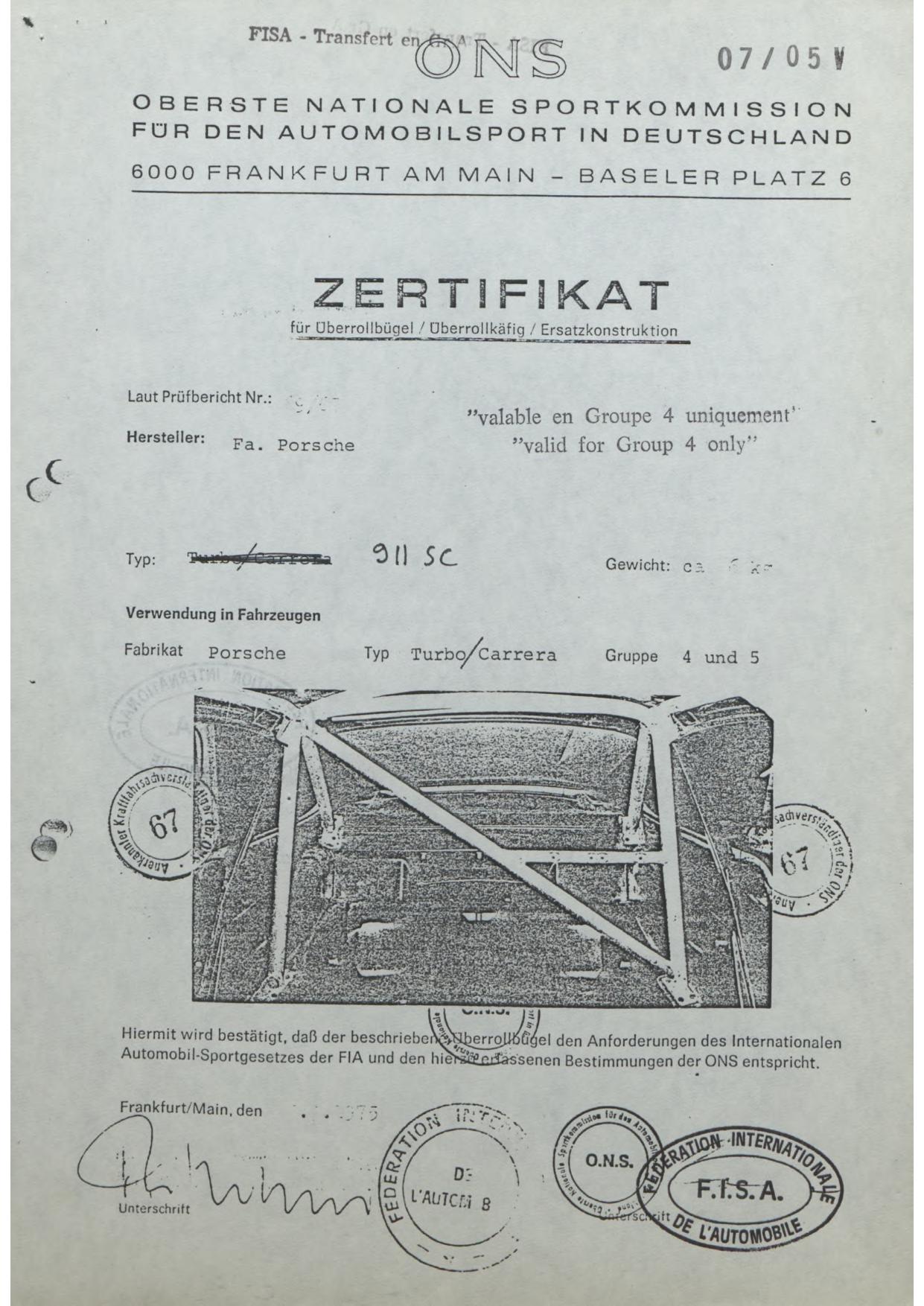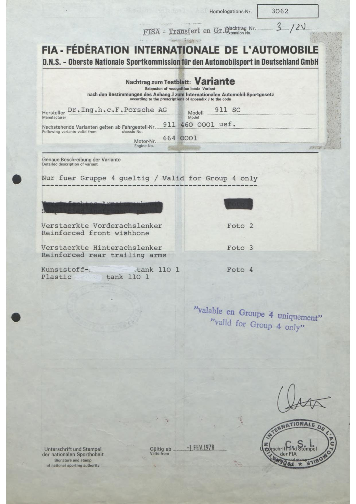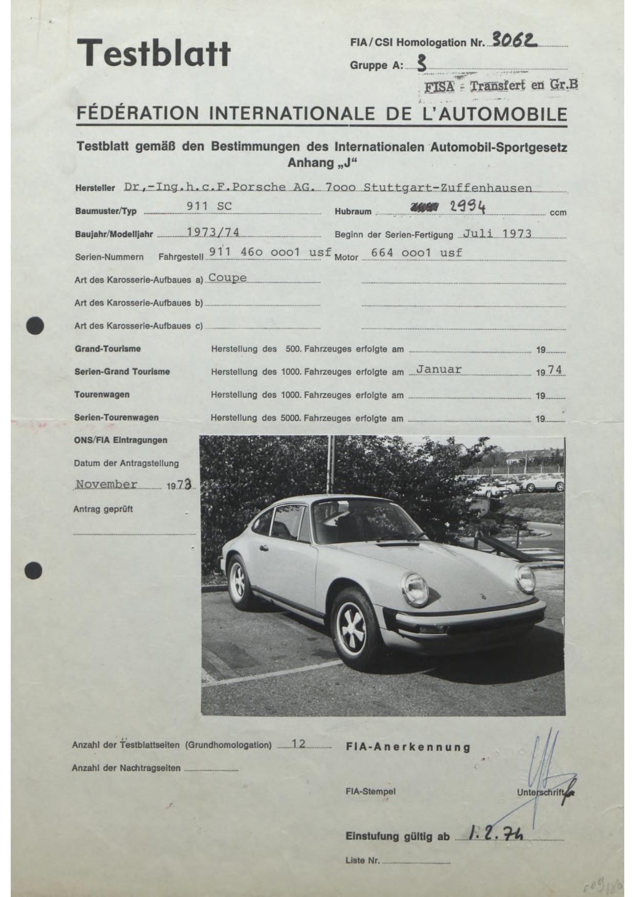 FIA Homologation Protocol for Porsche-911 Carrera 2.7 with 3.0 engine type 911/74 for IROC, 1973