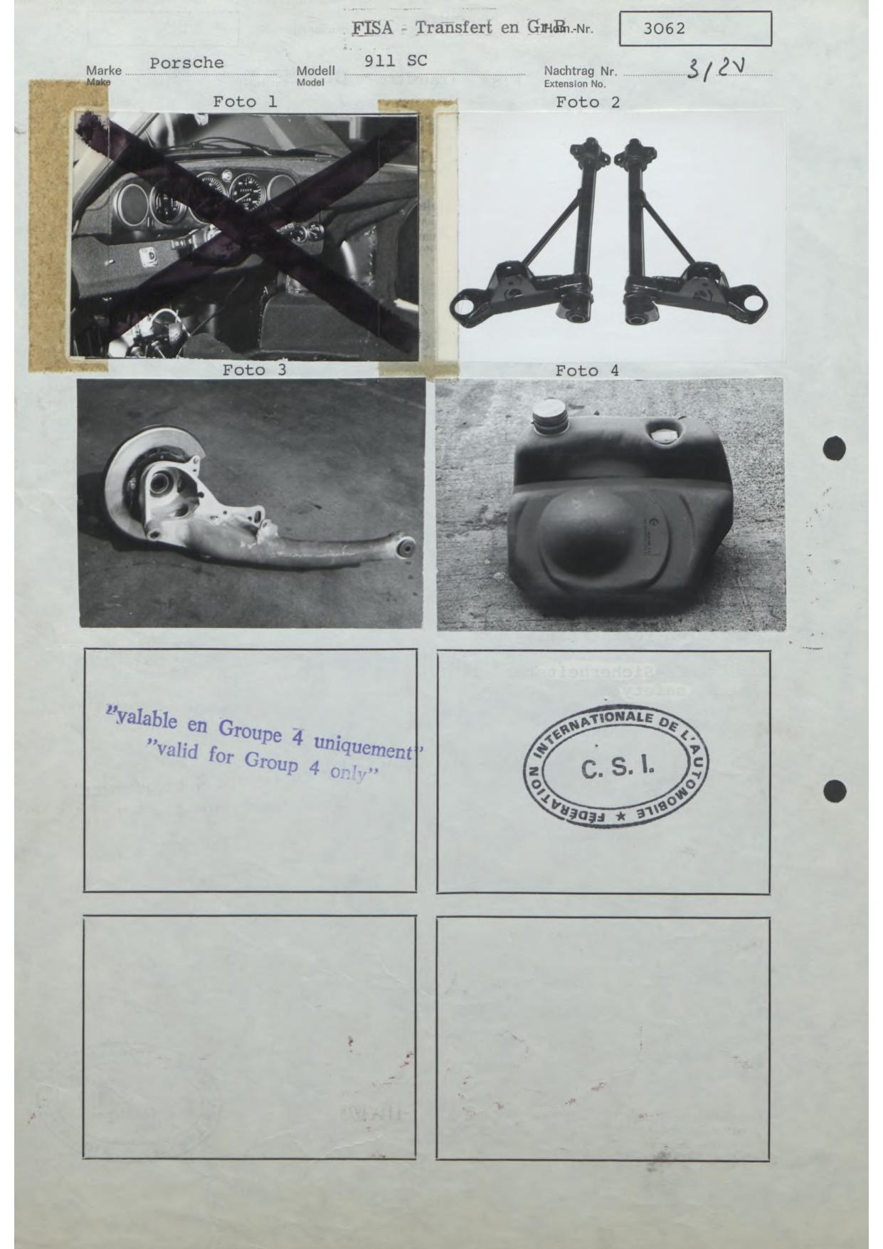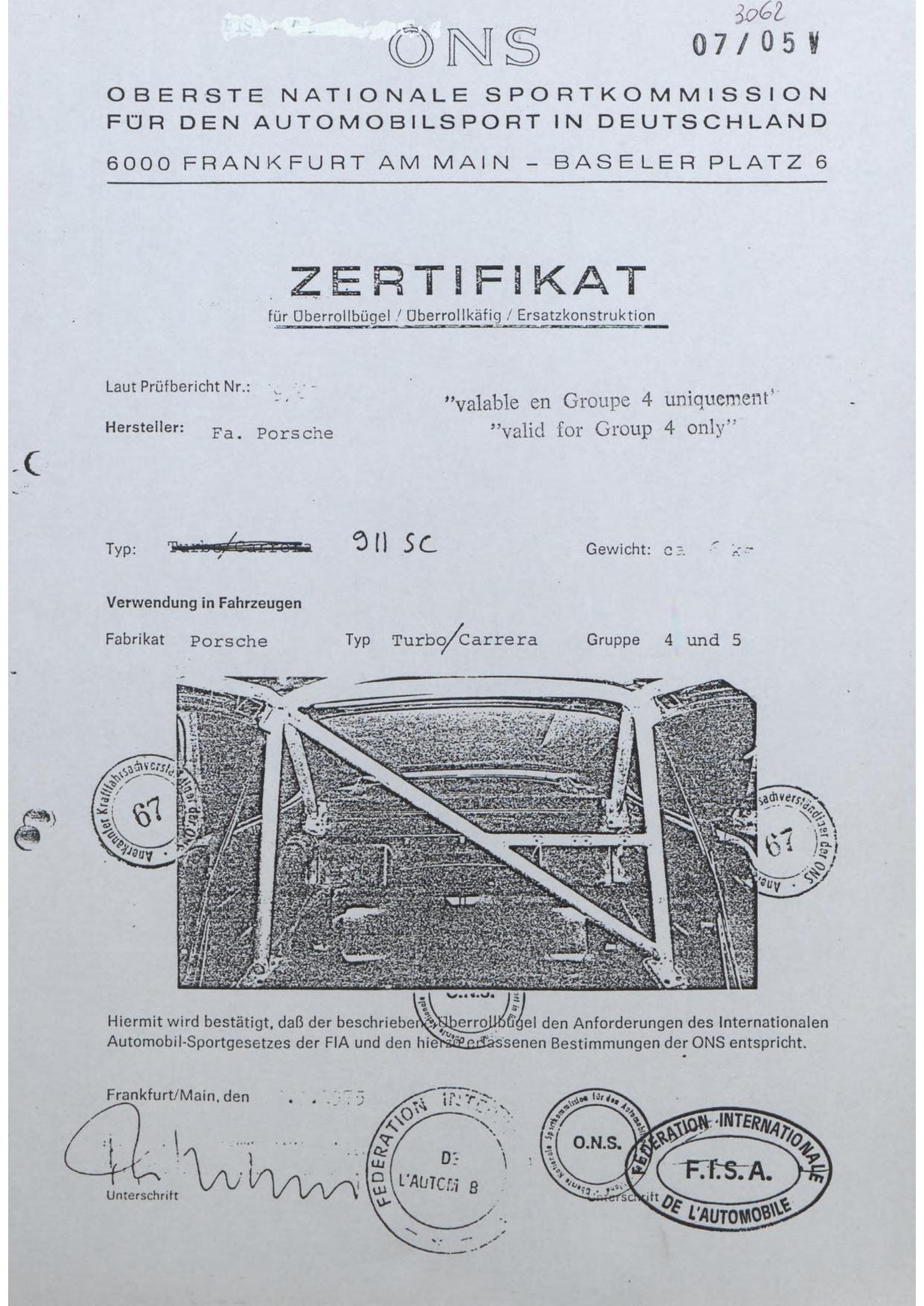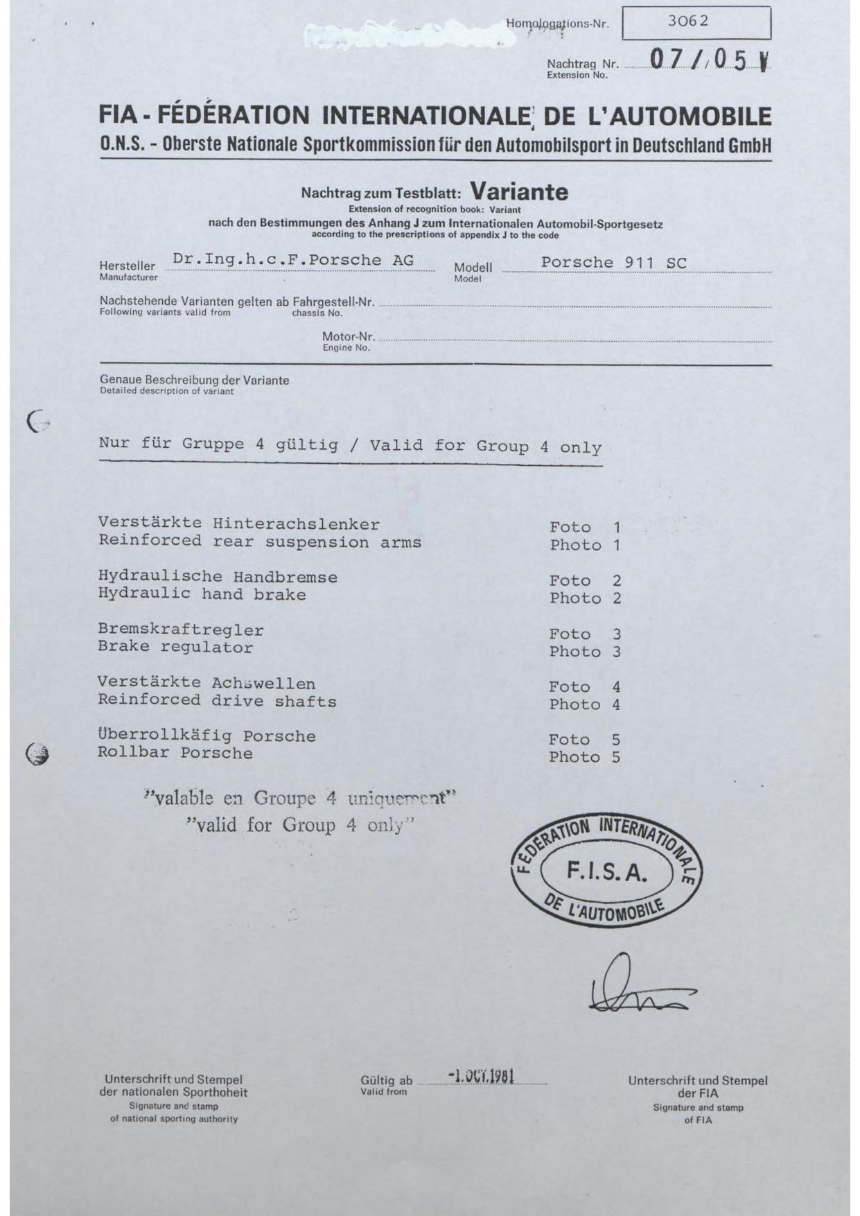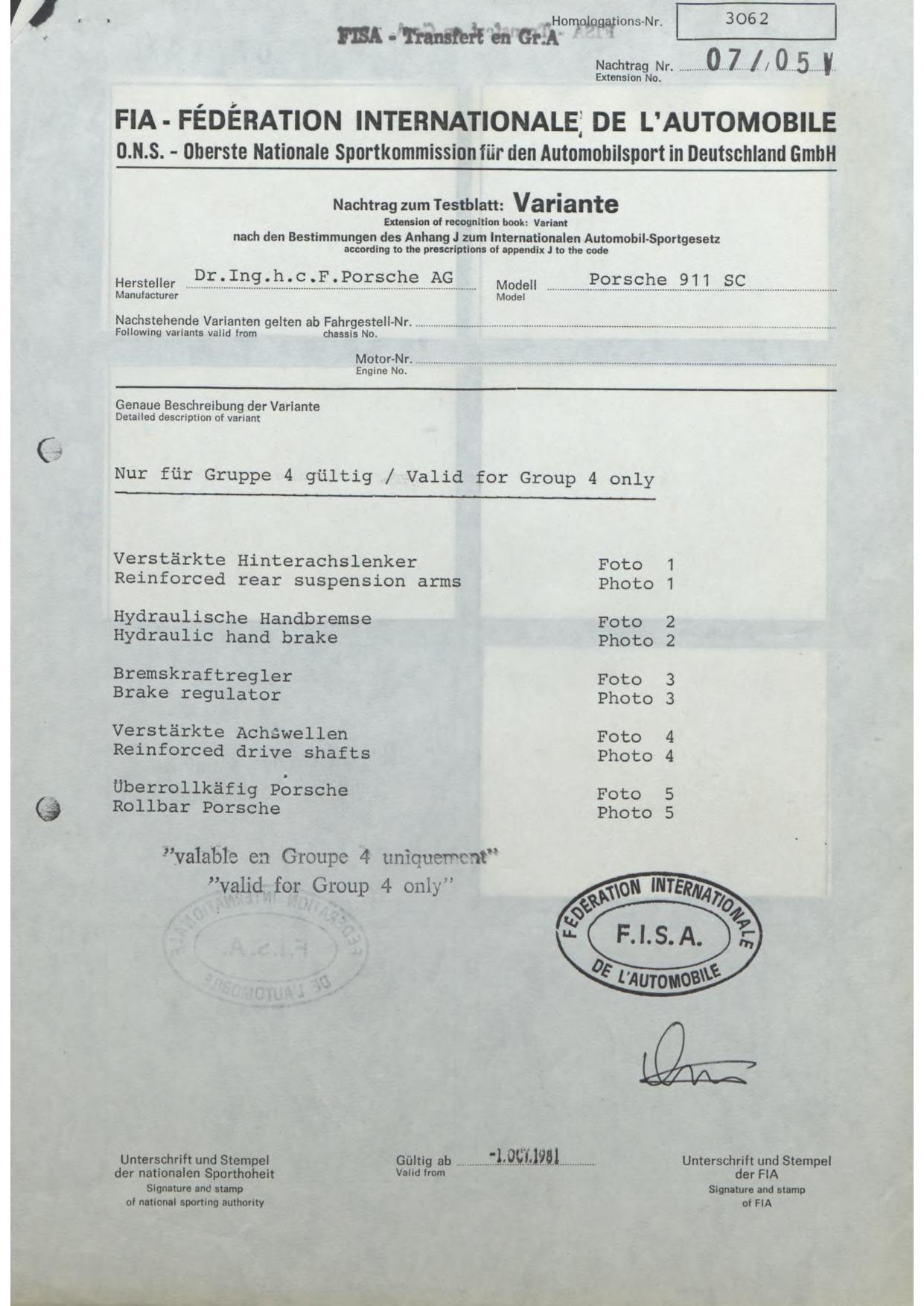 FIA Homologation Protocol for Porsche-911 Carrera 2.7 with 3.0 engine type 911/74 for IROC, 1973