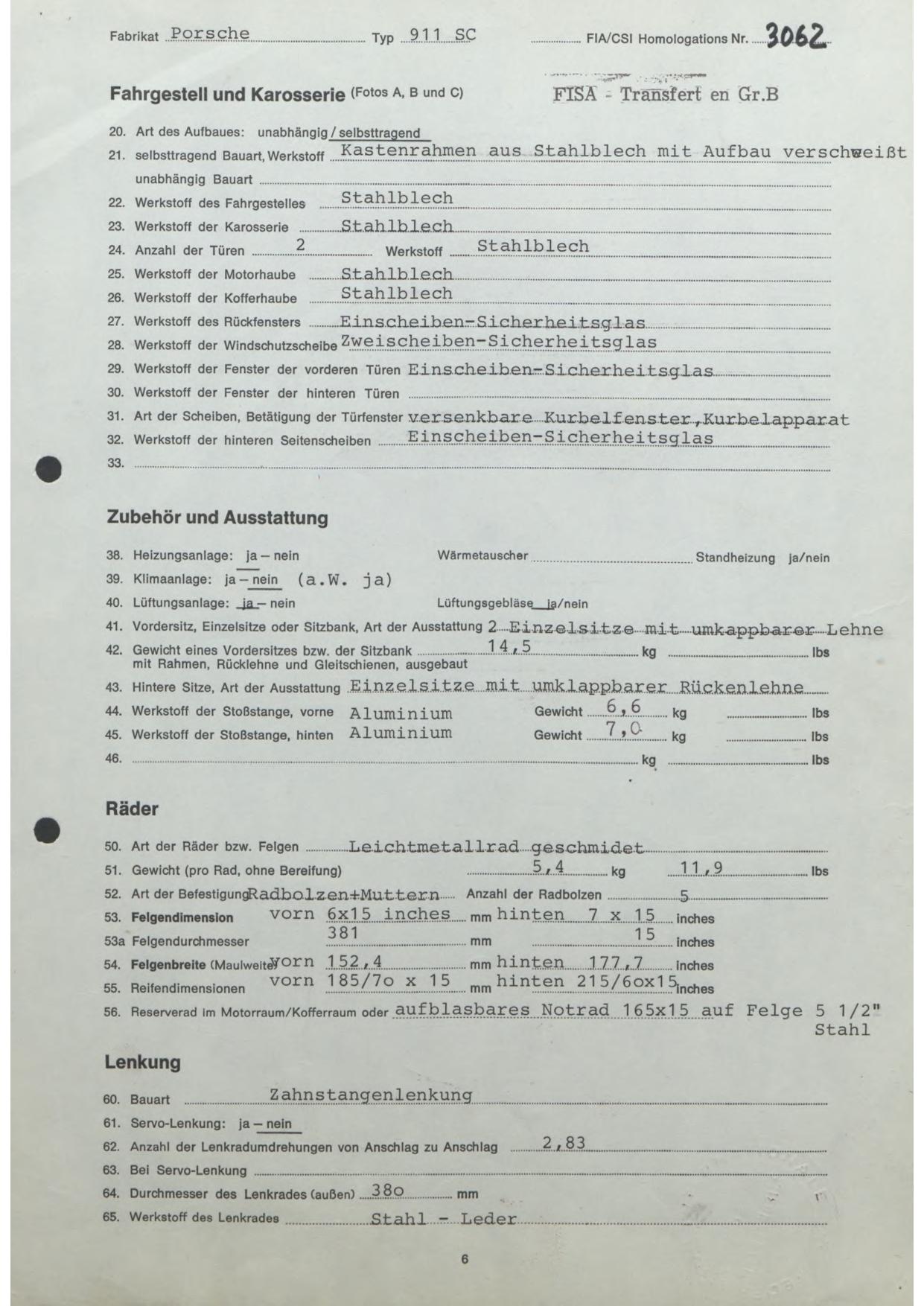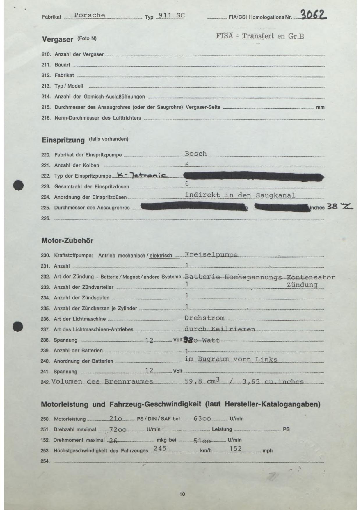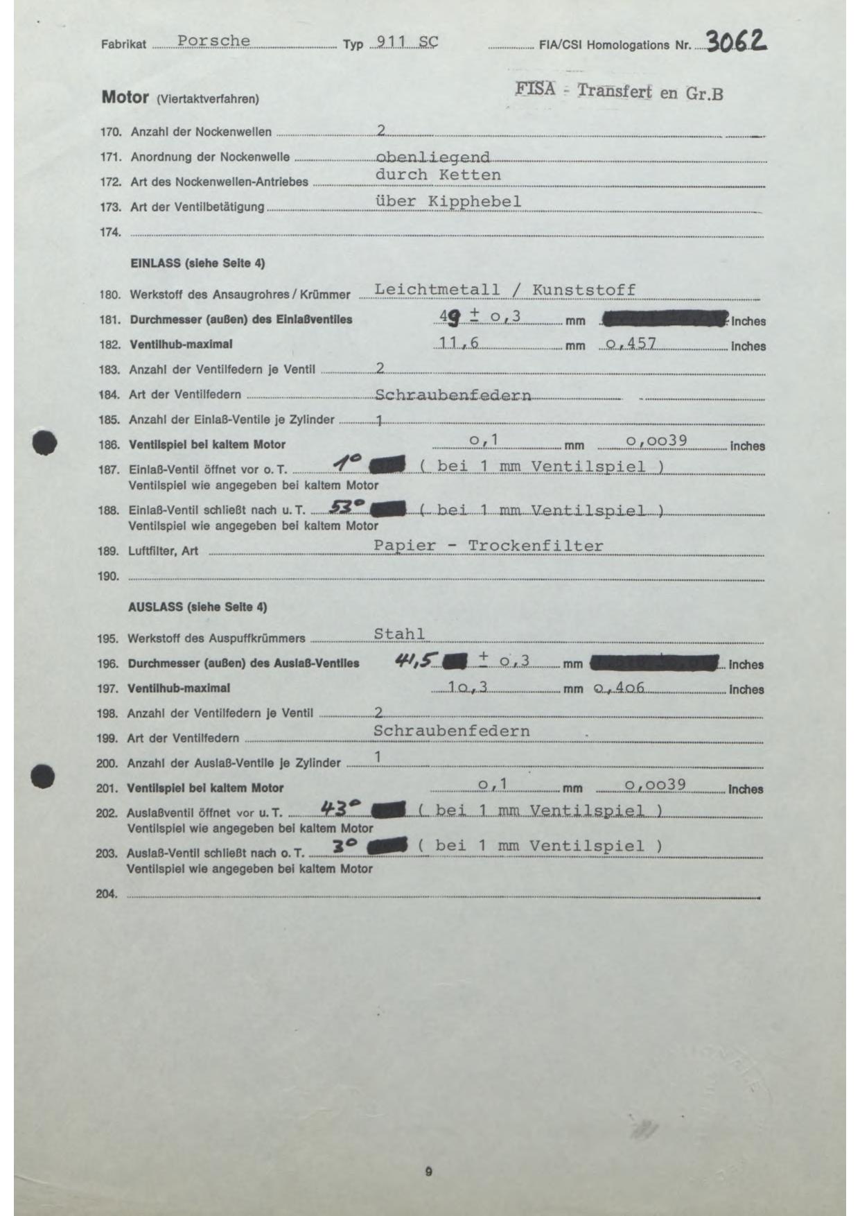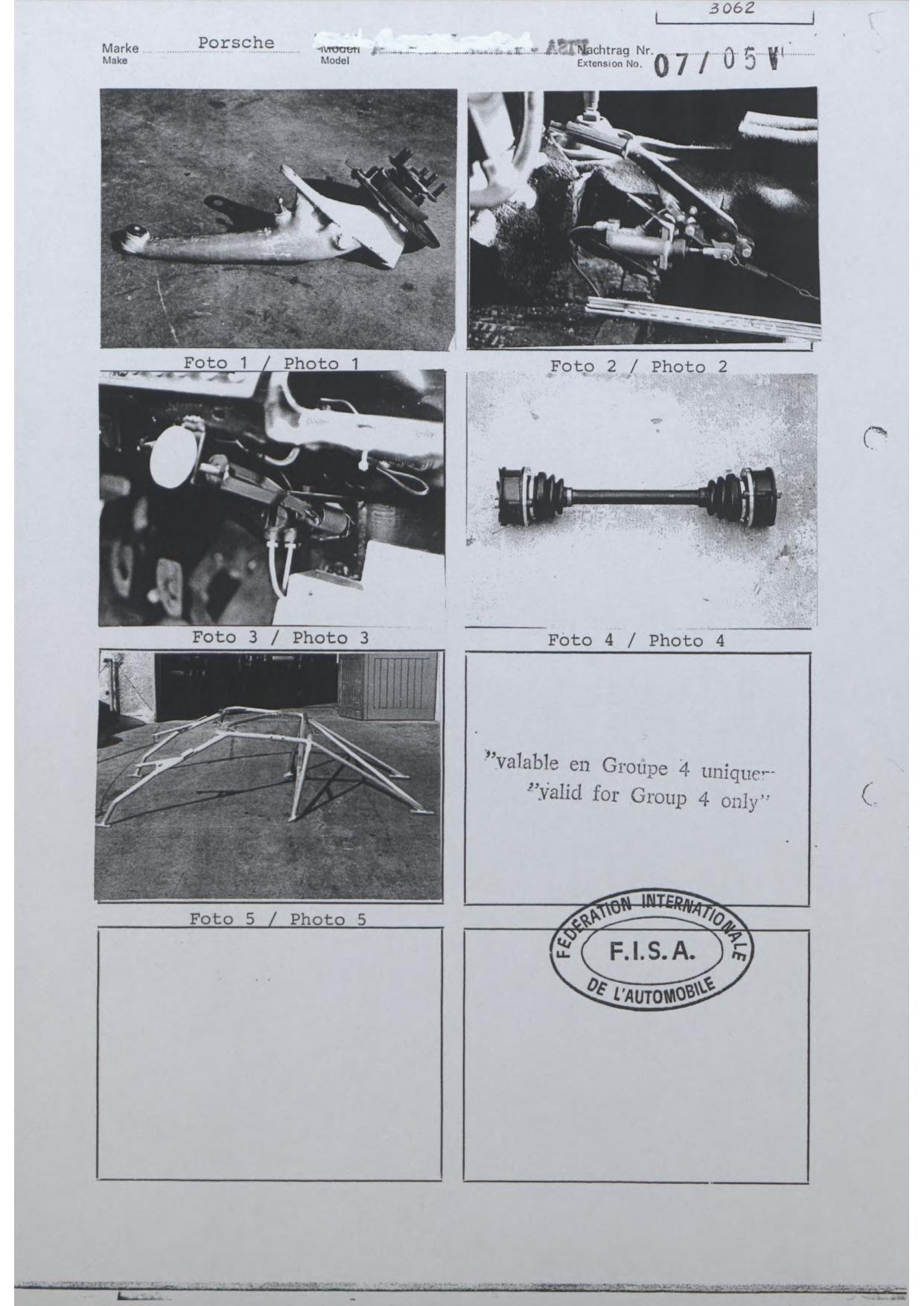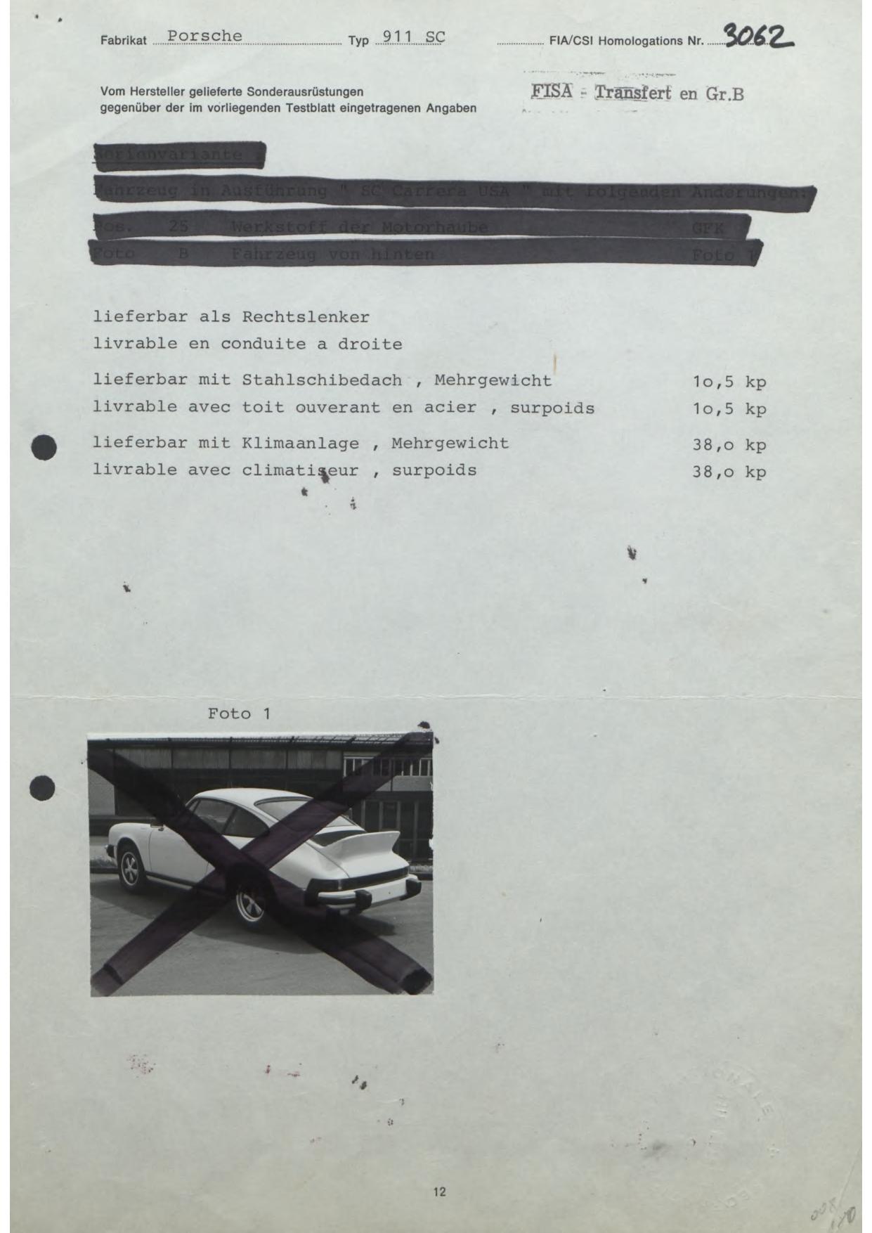 FIA Homologation Protocol for Porsche-911 Carrera 2.7 with 3.0 engine type 911/74 for IROC, 1973