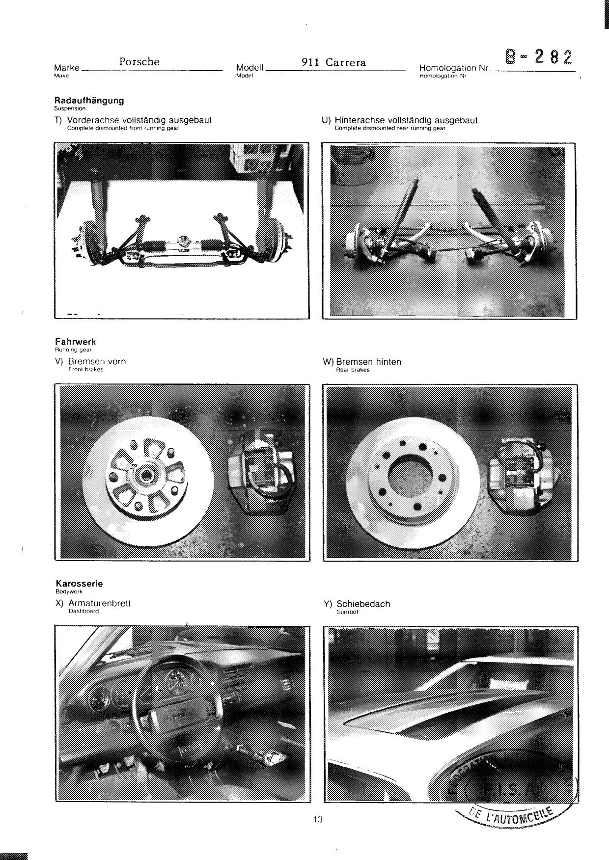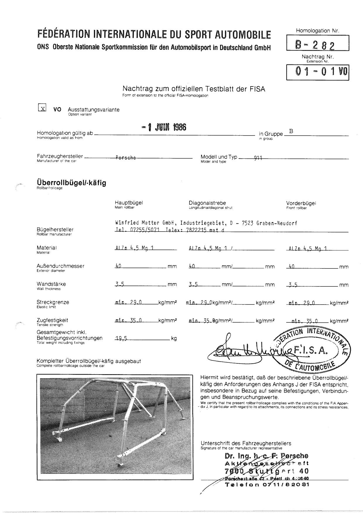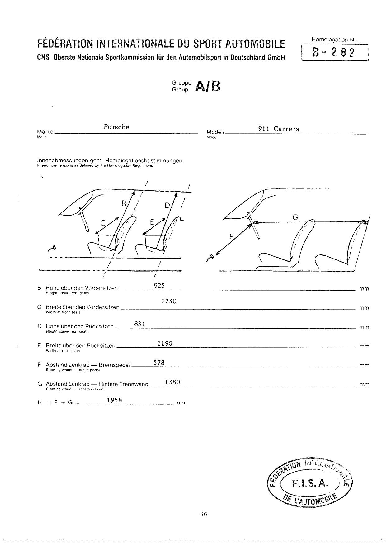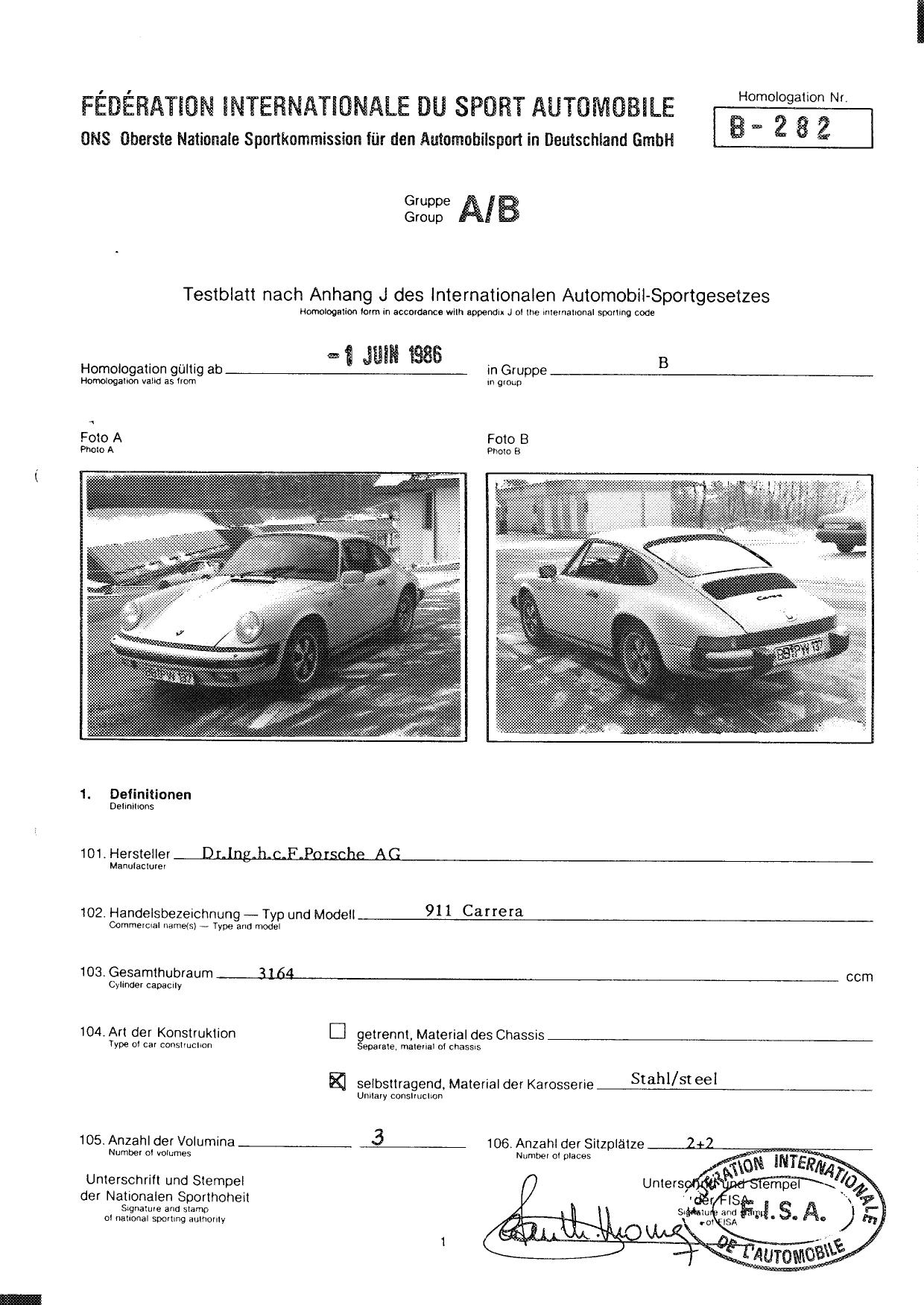 FIA Homologation Protocol for Porsche-911 Carrera 3.2, 1986
