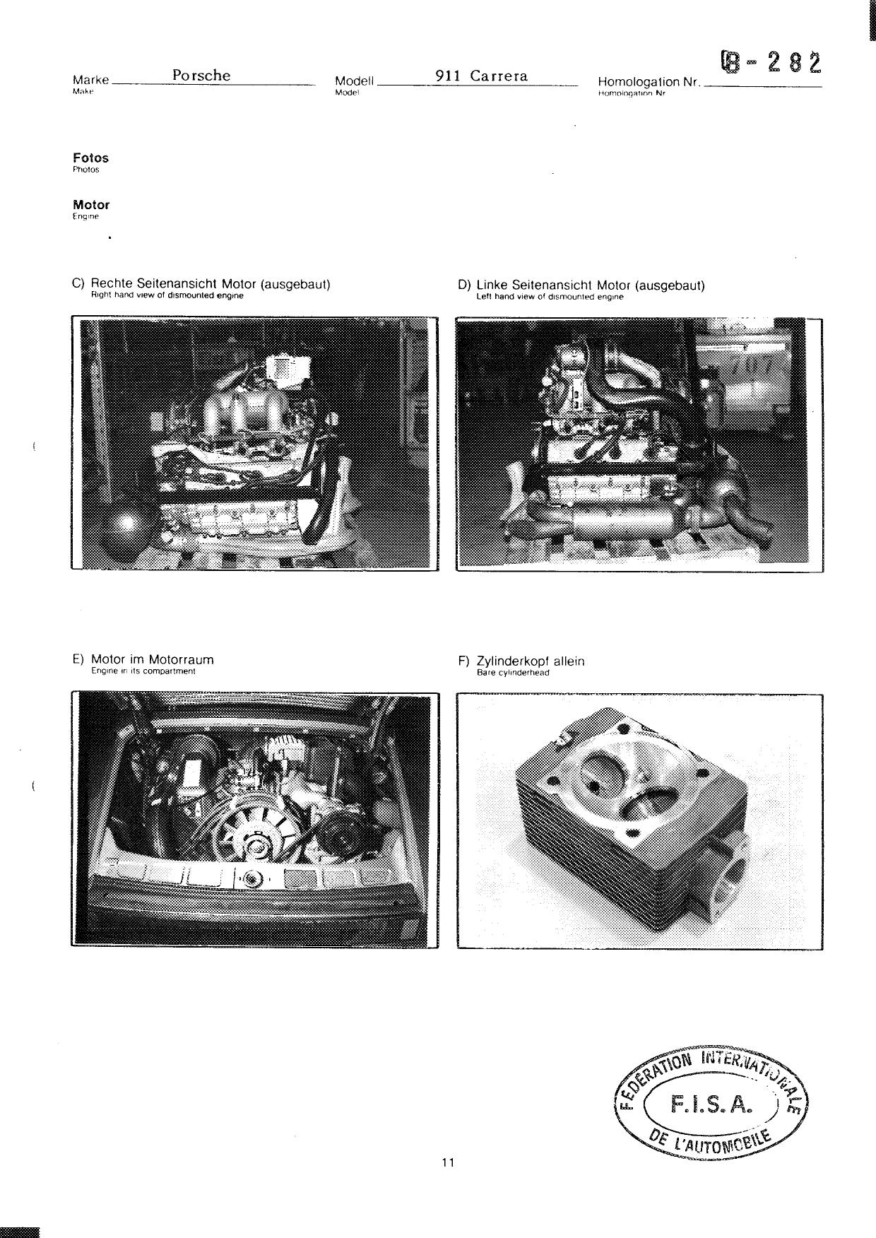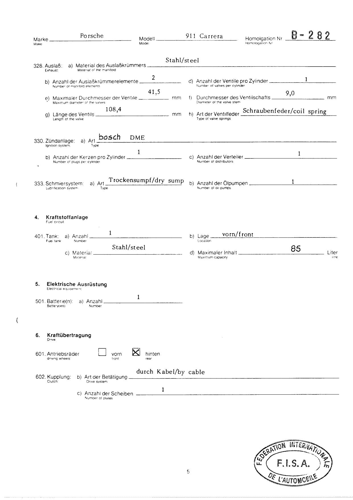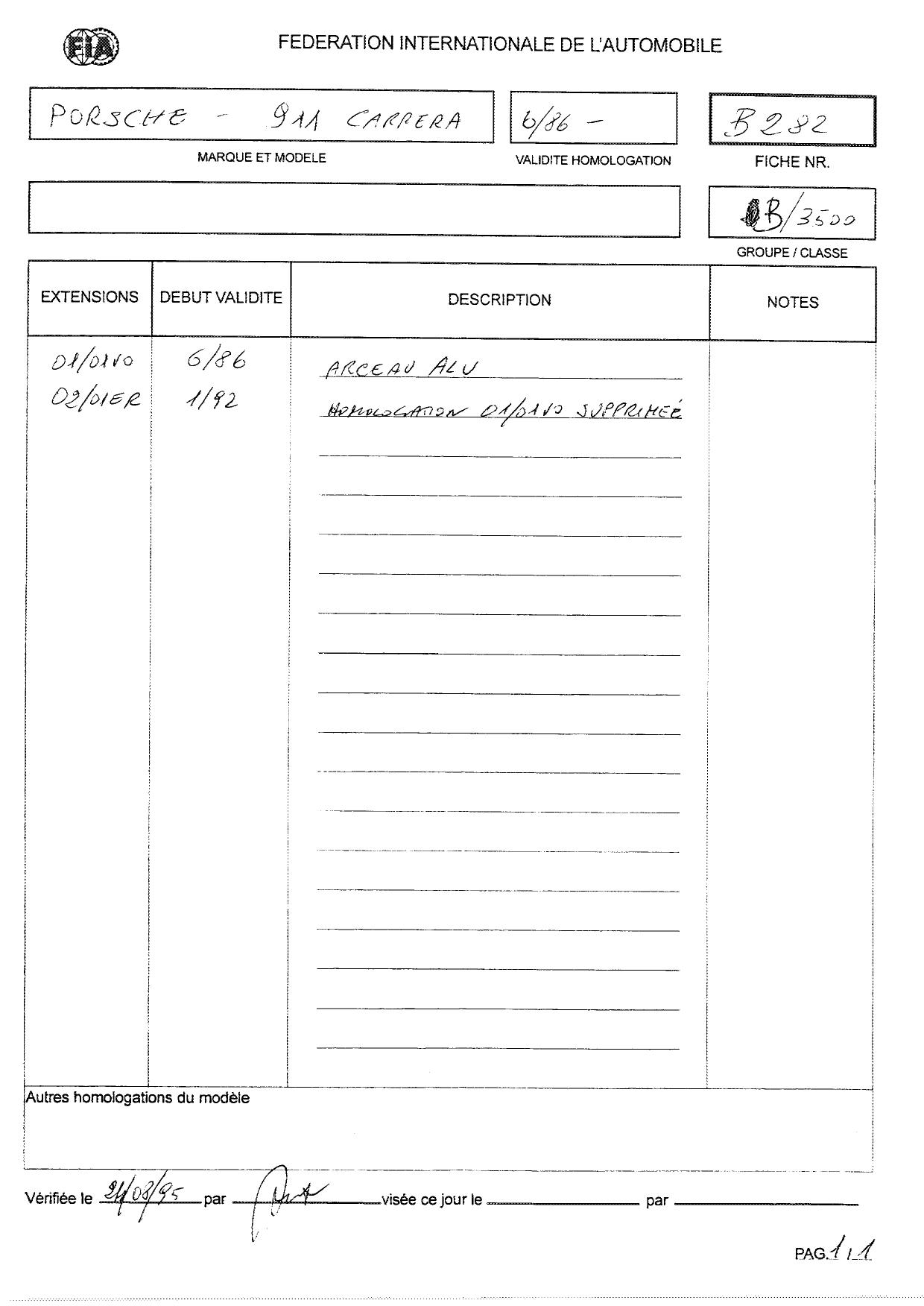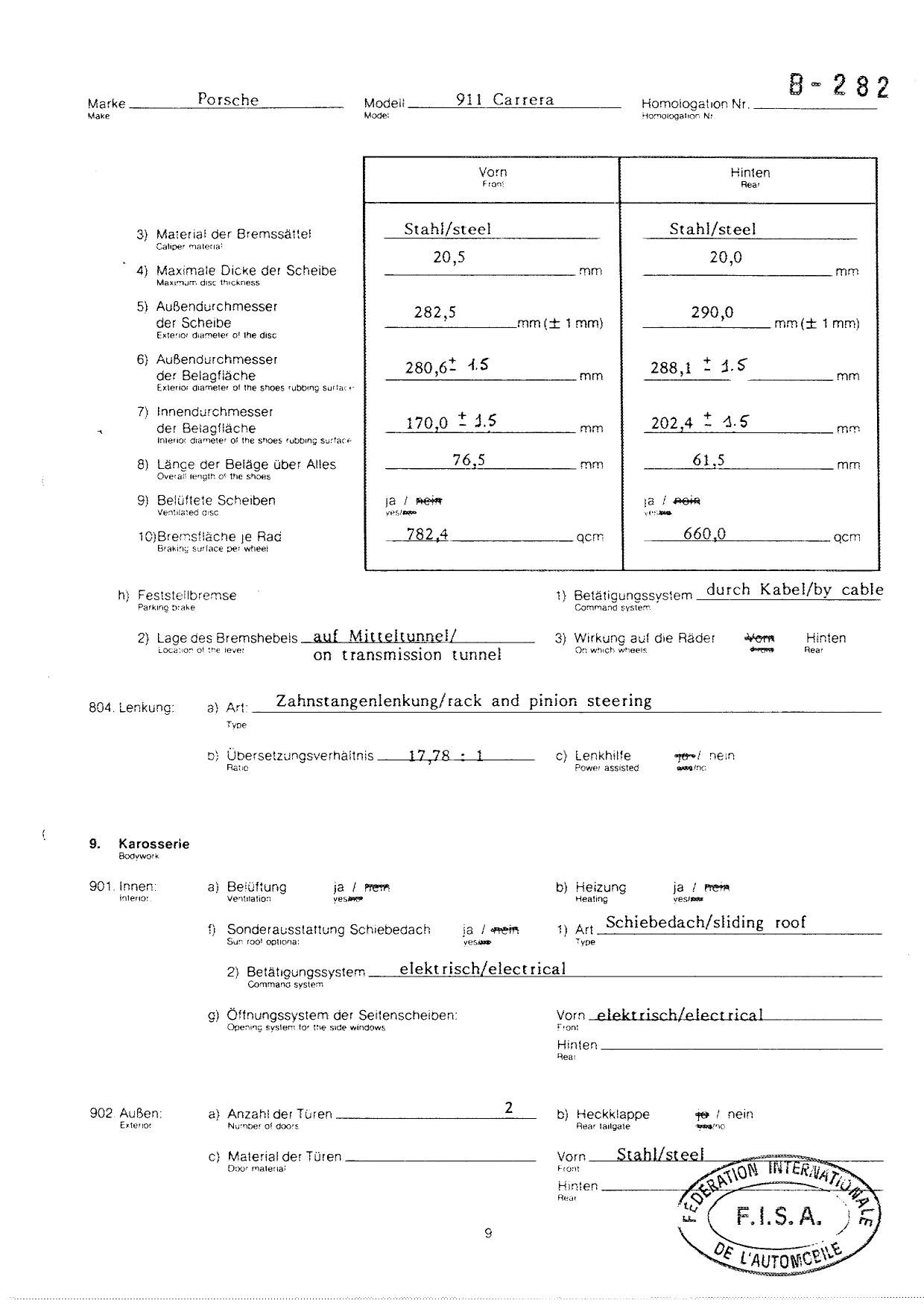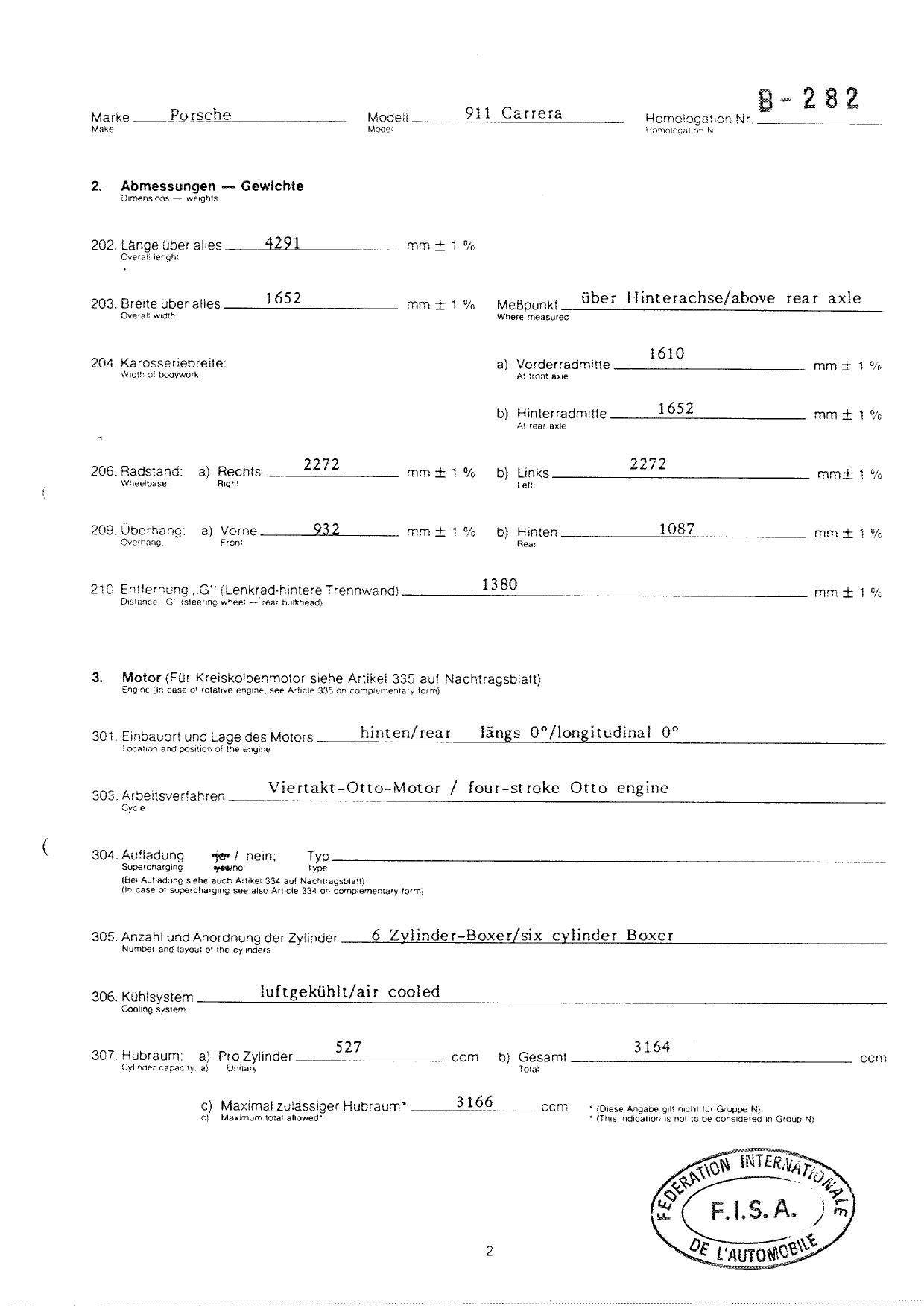 FIA Homologation Protocol for Porsche-911 Carrera 3.2, 1986