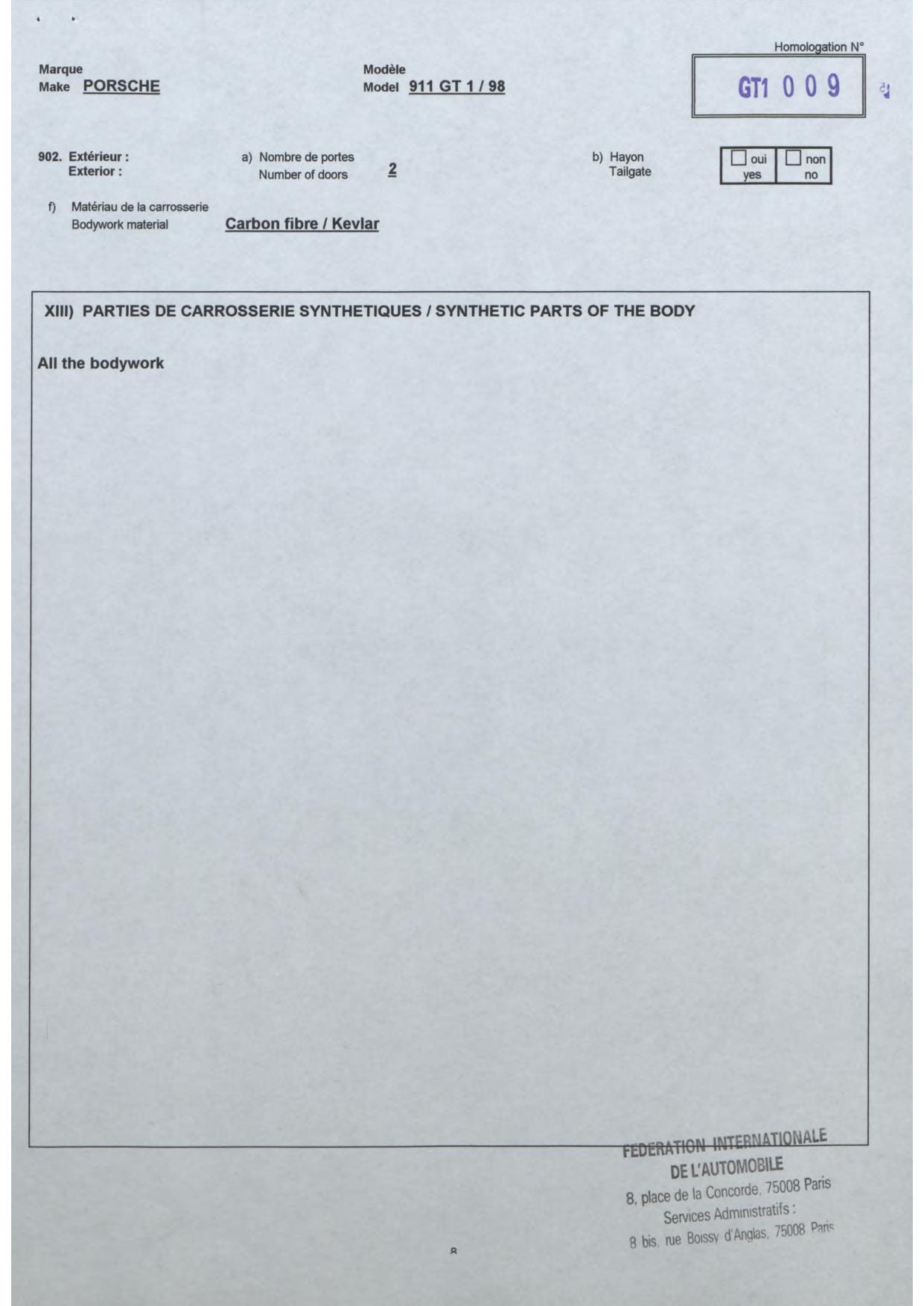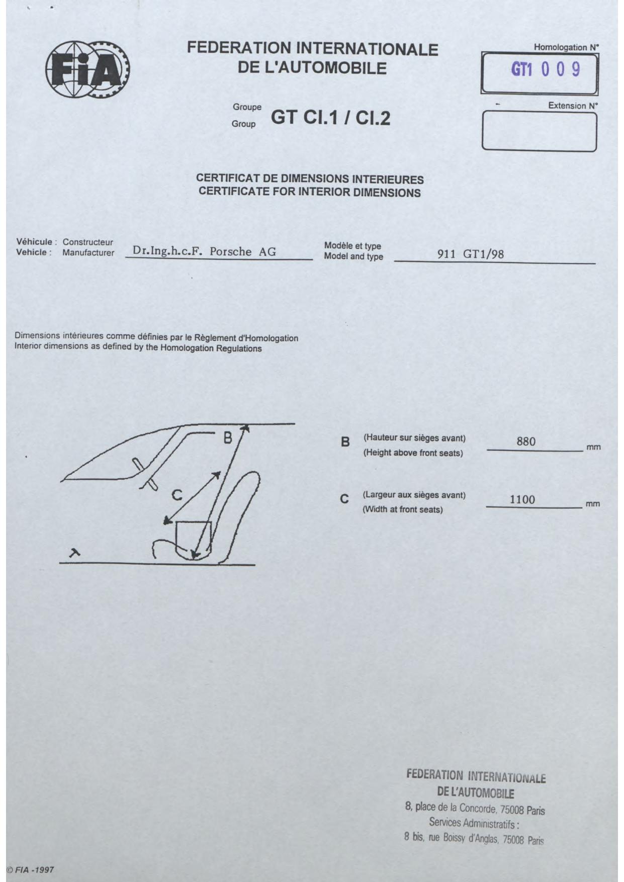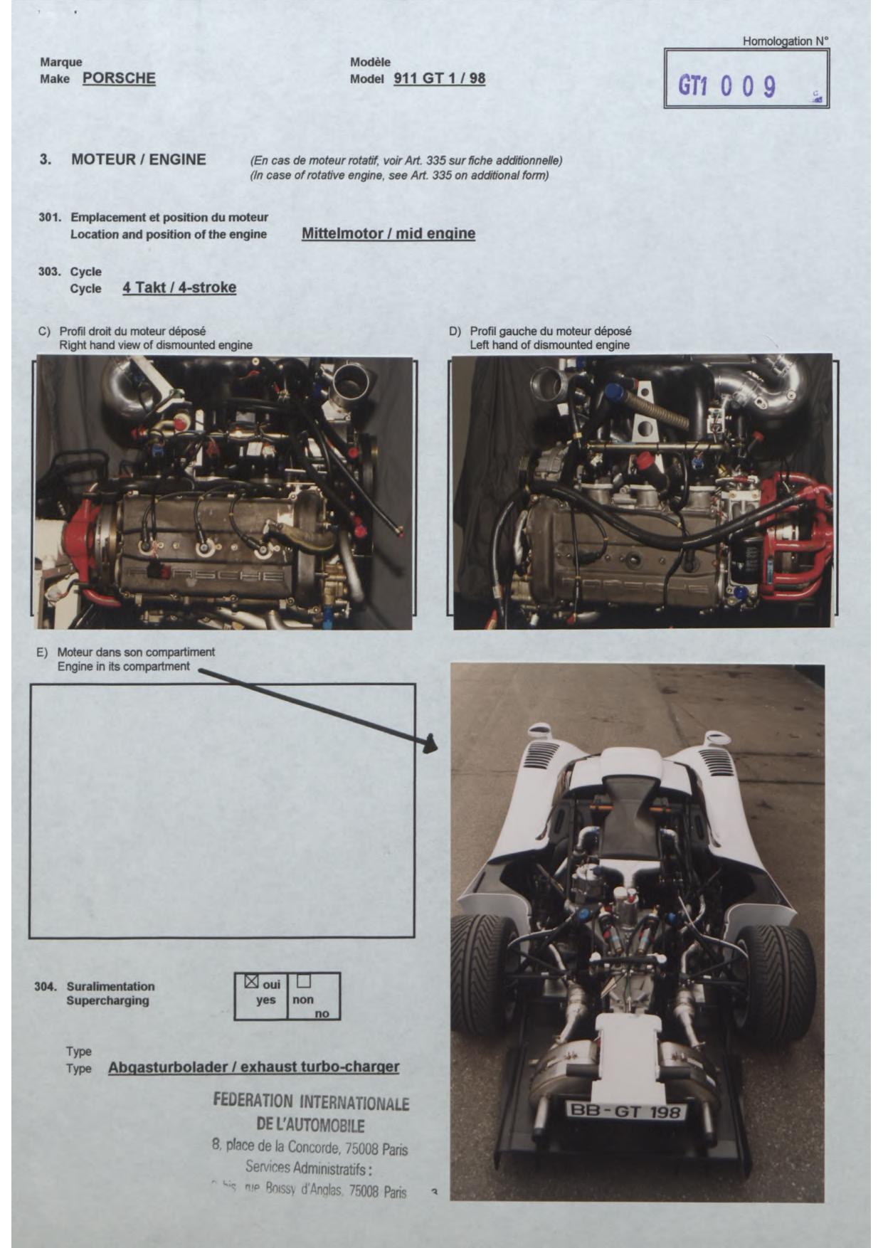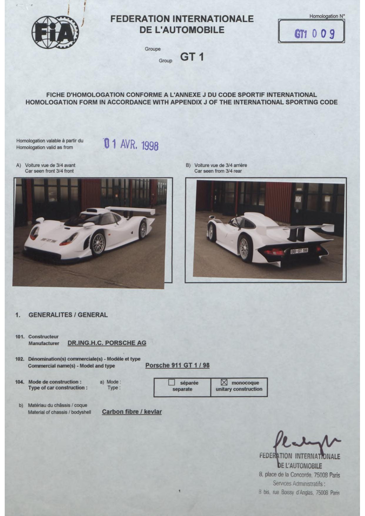 FIA Homologation Protocol for Porsche-911 GT1/98, 1998