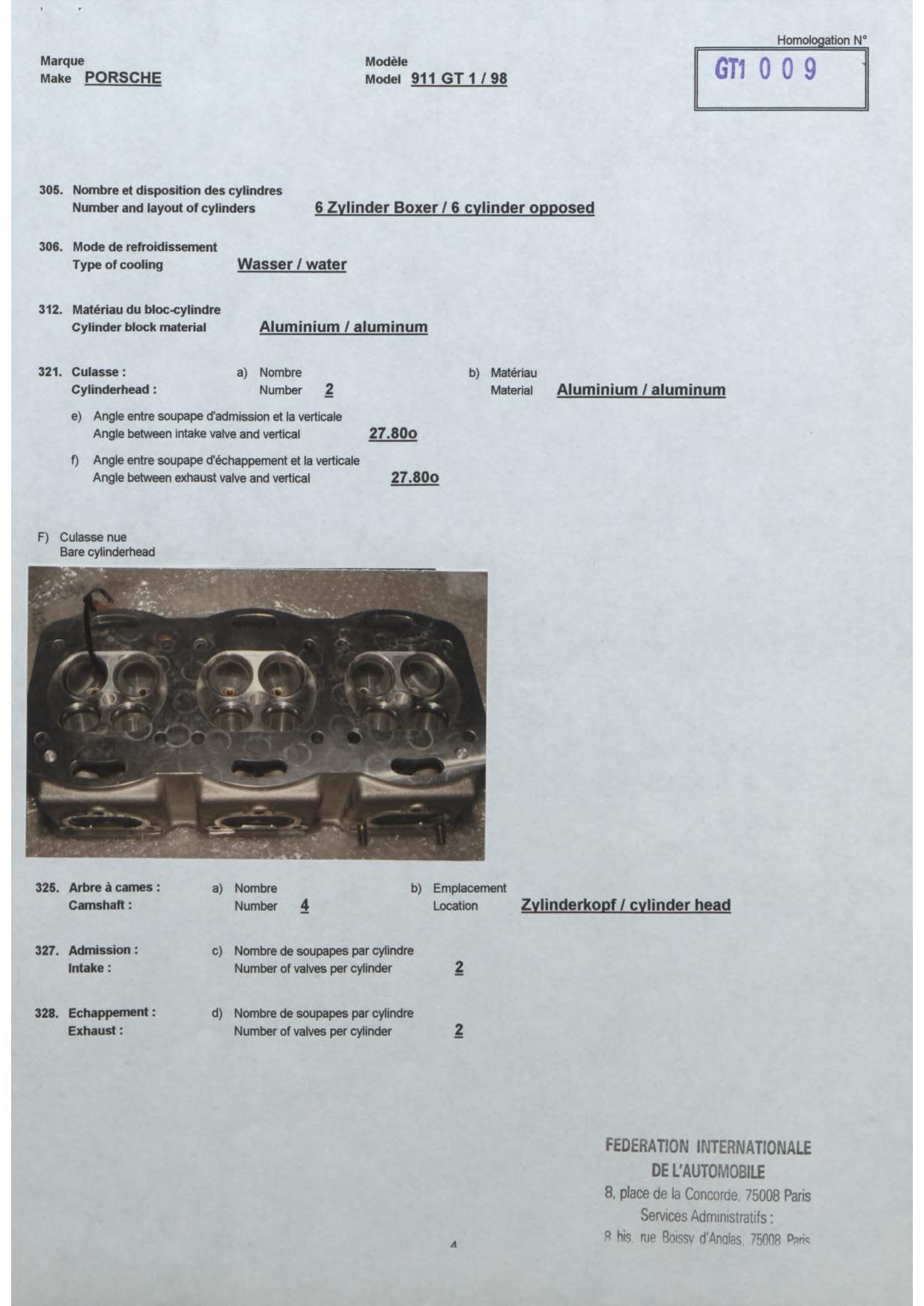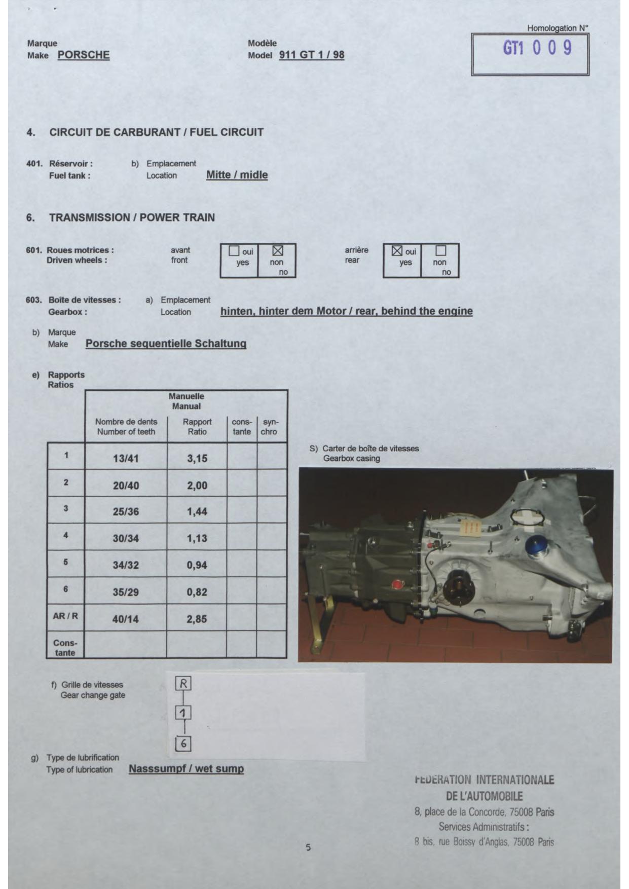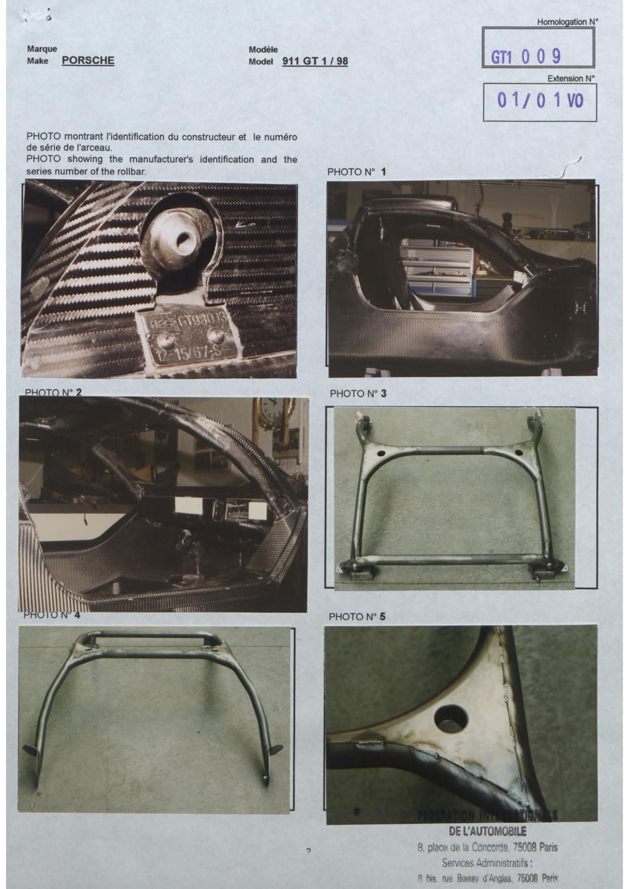 FIA Homologation Protocol for Porsche-911 GT1/98, 1998
