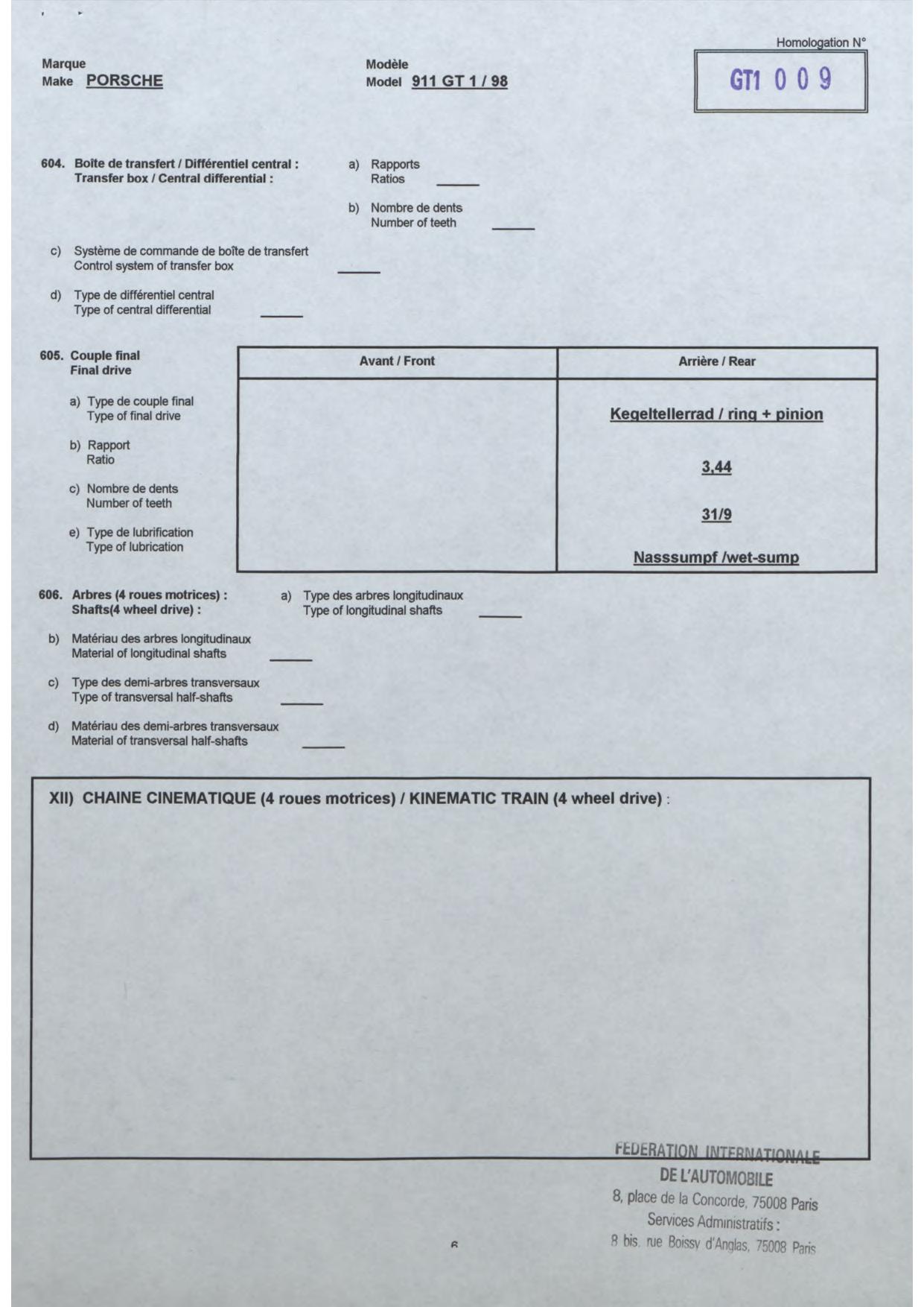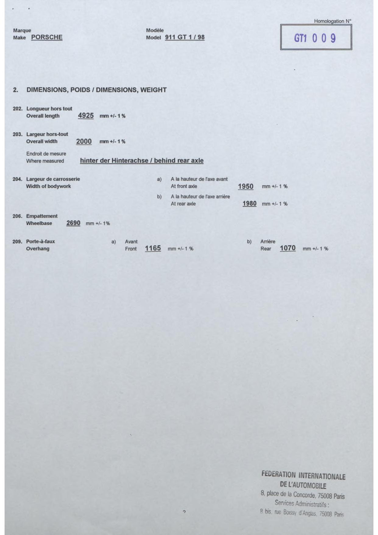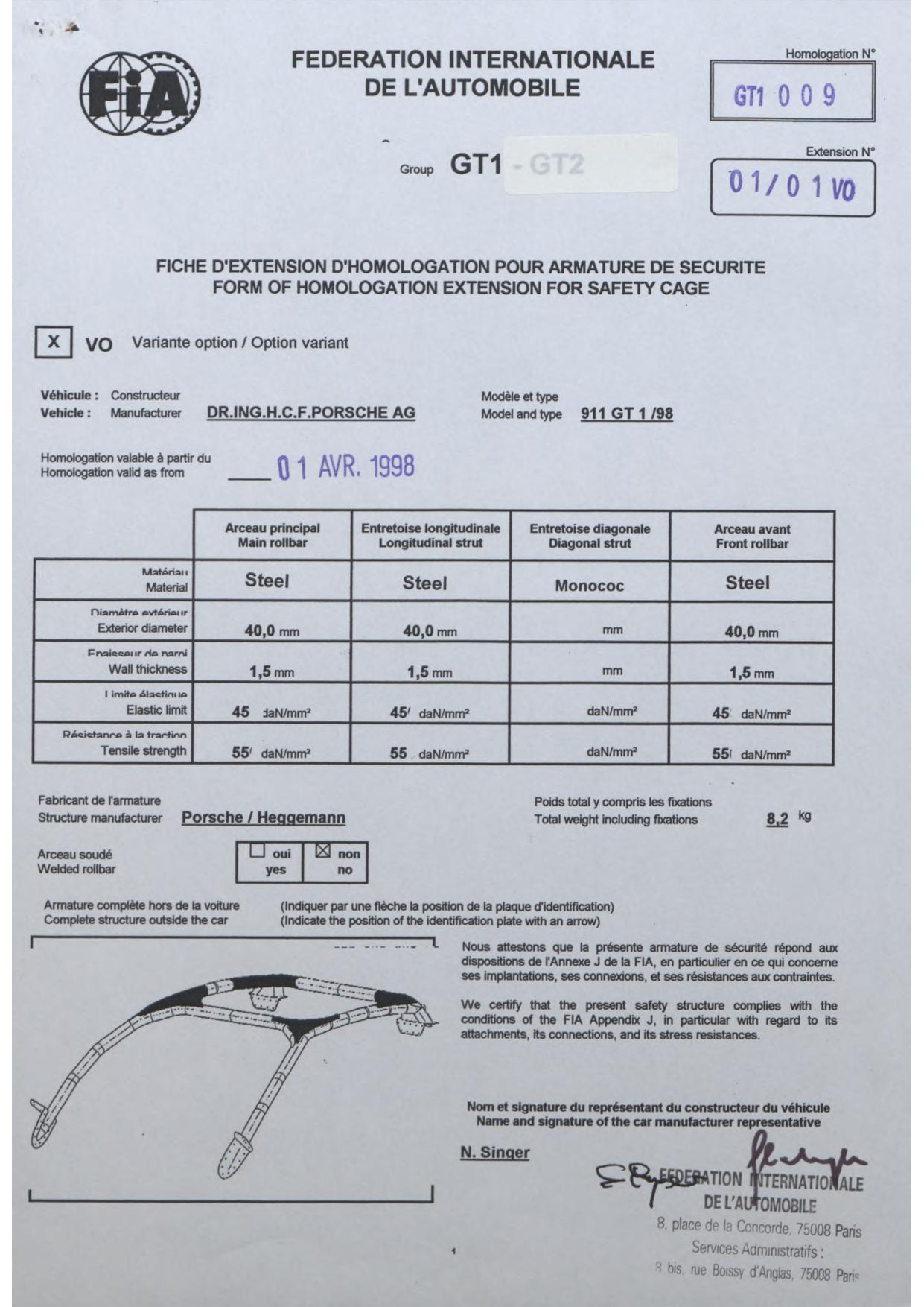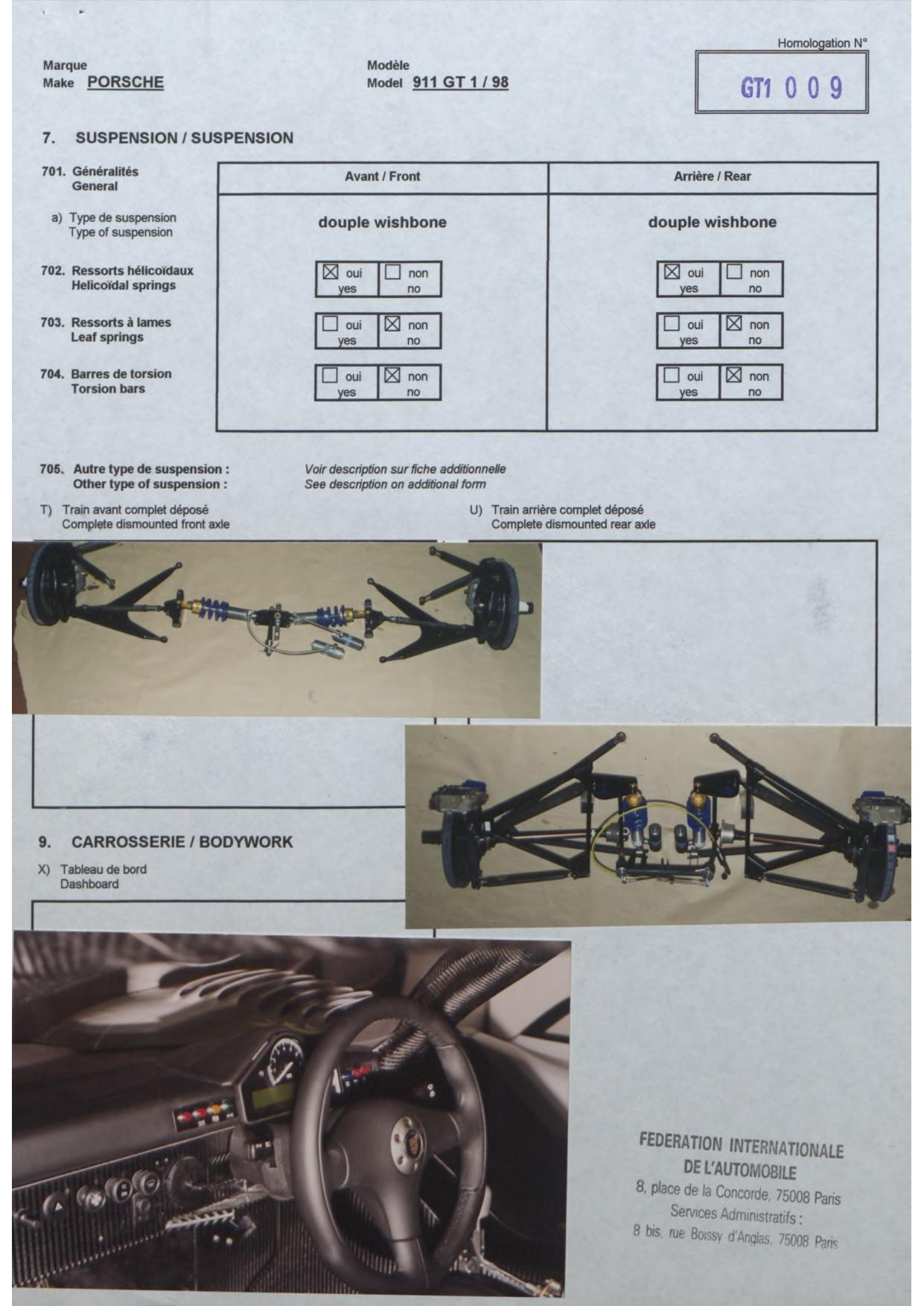 FIA Homologation Protocol for Porsche-911 GT1/98, 1998