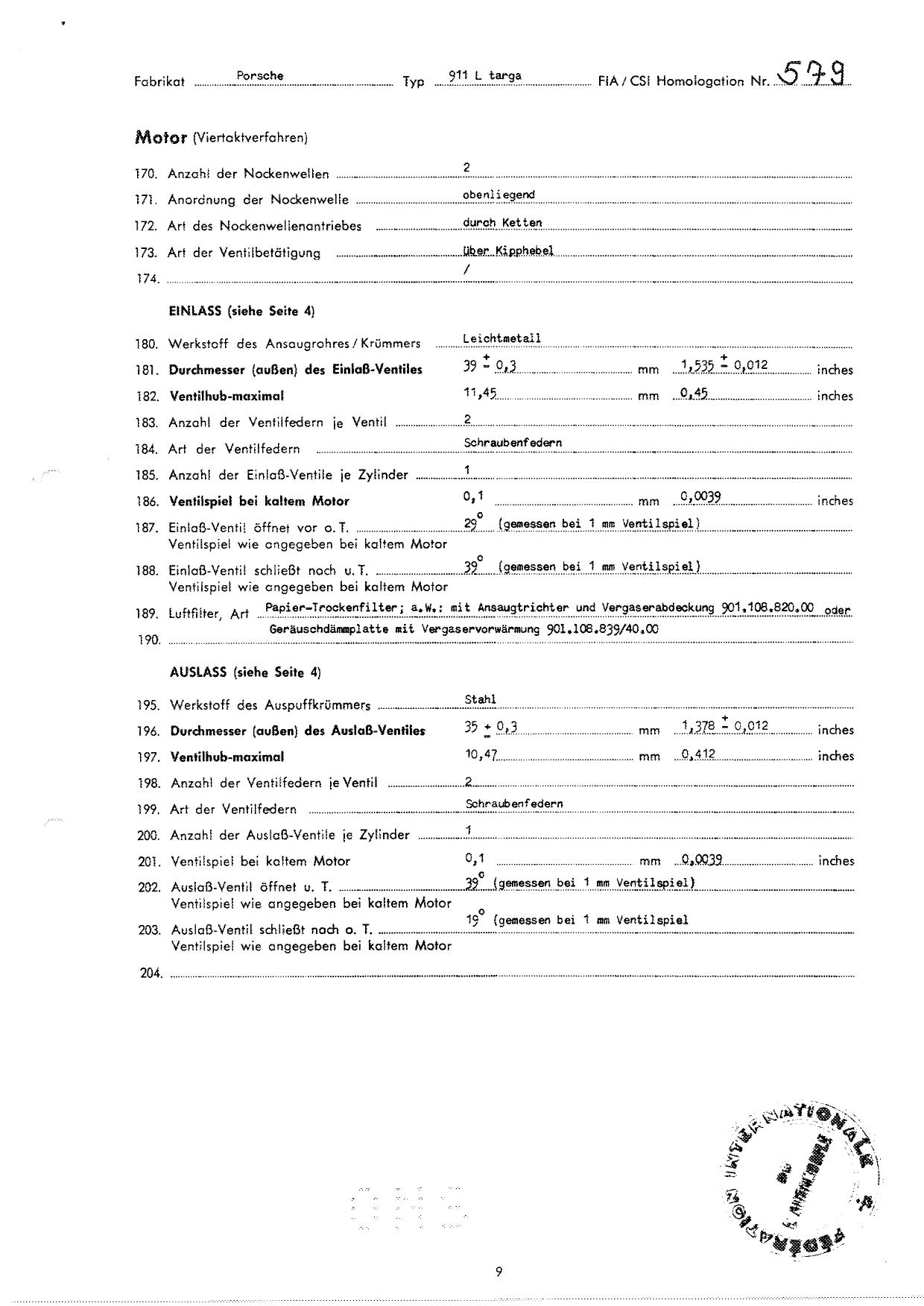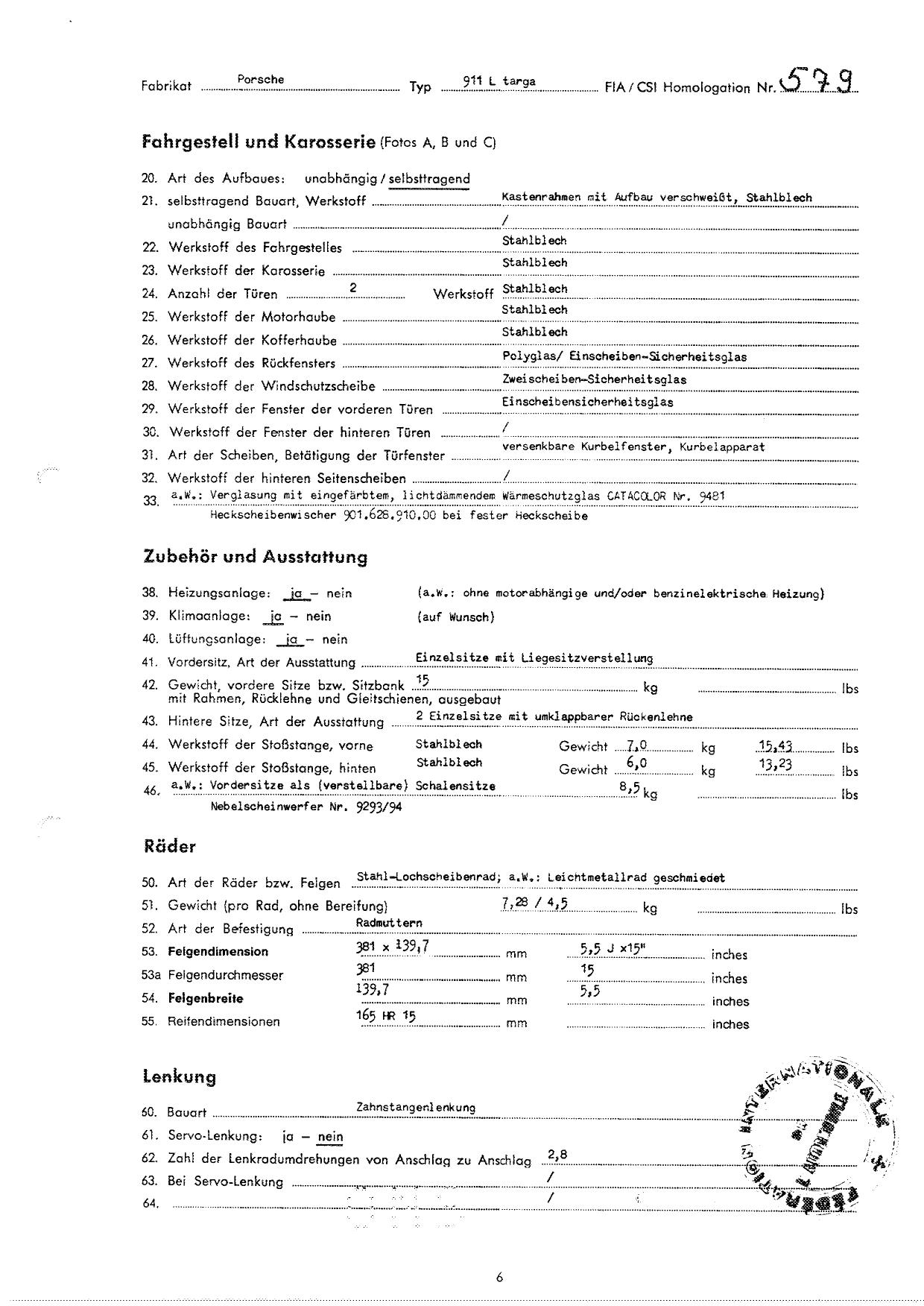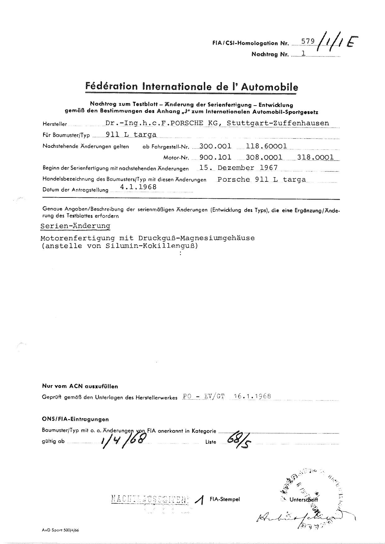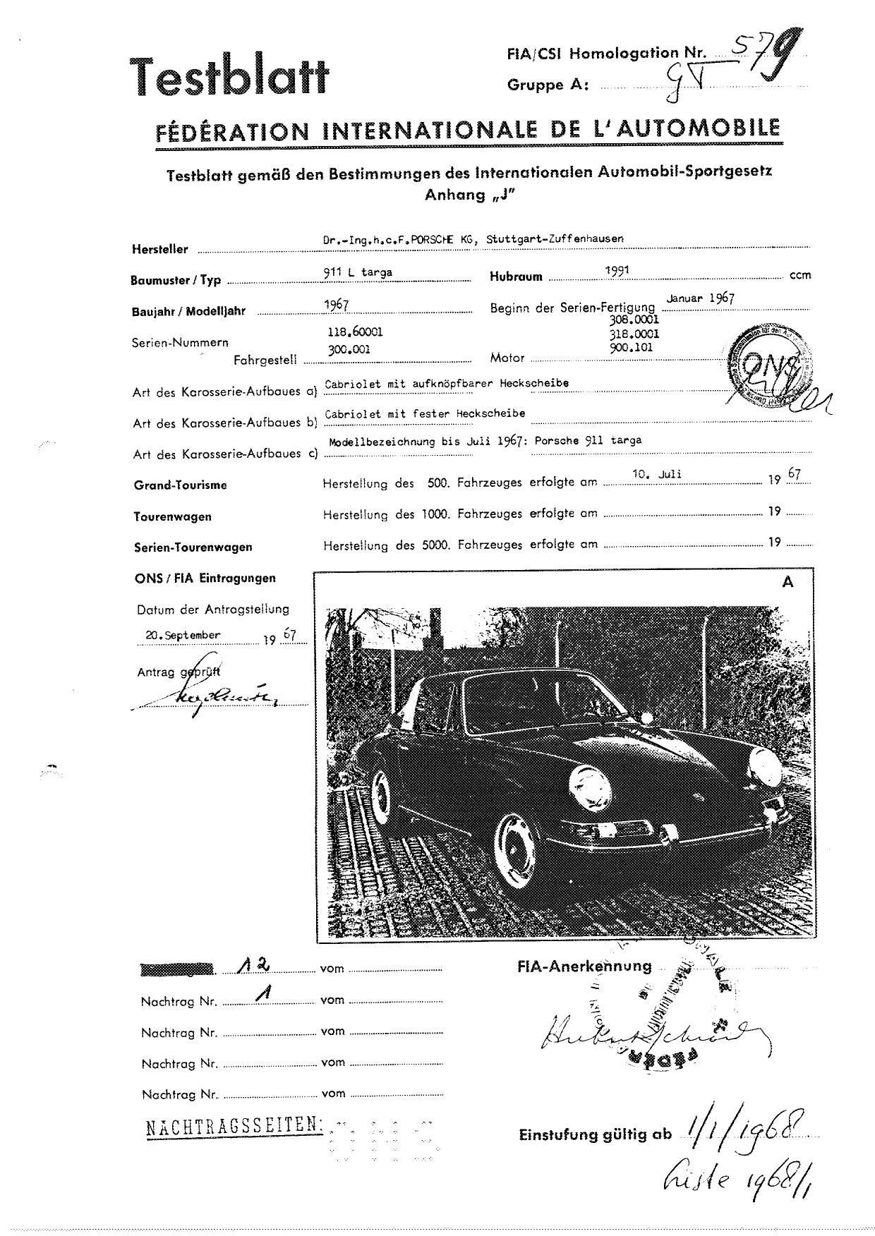 FIA Homologation Protocol for Porsche-911 L Targa, 1967