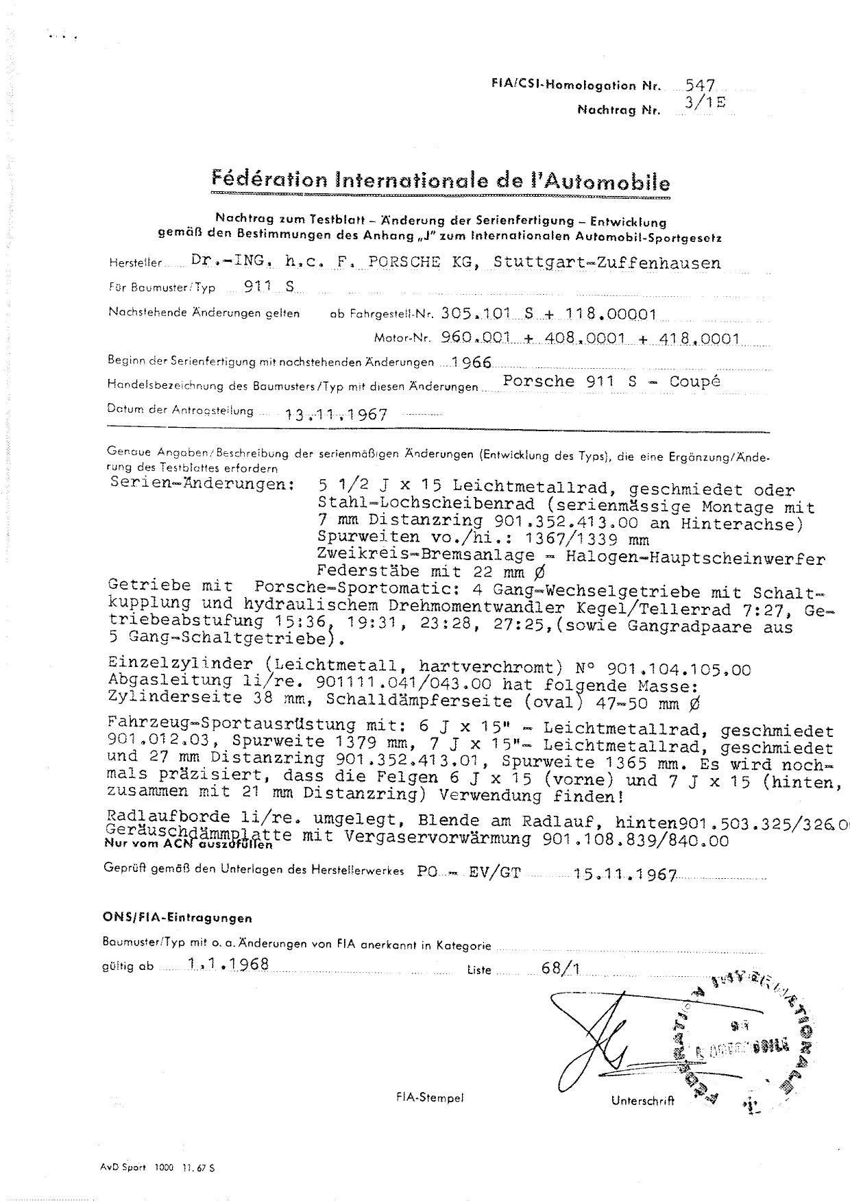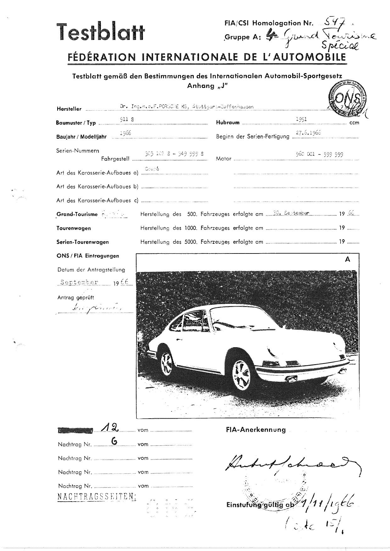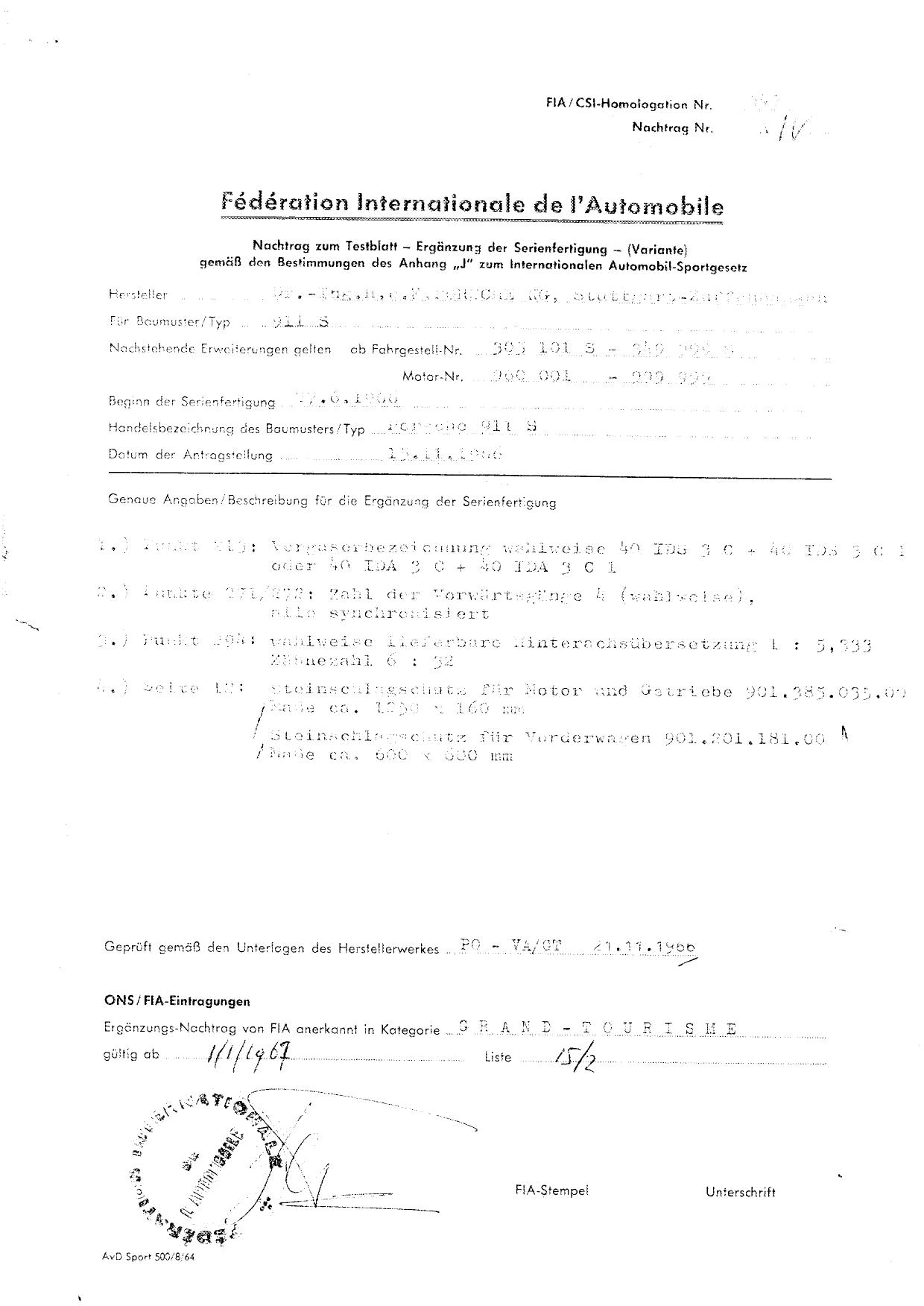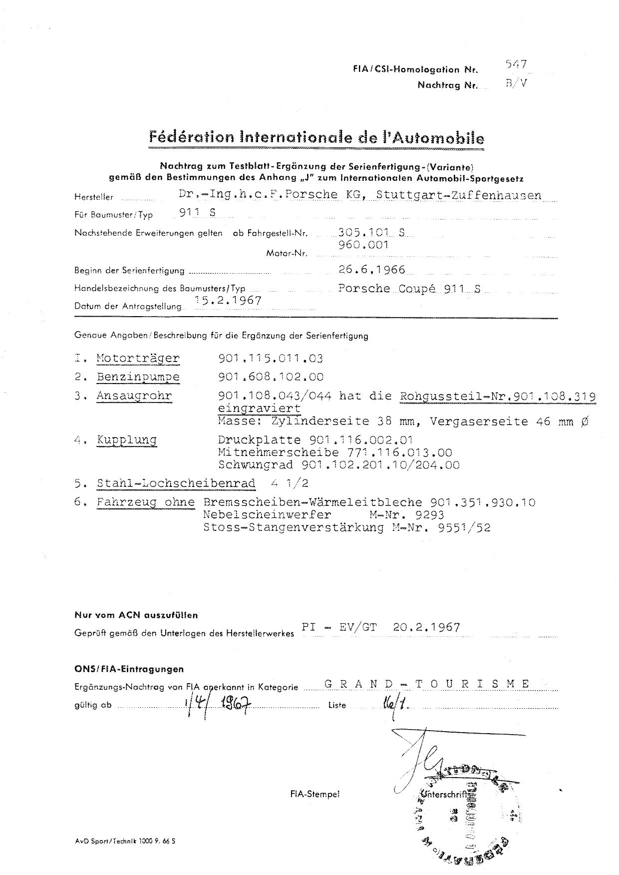 FIA Homologation Protocol for Porsche 911S, 1966