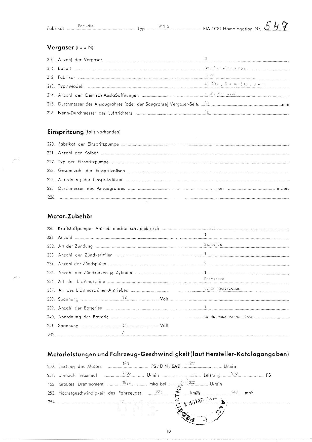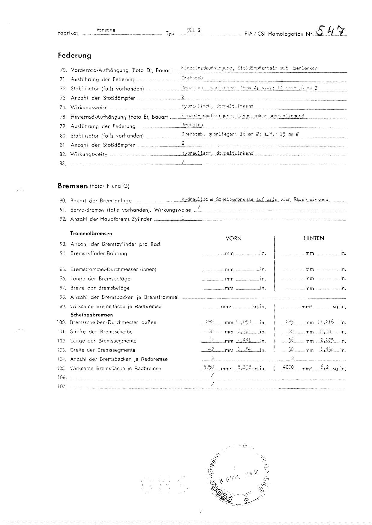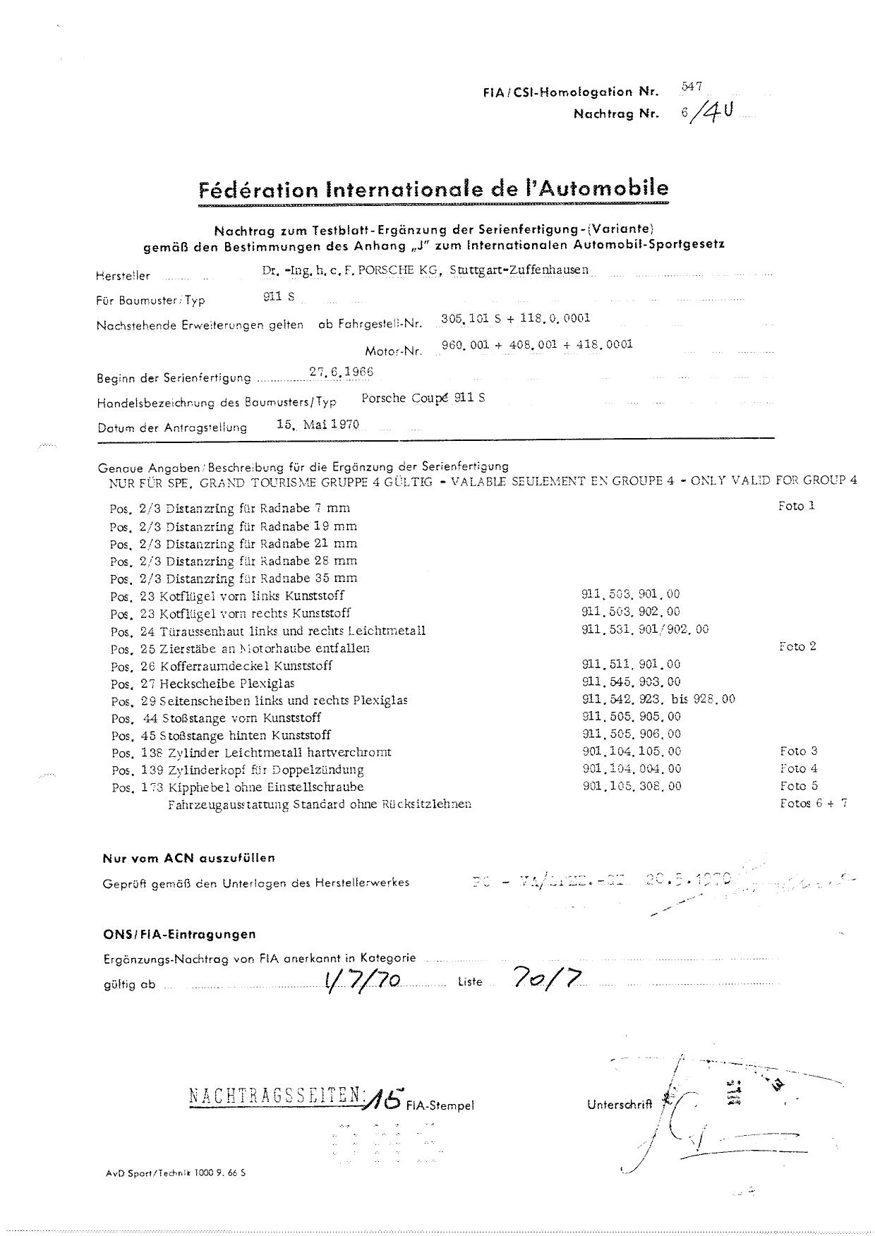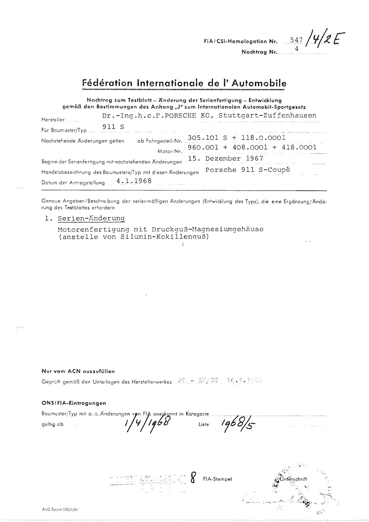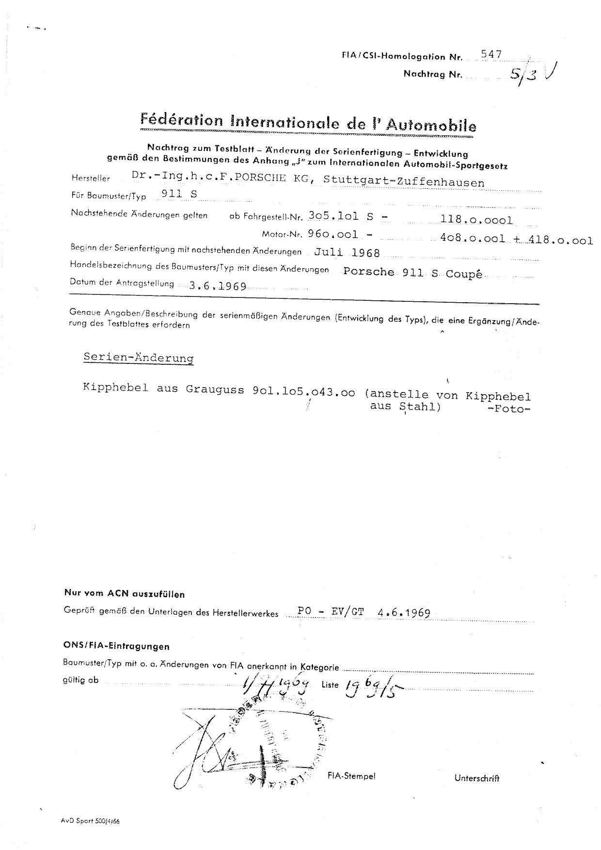 FIA Homologation Protocol for Porsche 911S, 1966