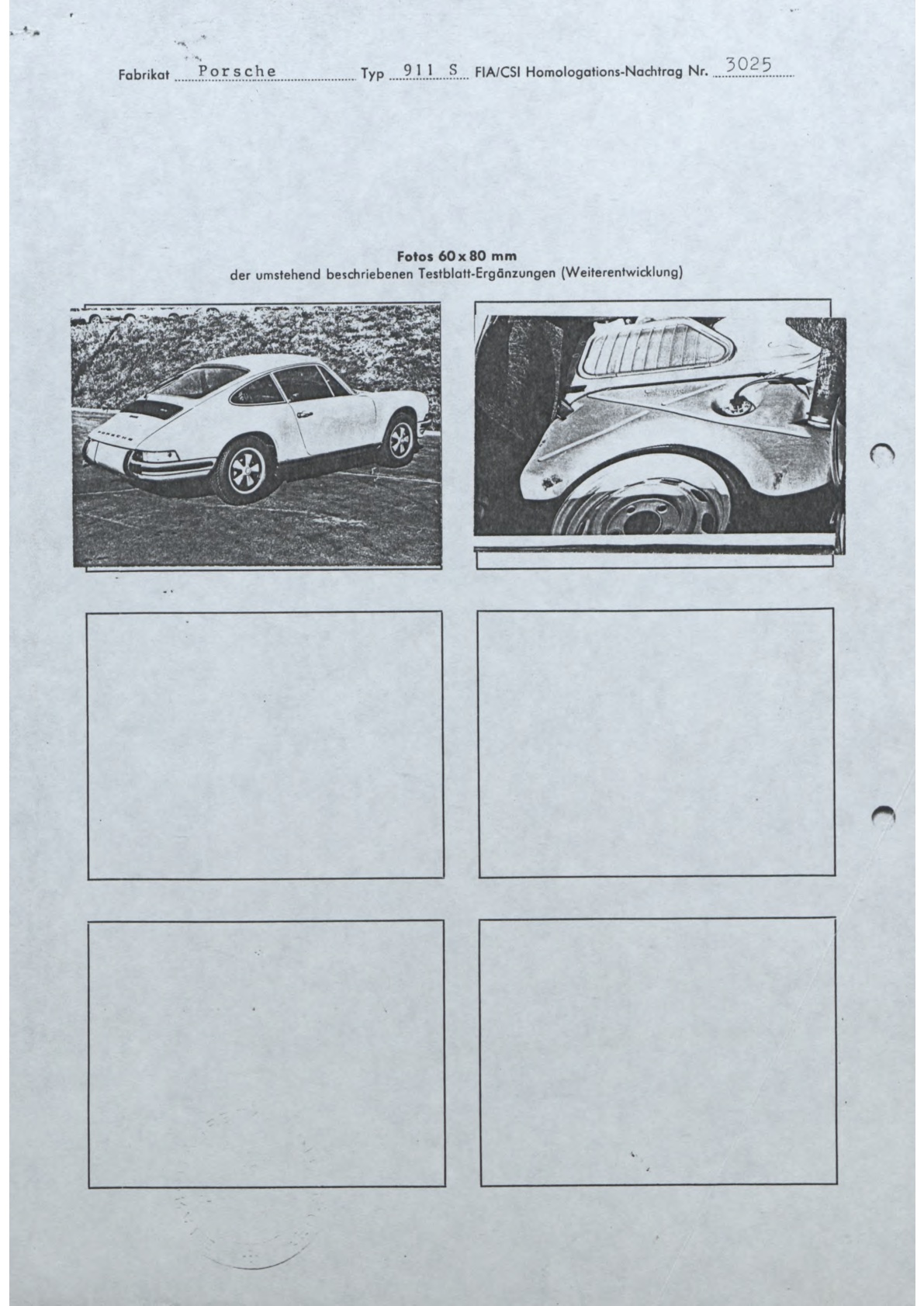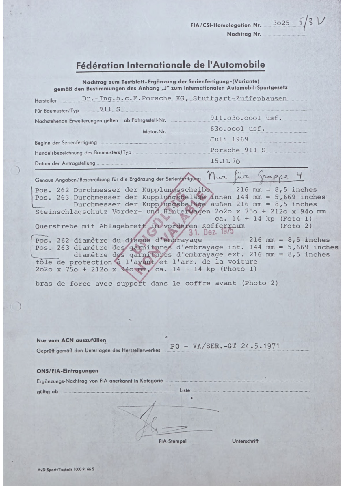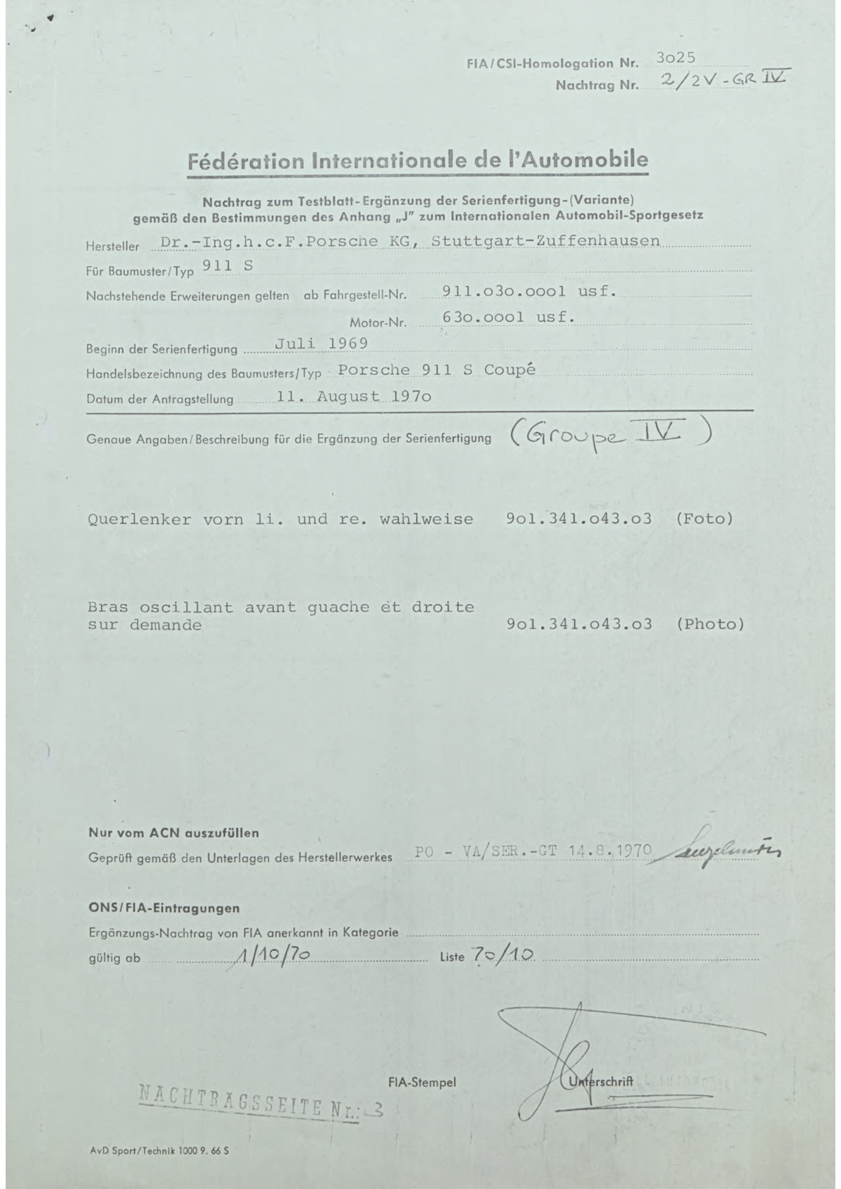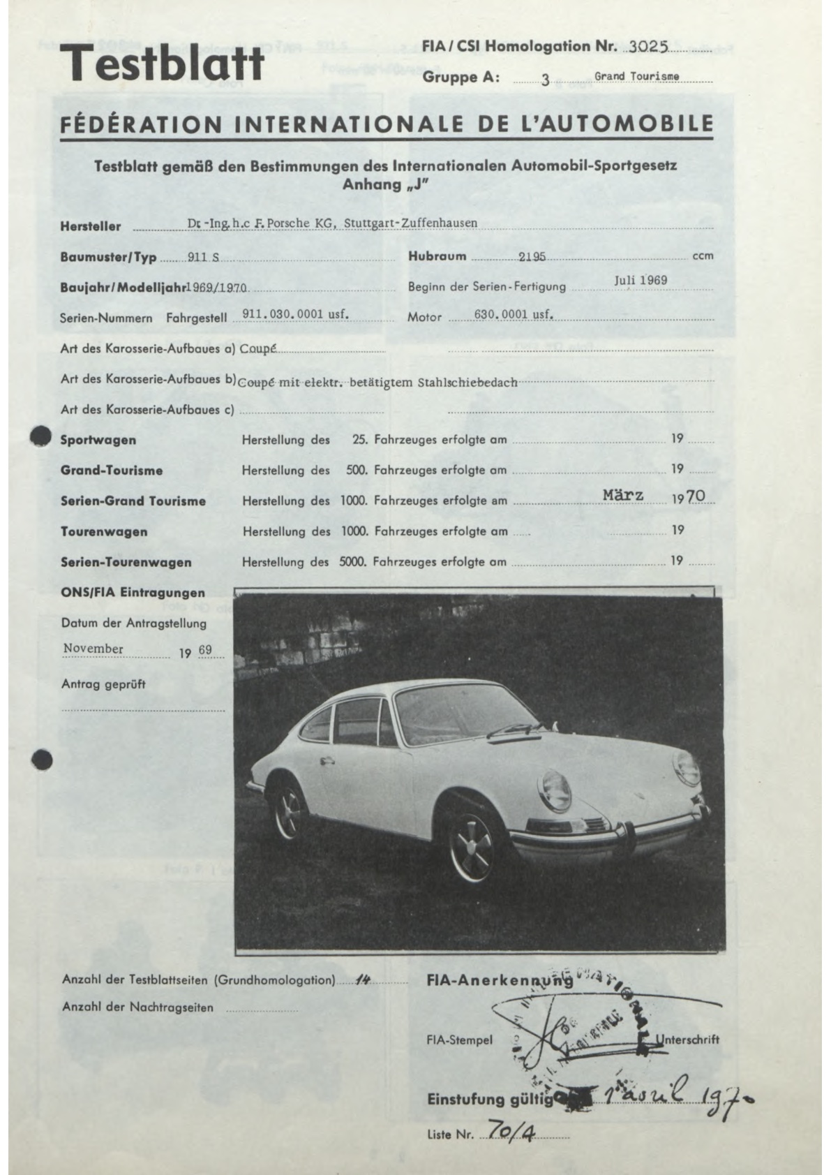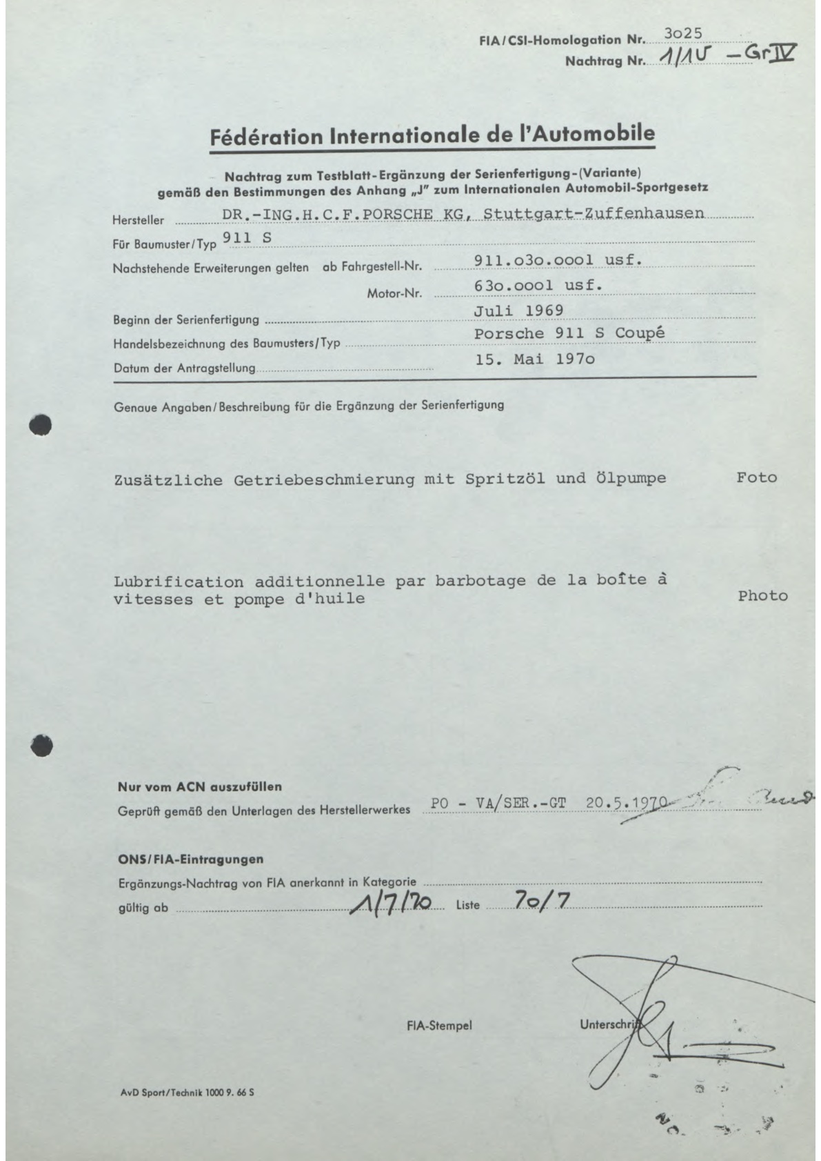 FIA Homologation Protocol for Porsche-911S 2.2 (Group A 3GT) with additions 911S 2.5 for Group 4, 1969
