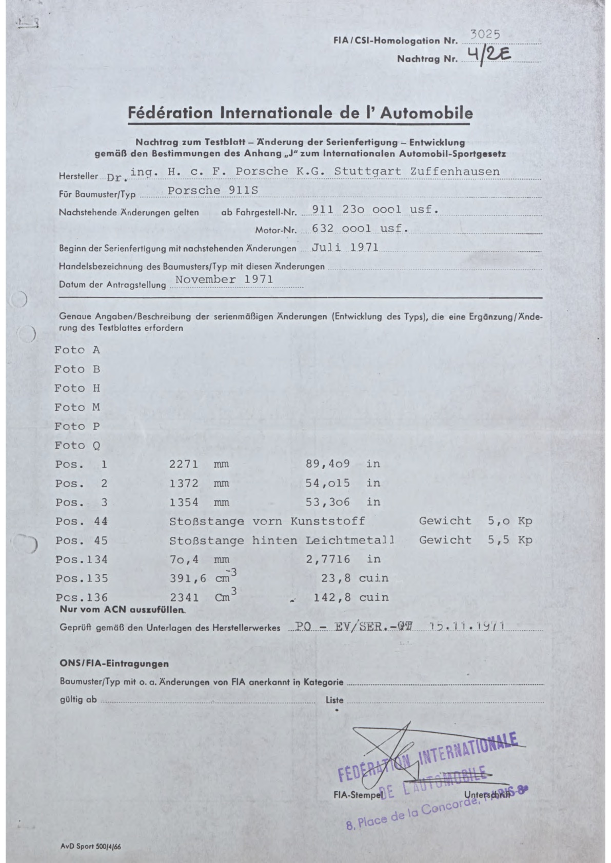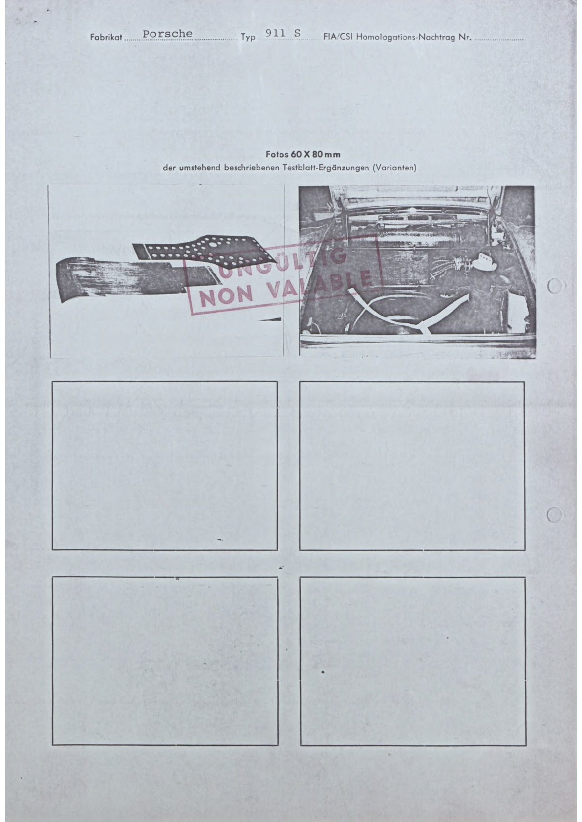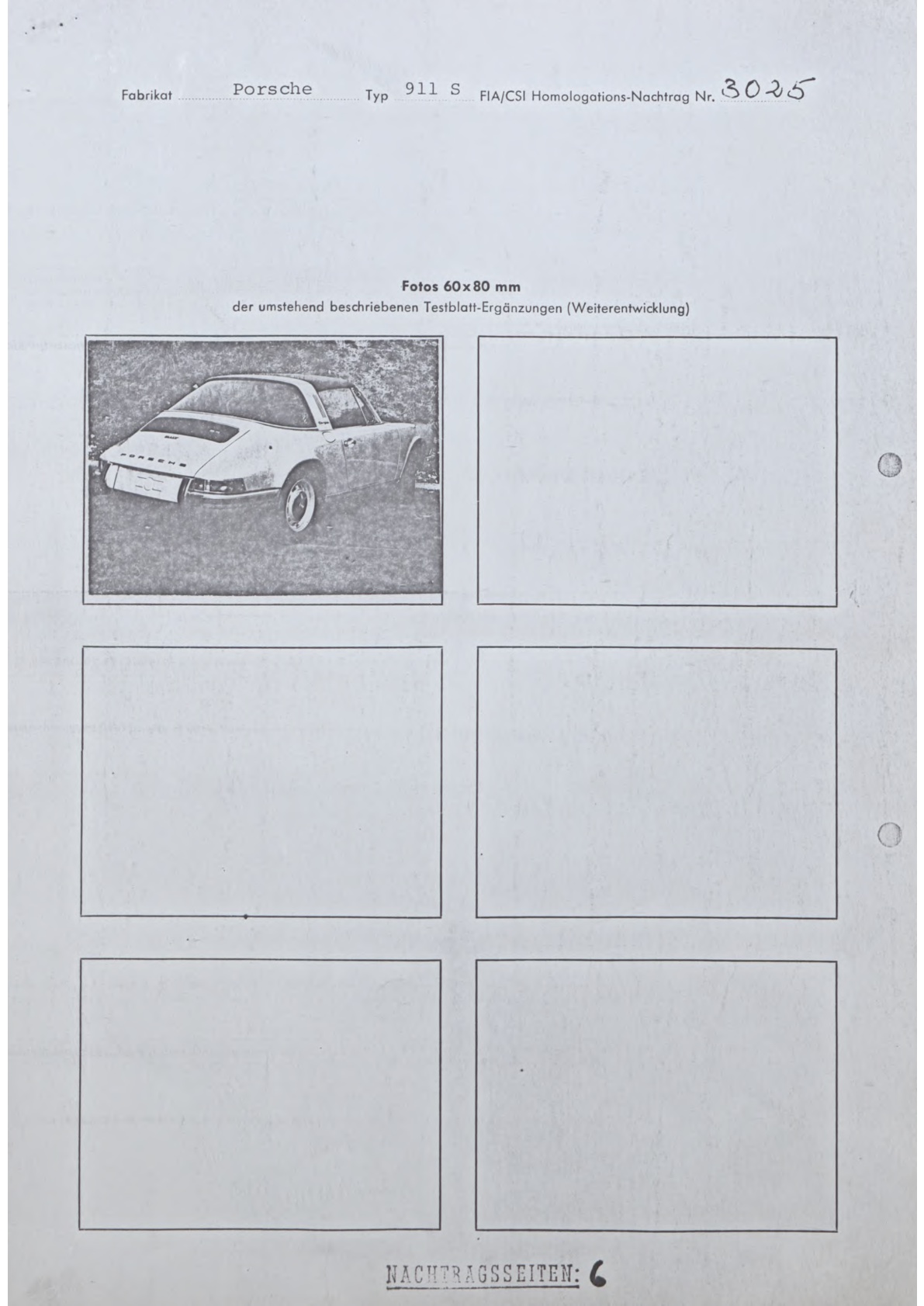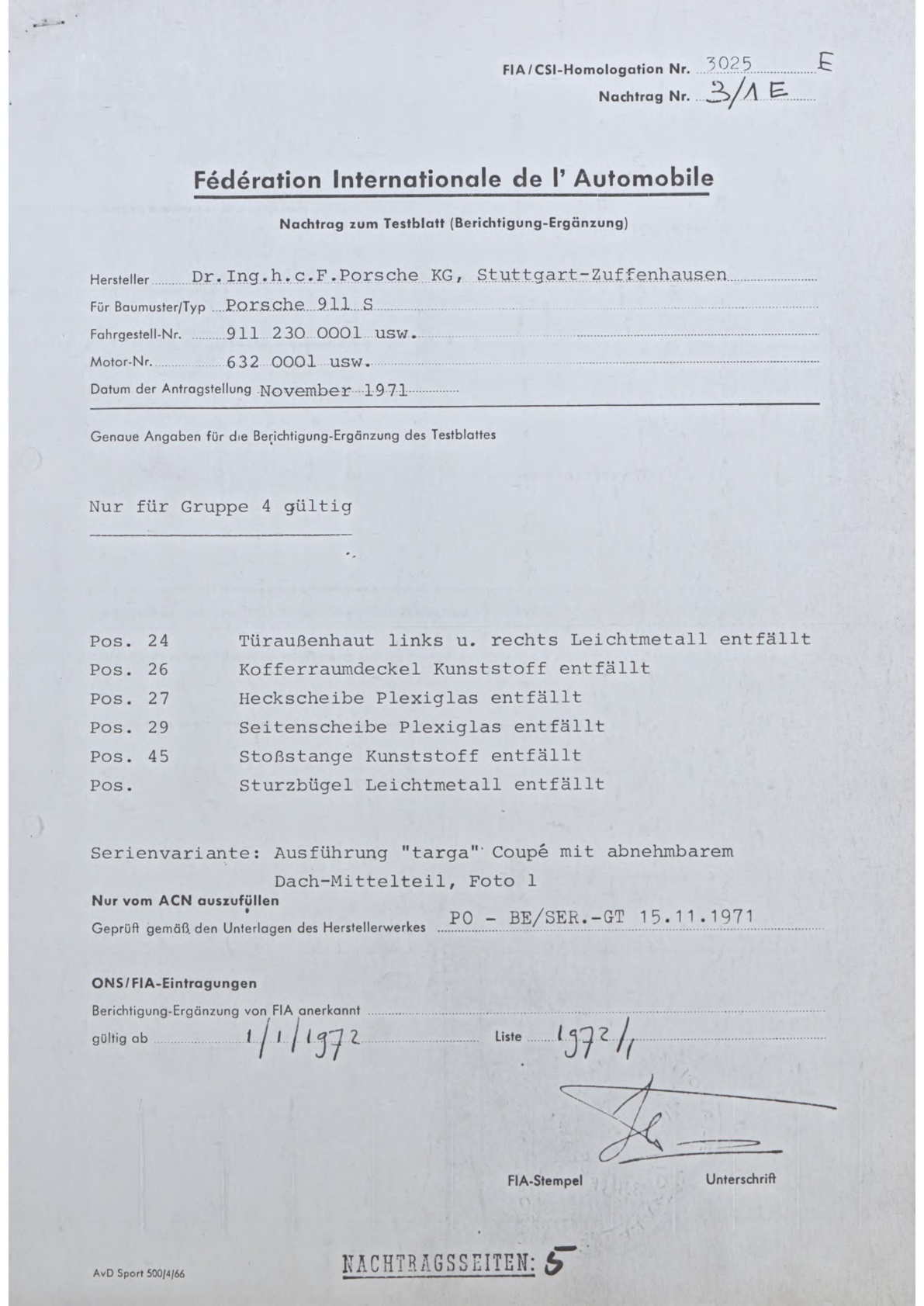 FIA Homologation Protocol for Porsche-911S 2.2 (Group A 3GT) with additions 911S 2.5 for Group 4, 1969