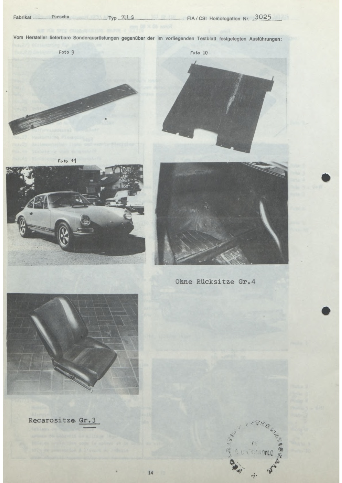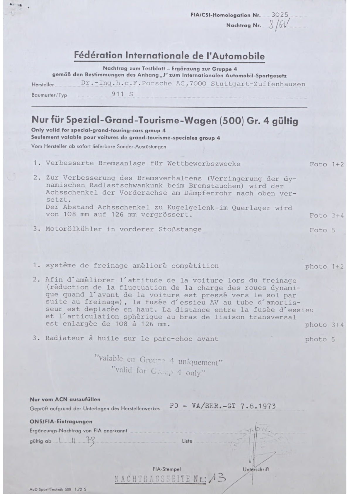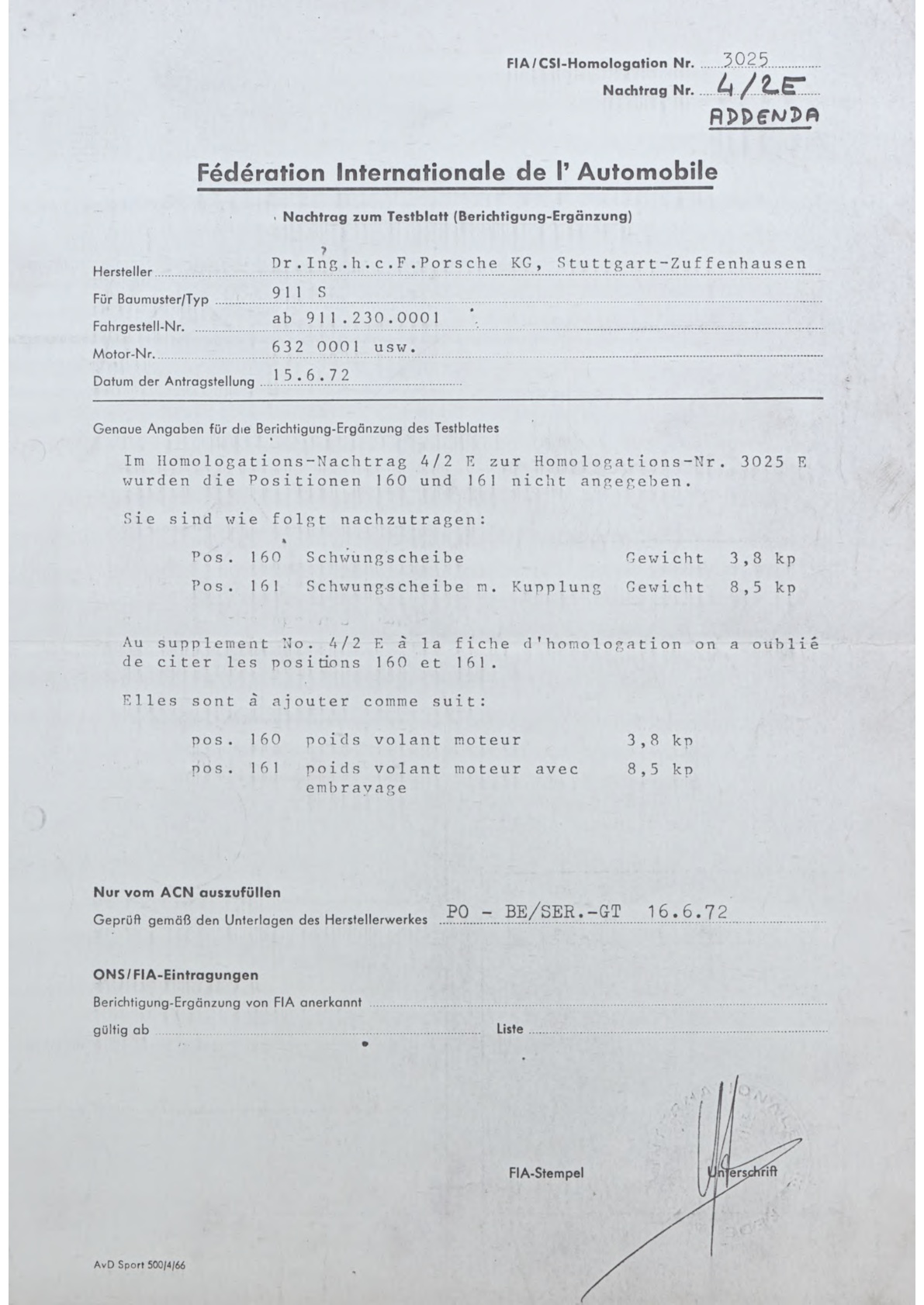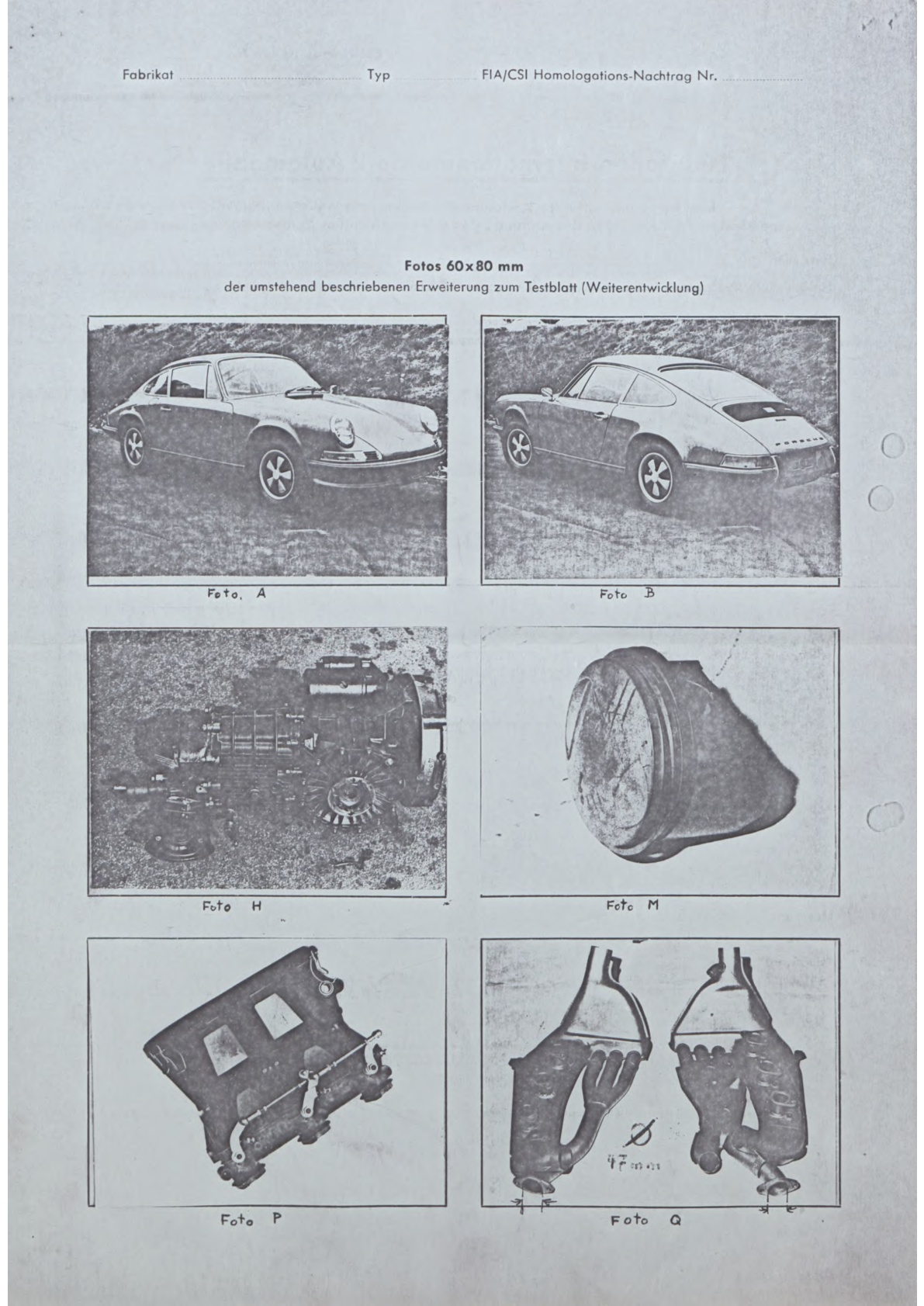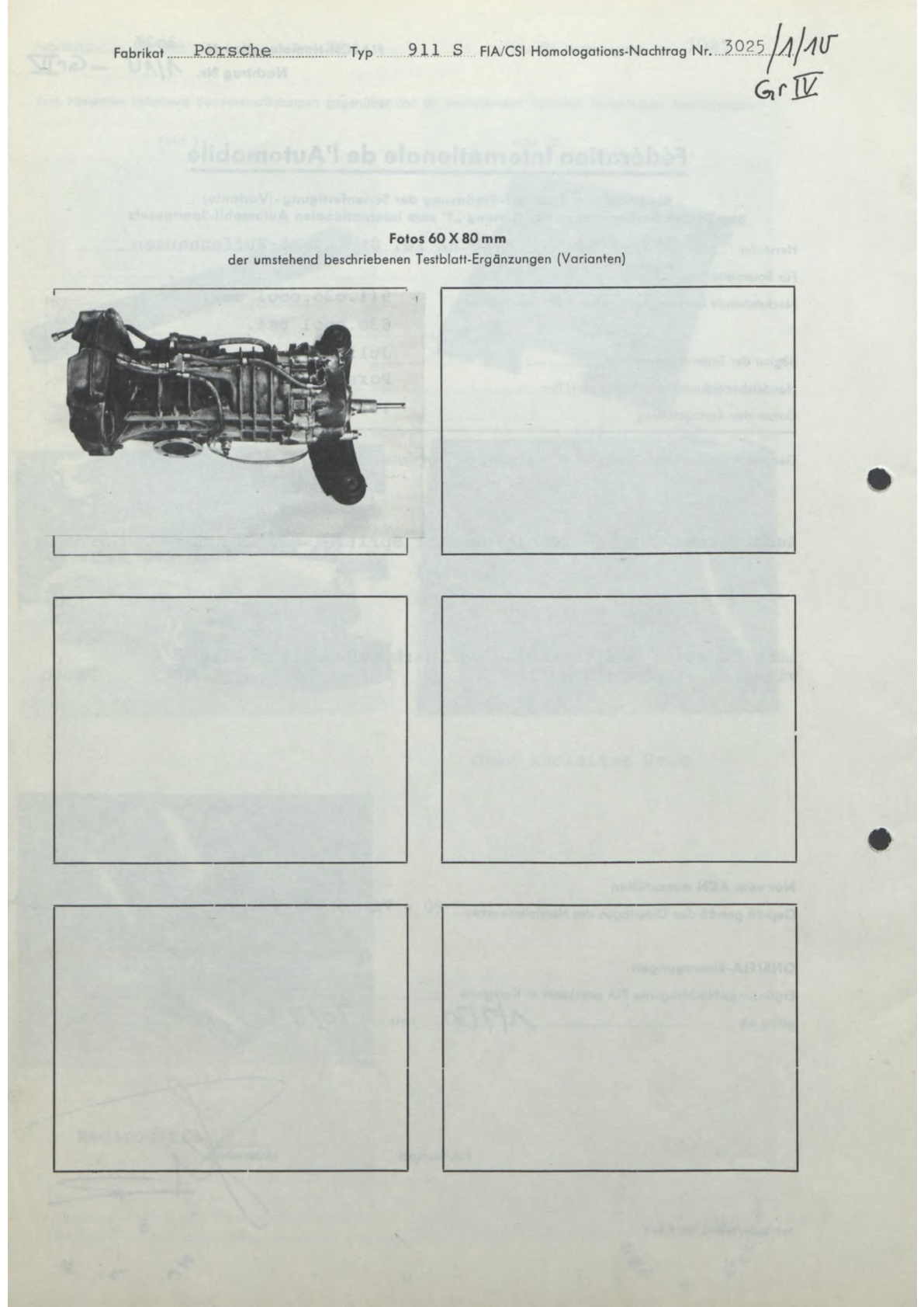 FIA Homologation Protocol for Porsche-911S 2.2 (Group A 3GT) with additions 911S 2.5 for Group 4, 1969