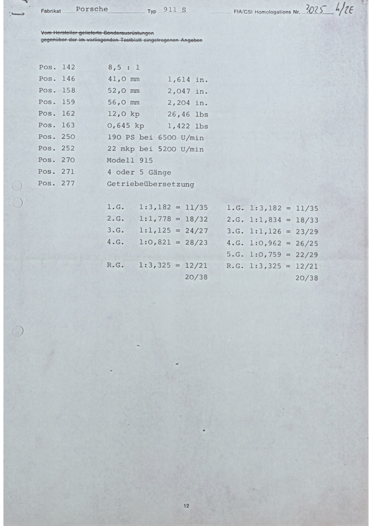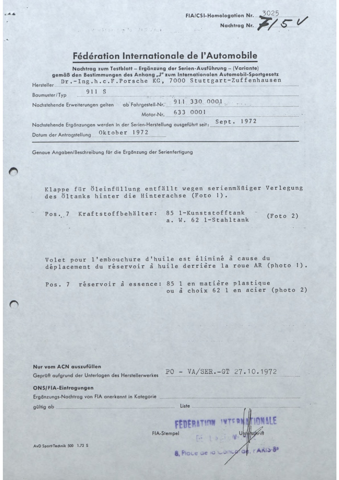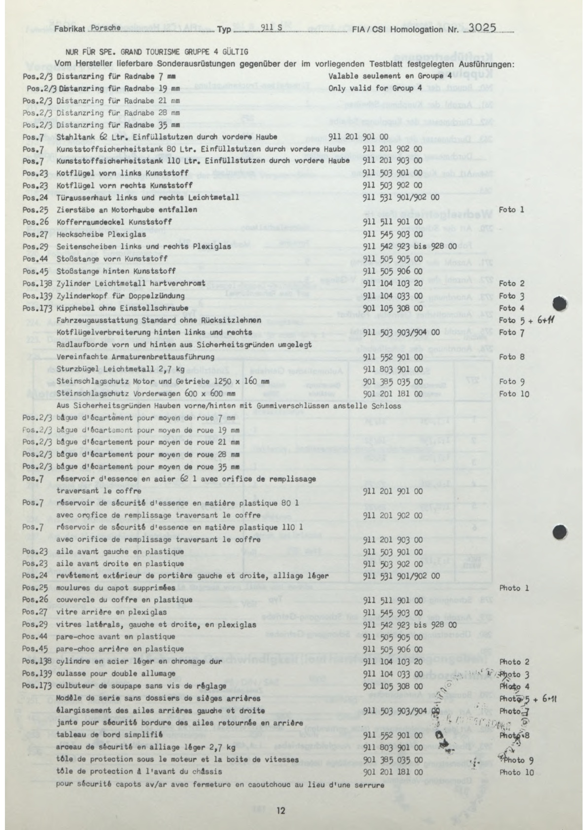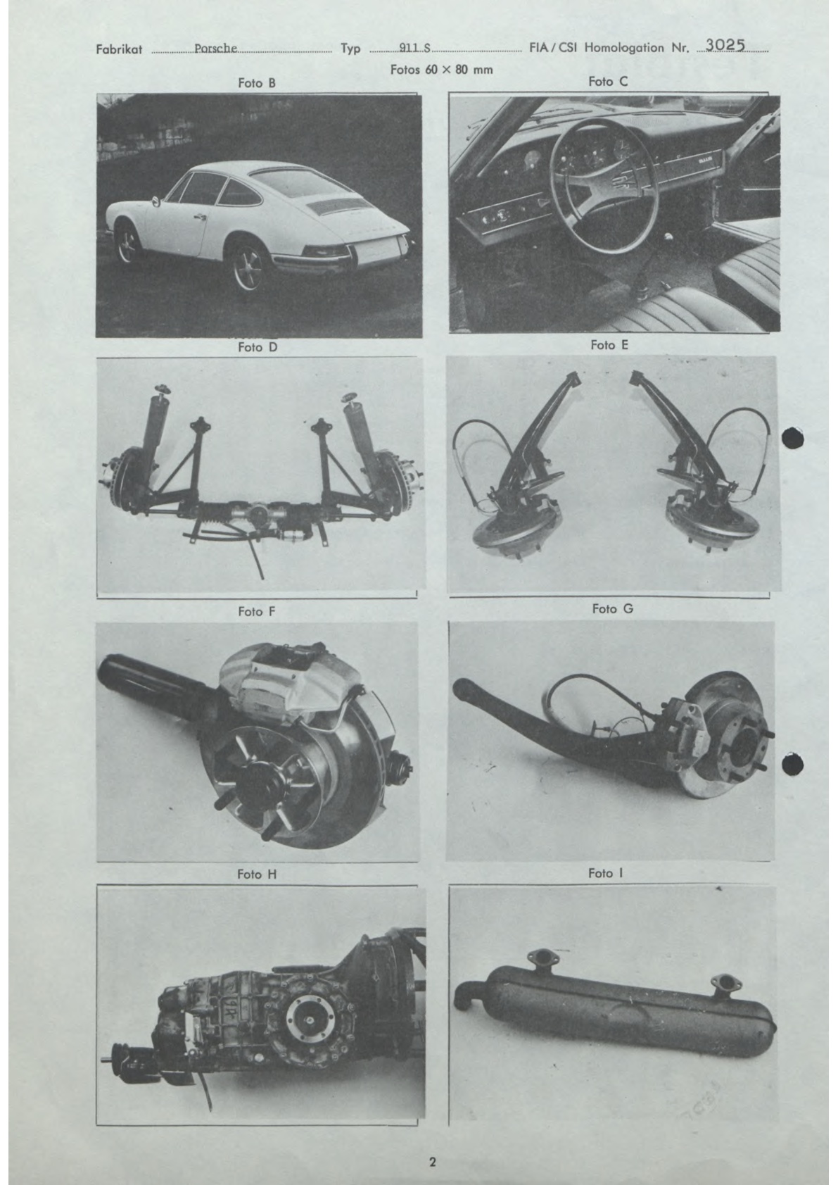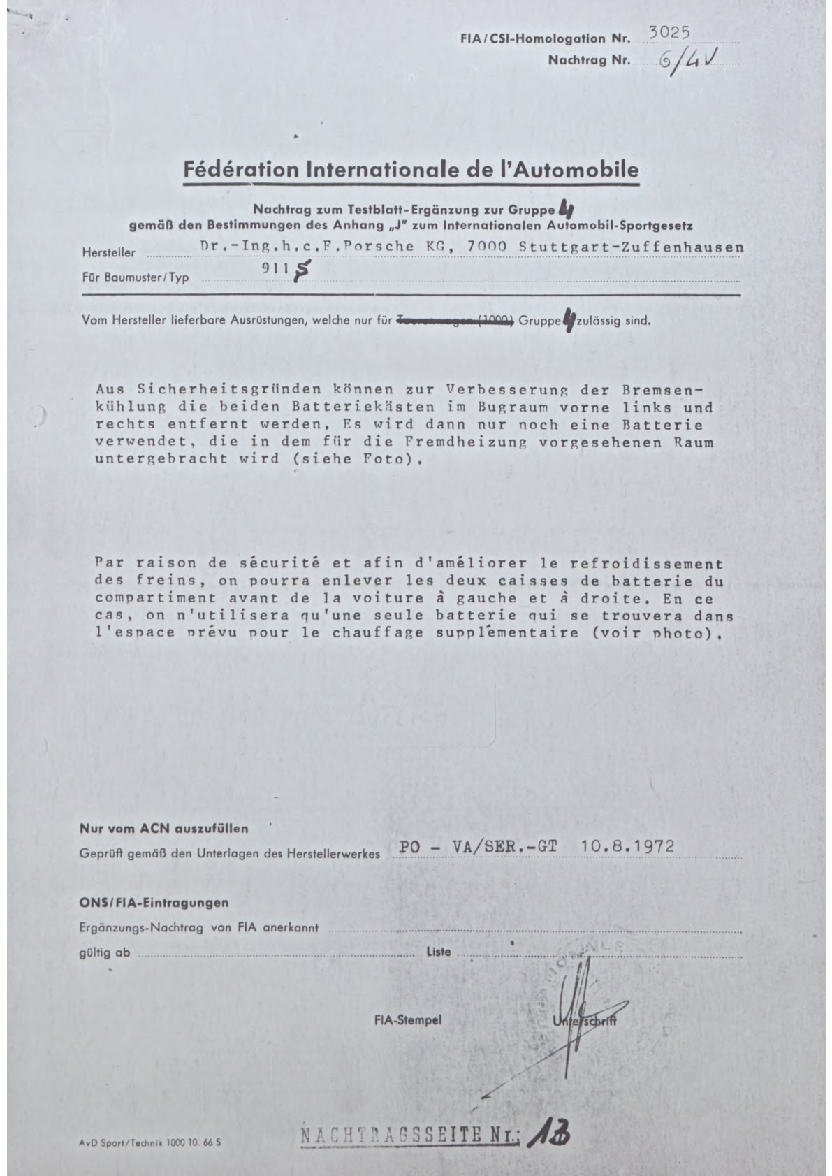 FIA Homologation Protocol for Porsche-911S 2.2 (Group A 3GT) with additions 911S 2.5 for Group 4, 1969